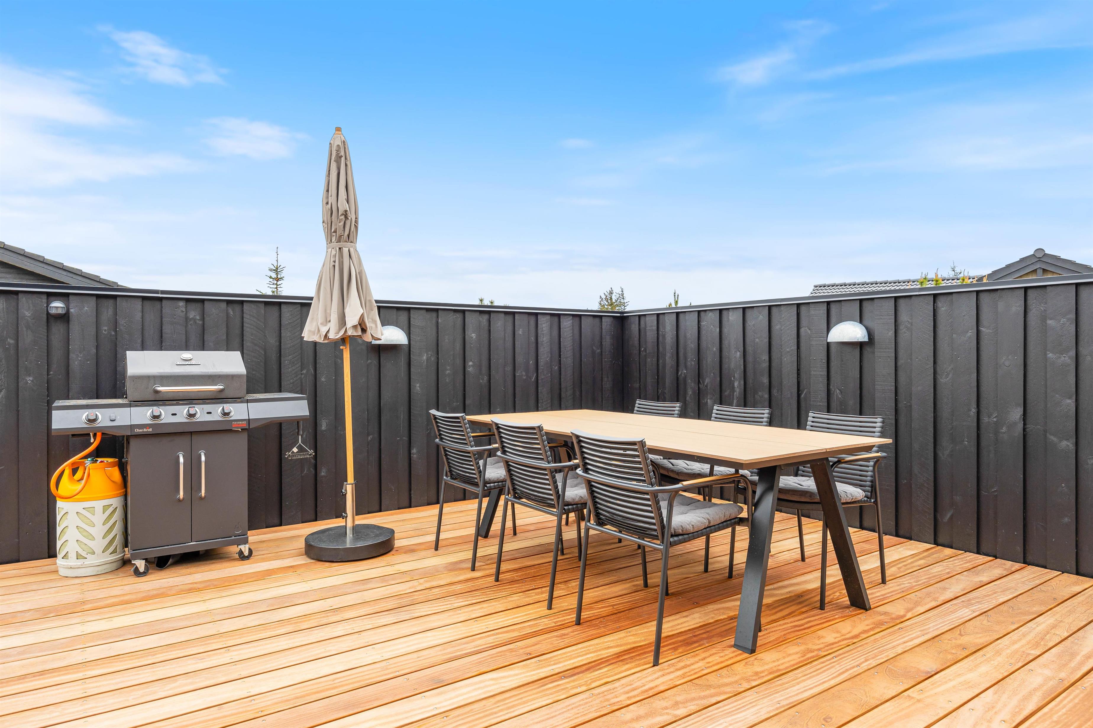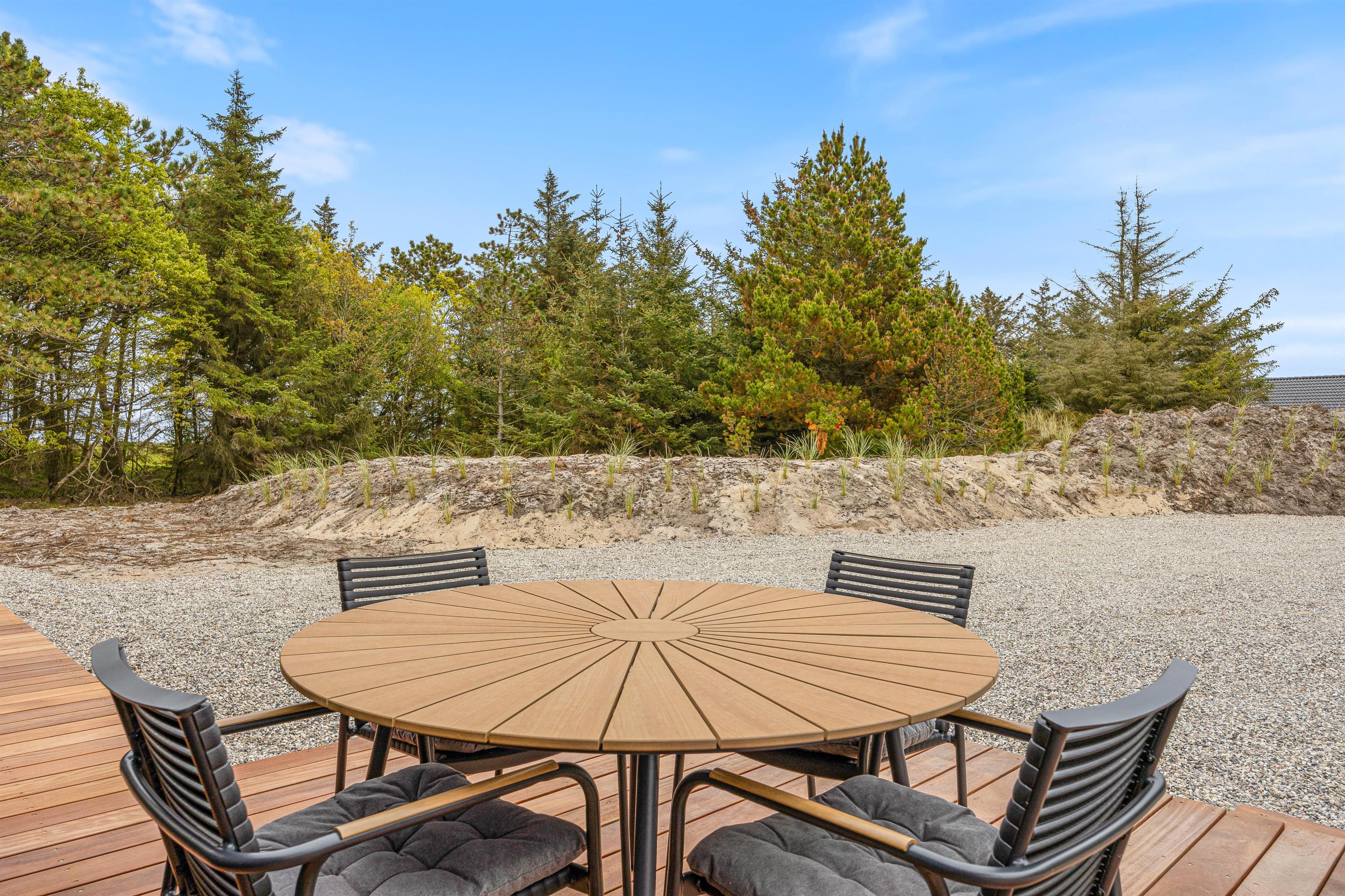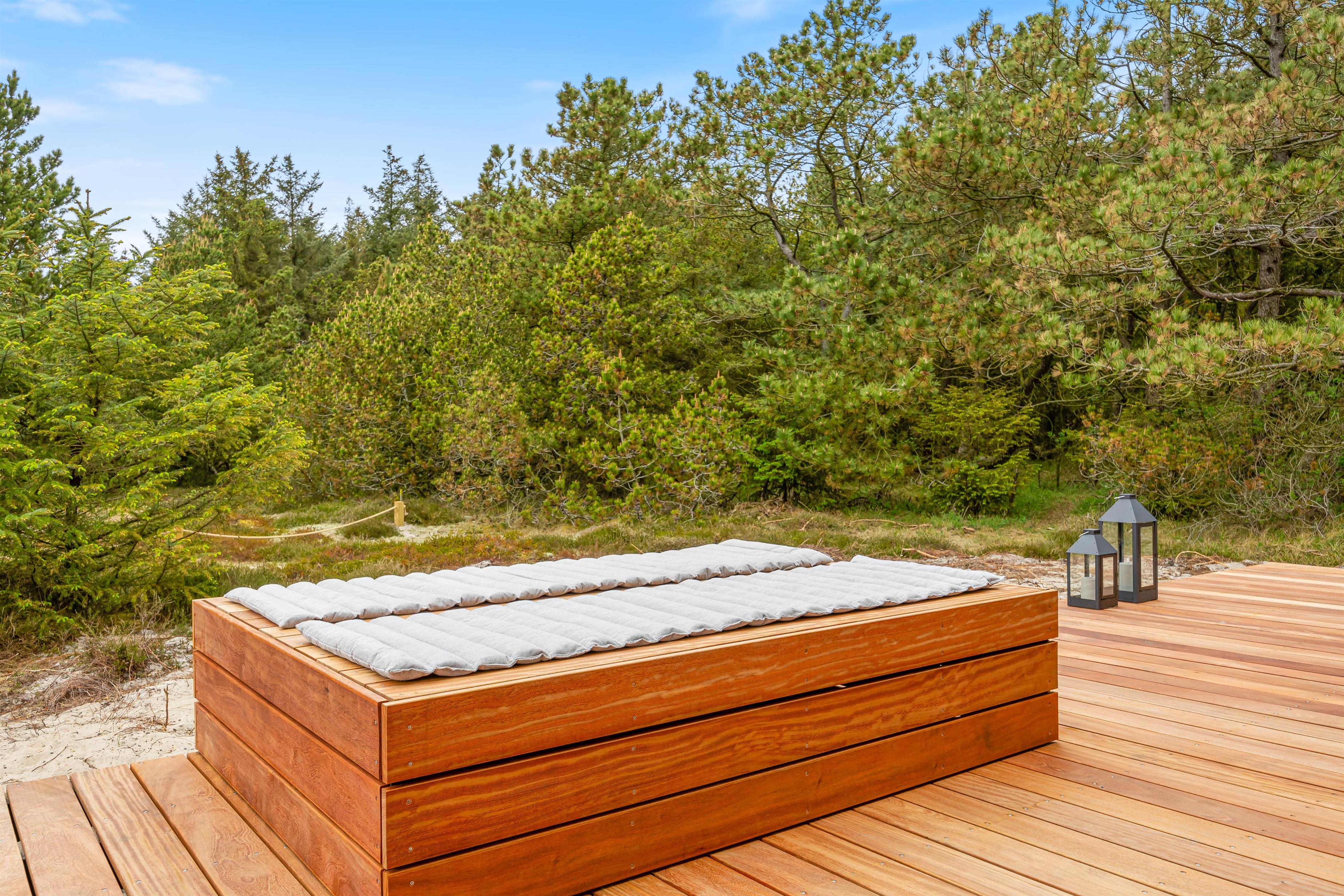 Terrassen ved sommerhuset er delvis overdækket og afskærmet, så I kan sidde ude i al slags vejr – måske med morgenkaffen eller et glas vin i hånden. Sommerhuset ligger på en stor naturgrund, hvor der er god plads til både leg og afslapning, og I har masser af privatliv omkring jer.