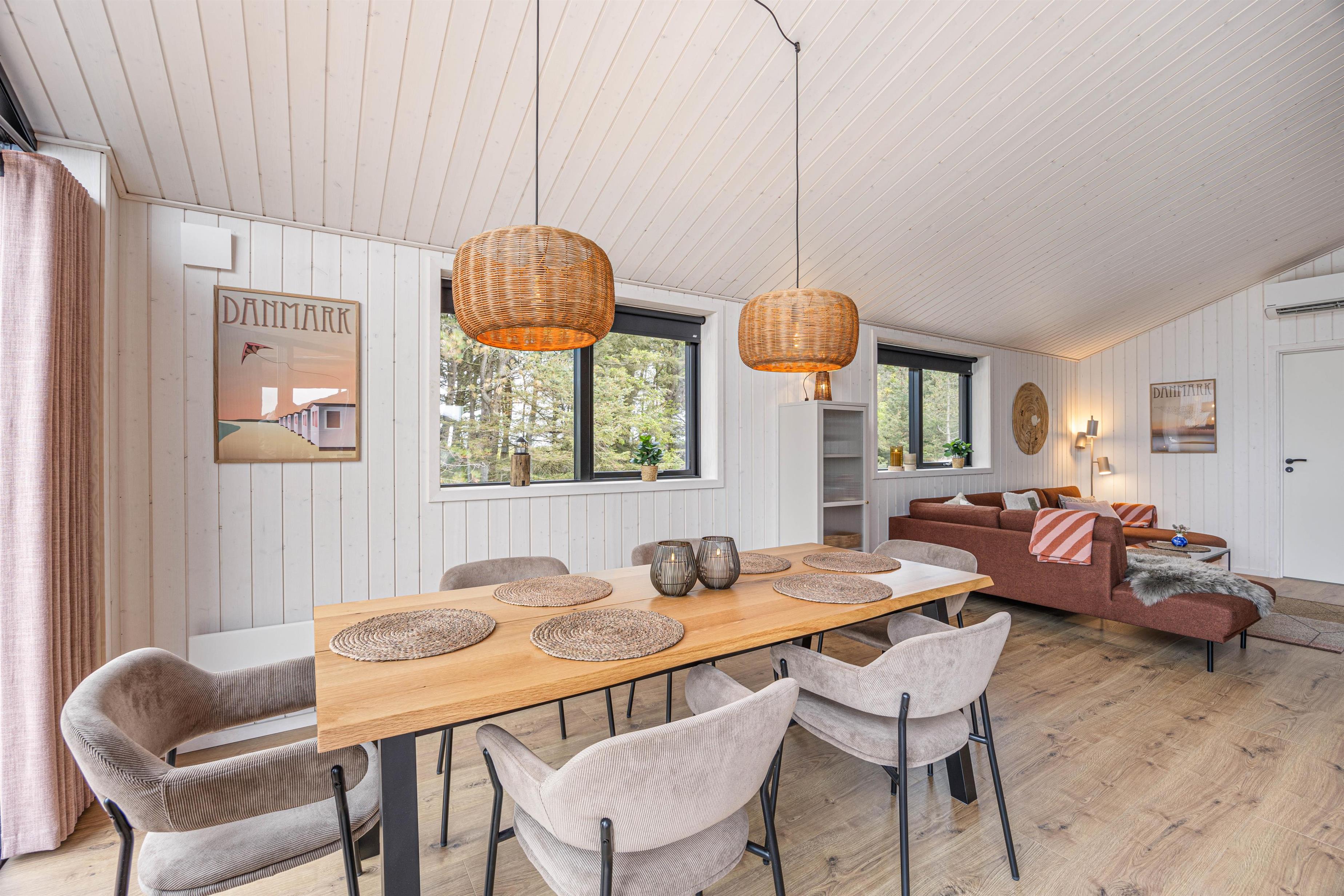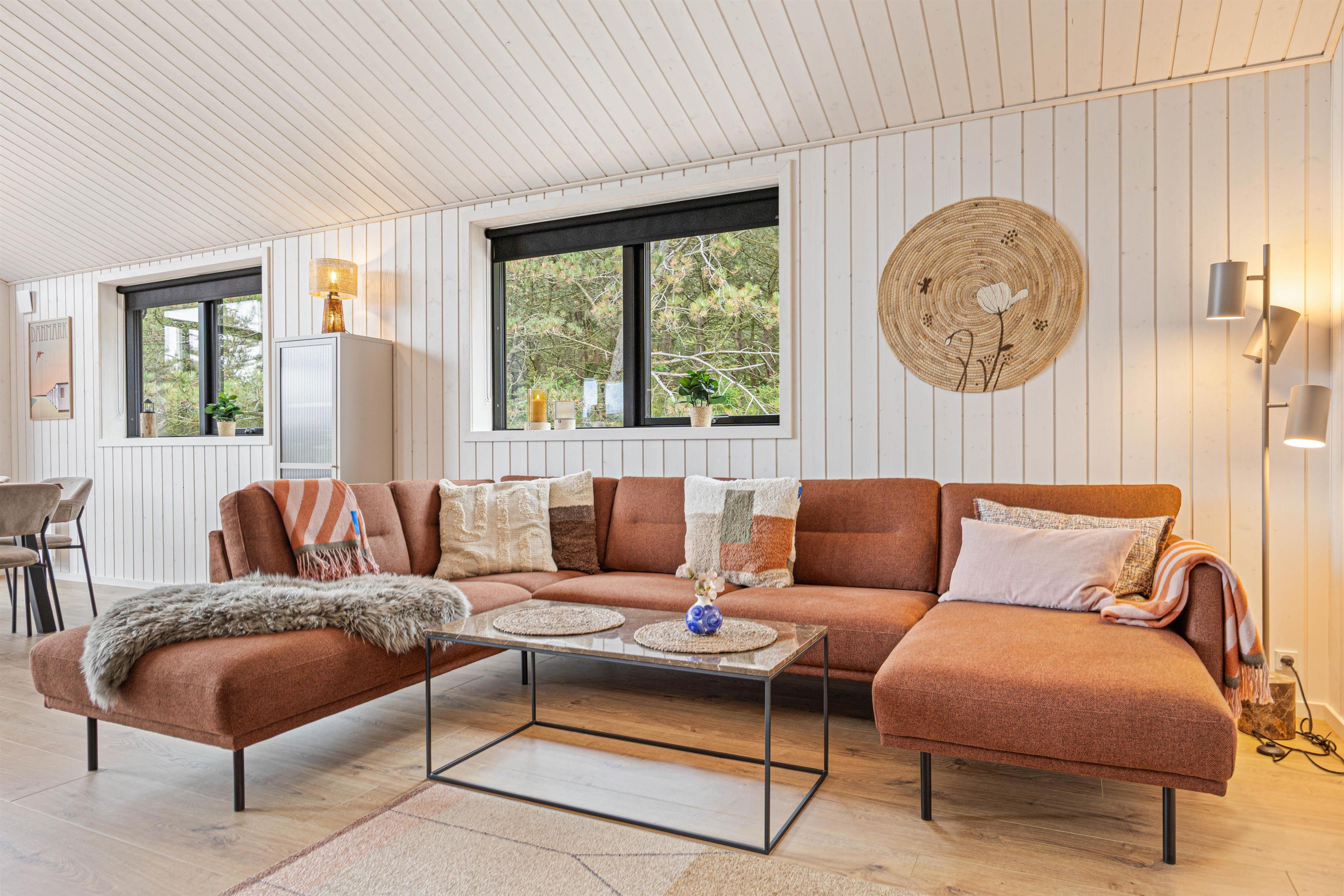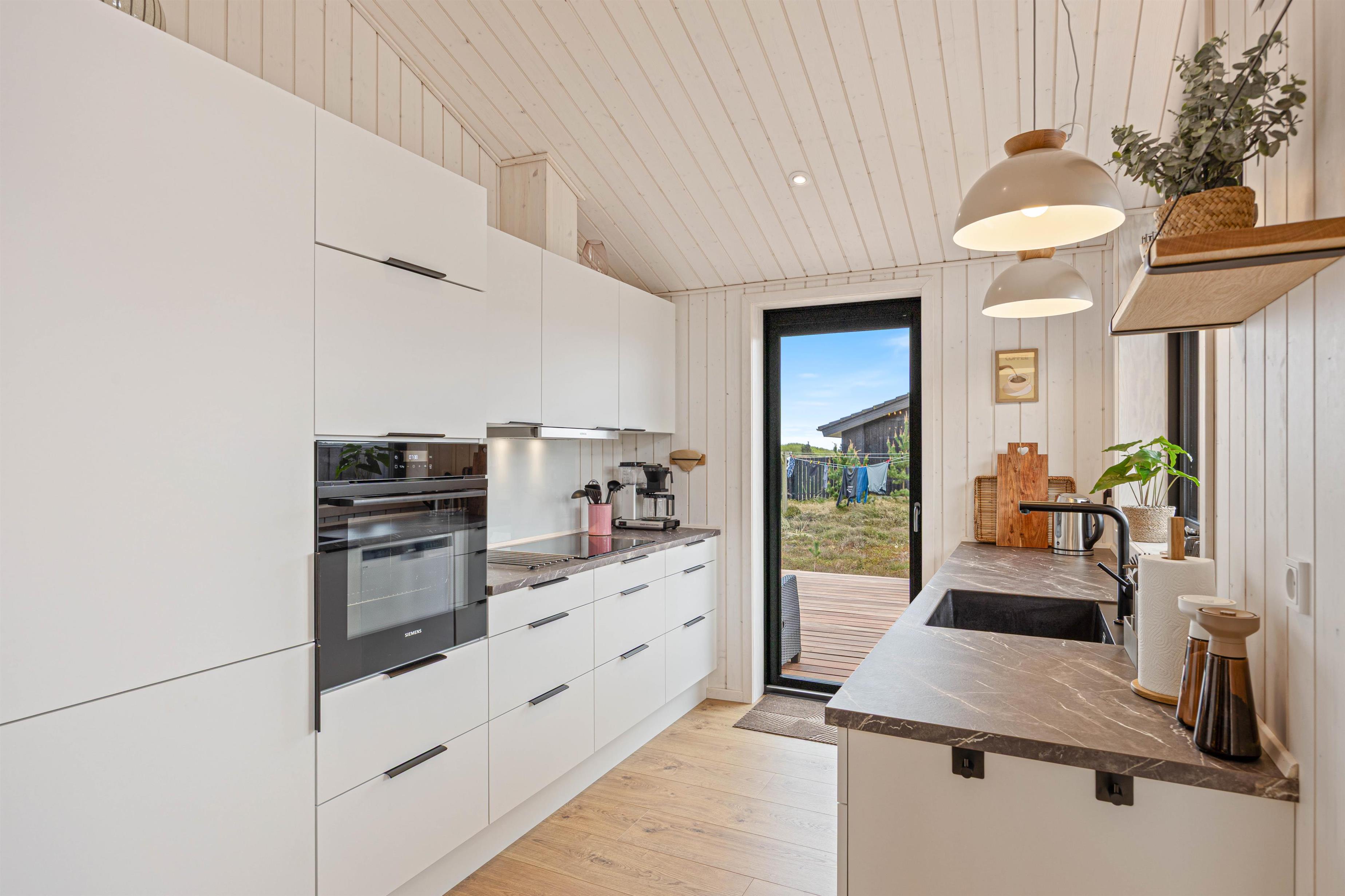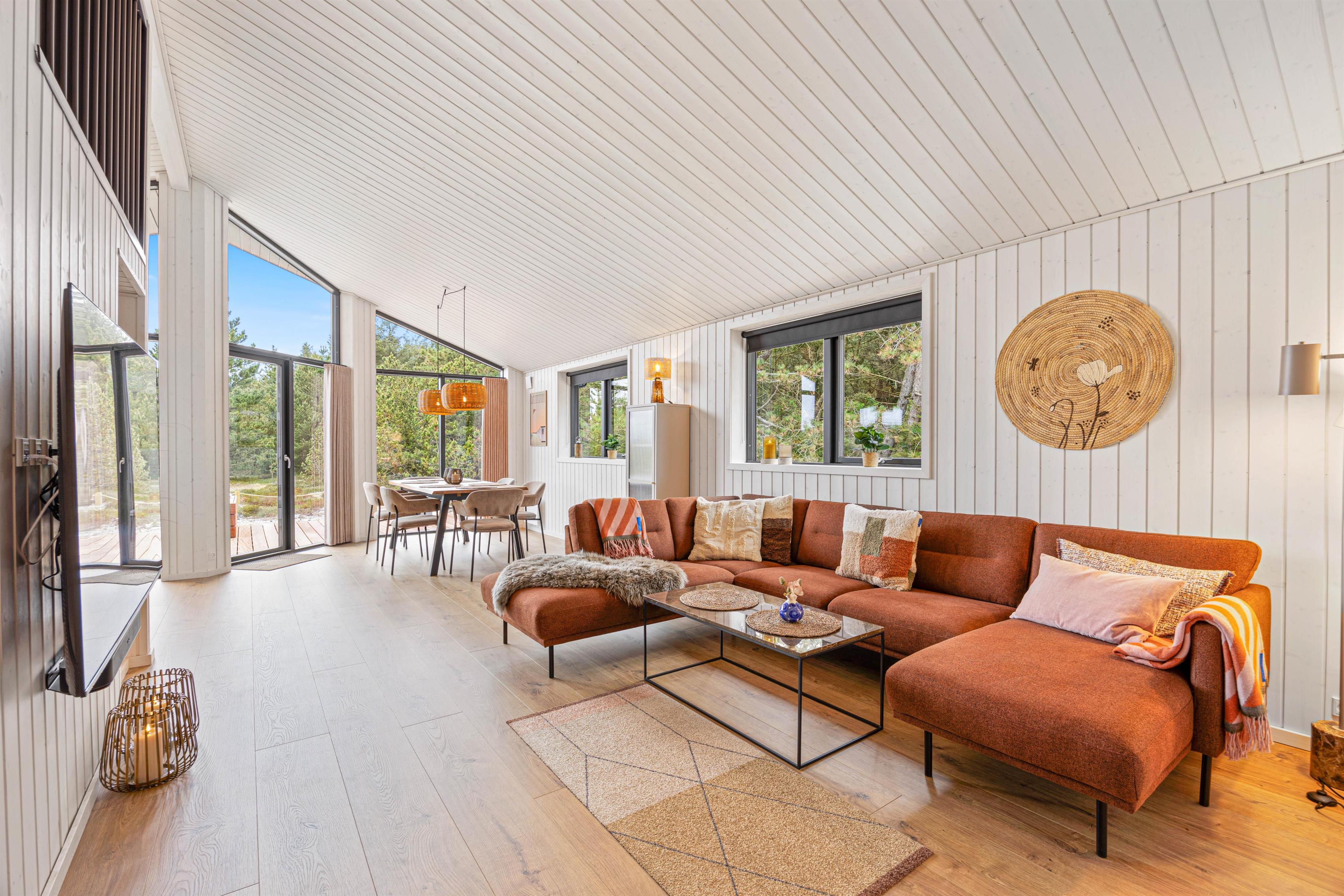 Indretningen er præget af skandinavisk stil med lyse farver og et dejligt lysindfald. Den åbne stue med store vinduer er sommerhusets naturlige samlingspunkt, hvor du kan slappe af i sofahjørnet med en god bog eller nyde måltiderne ved spisebordet. Køkkenet er fuldt udstyret og gør det nemt at klare feriens madlavning – og opvaskemaskinen hjælper gerne bagefter.