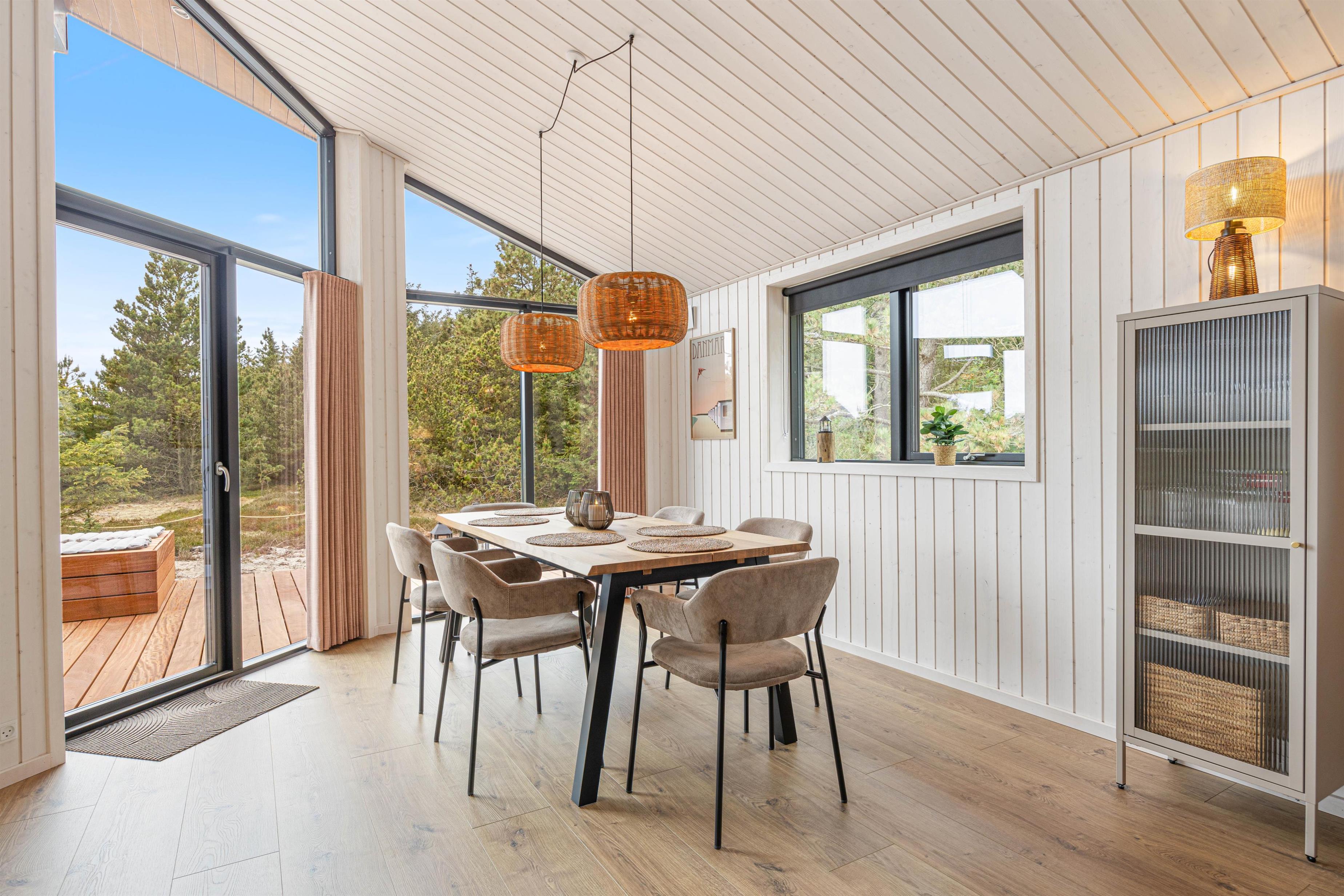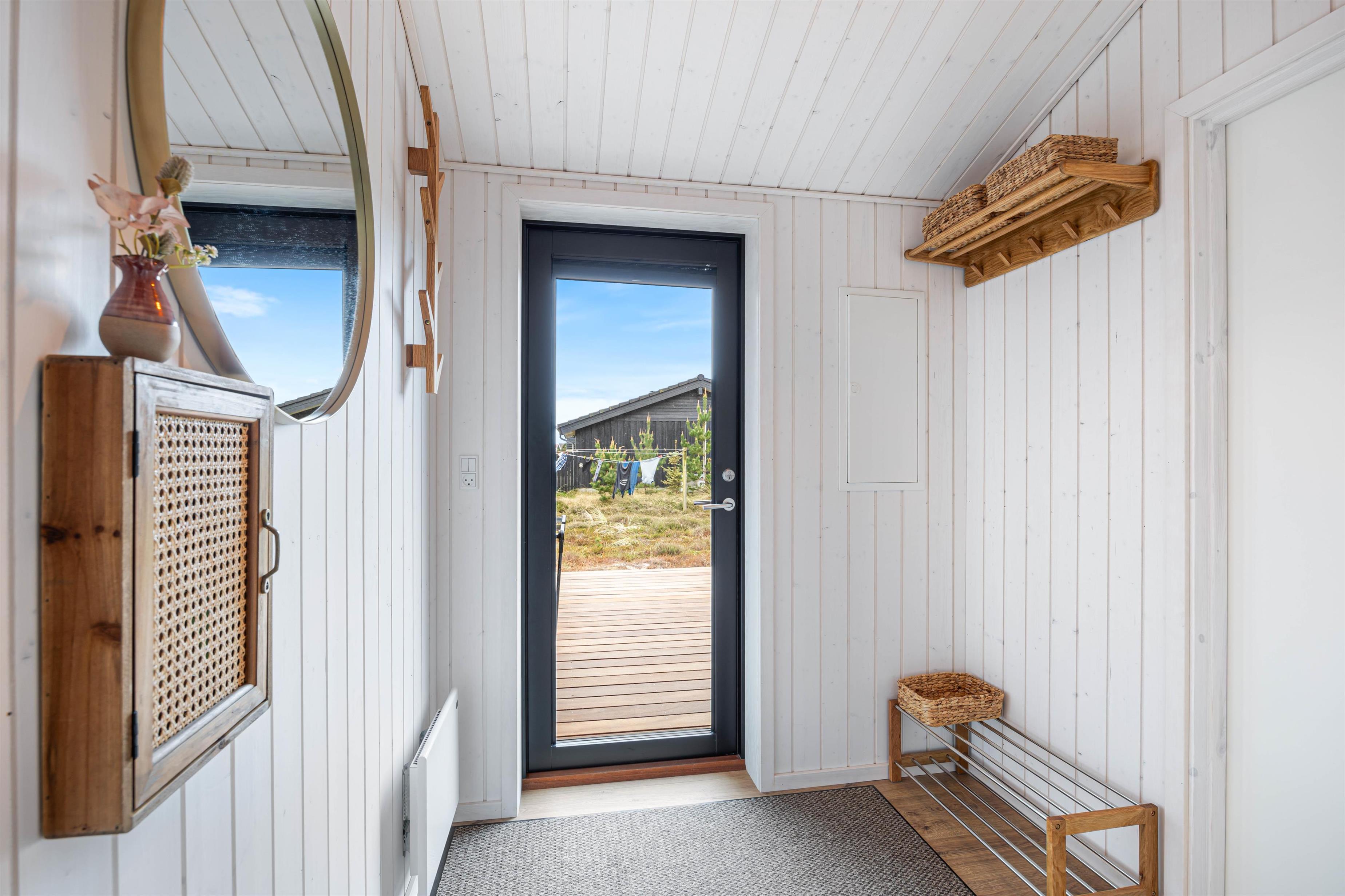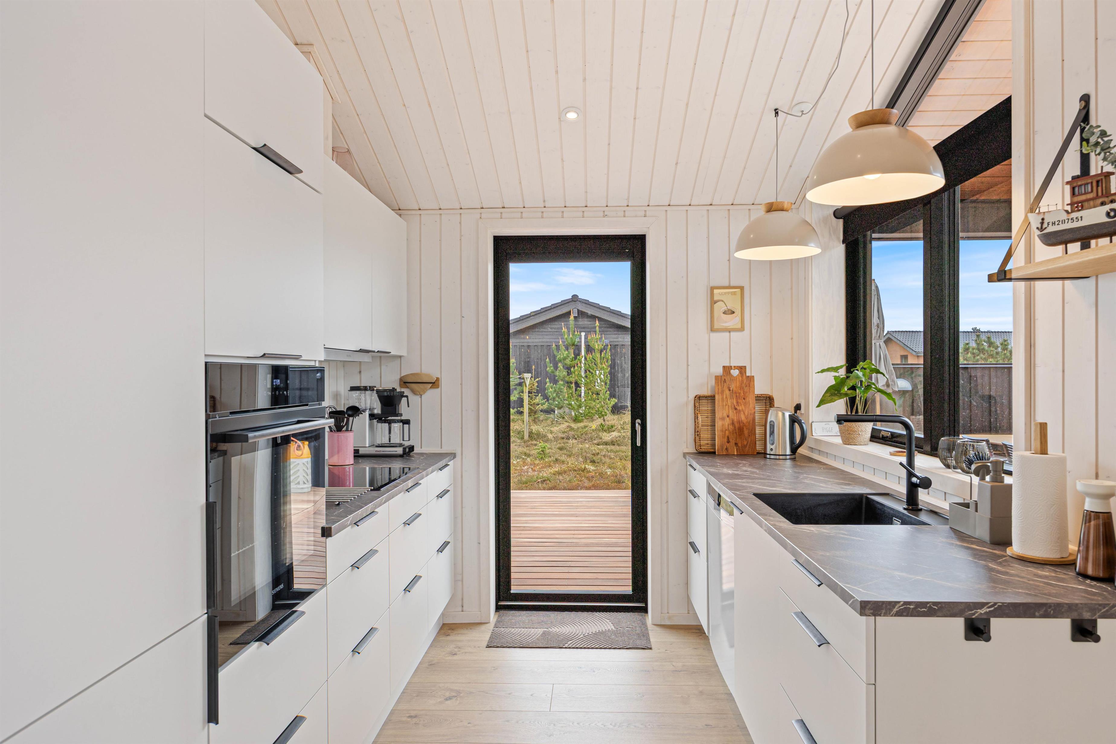 Indretningen er præget af skandinavisk stil med lyse farver og et dejligt lysindfald. Den åbne stue med store vinduer er sommerhusets naturlige samlingspunkt, hvor du kan slappe af i sofahjørnet med en god bog eller nyde måltiderne ved spisebordet. Køkkenet er fuldt udstyret og gør det nemt at klare feriens madlavning – og opvaskemaskinen hjælper gerne bagefter.