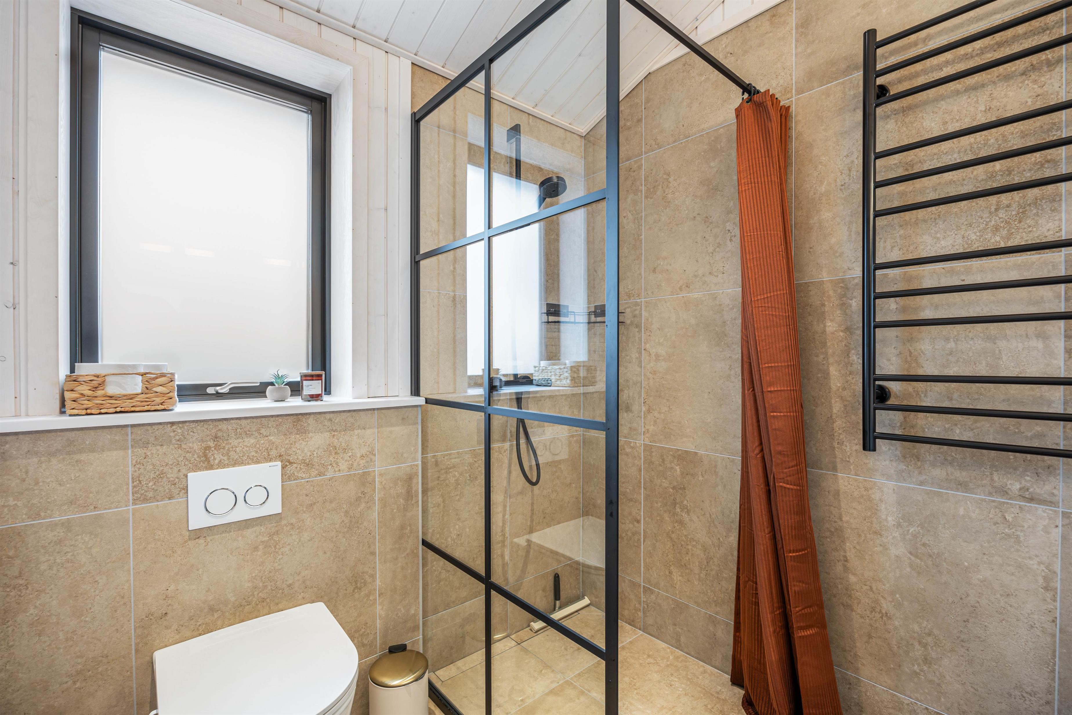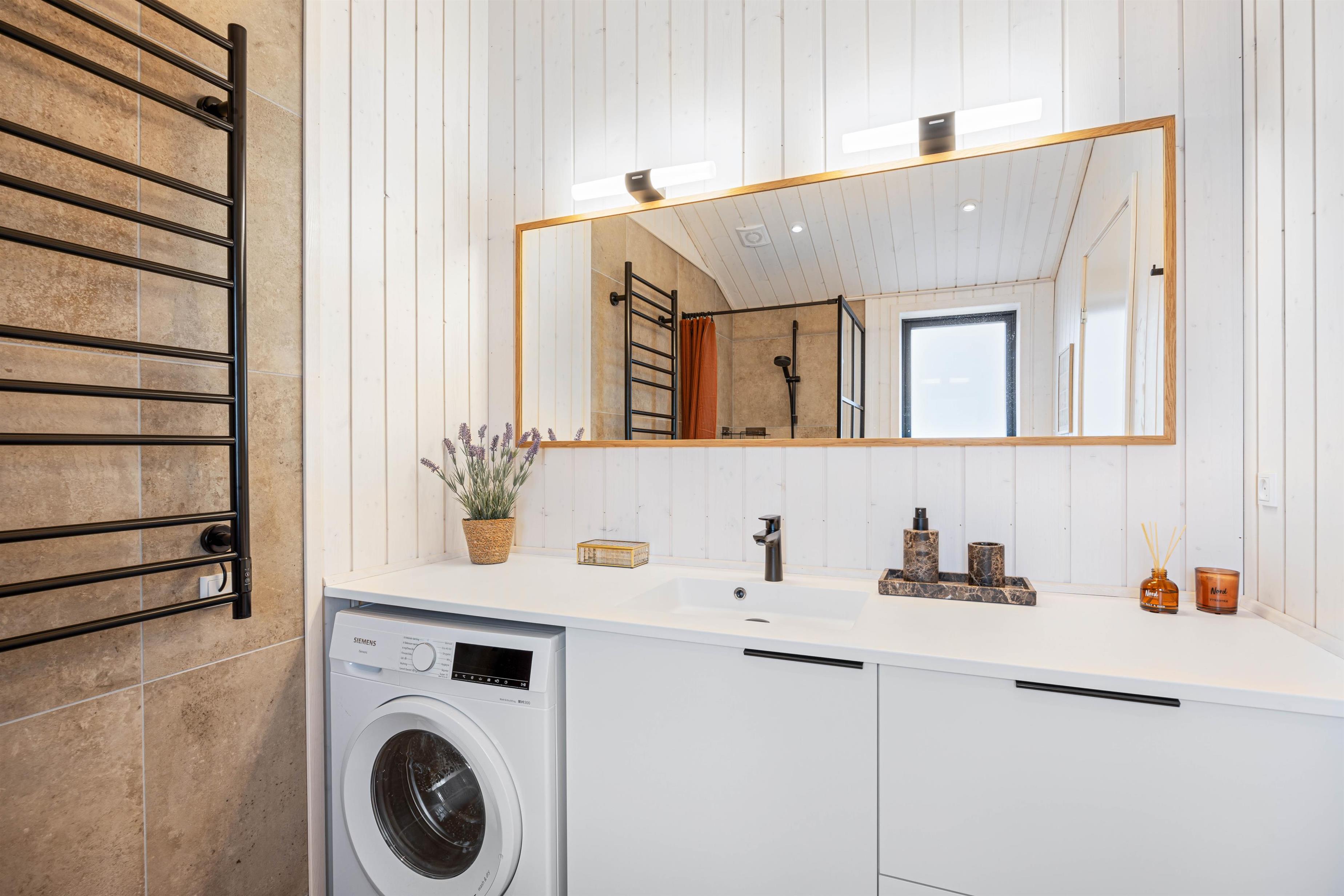 Badeværelset har gulvvarme, som føles ekstra rart om morgenen eller efter en tur ved havet. Desuden er der både vaskemaskine og tørretumbler.