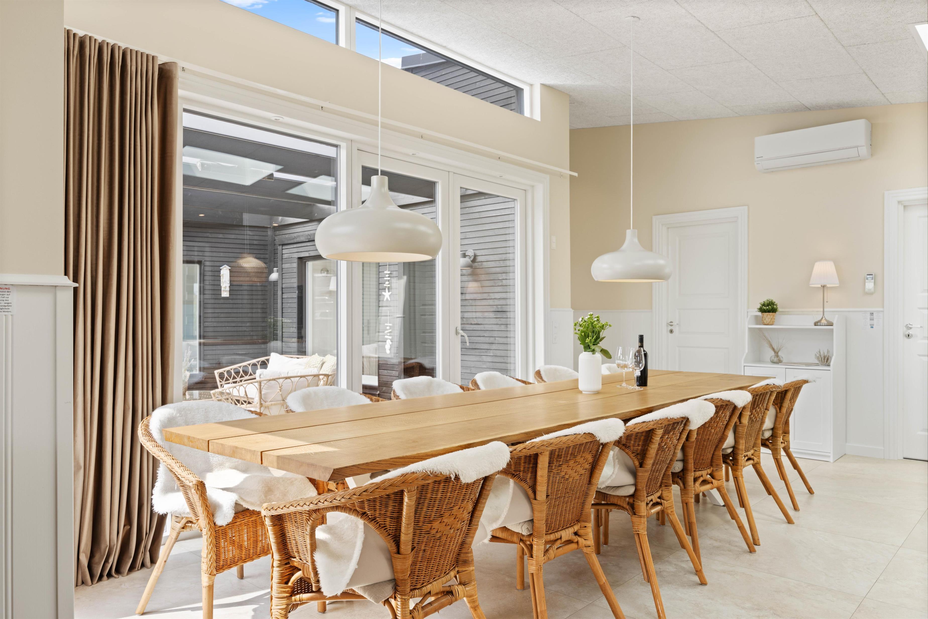 Hvis I drømmer om et sommerhus i Bjerregård med plads til både aktivitet og familiehygge, er Julianevej 162 det oplagte valg. Her er tænkt på både praktiske detaljer og rummelige fællesarealer. Køkken, spiseplads og stue ligger i åben forbindelse og danner en naturlig ramme for samvær og fælles måltider, uanset om I er samlet omkring bordet eller foran brændeovnen. Her kan I også slappe af med danske tv-kanaler eller streame jeres favoritter via Chromecast.