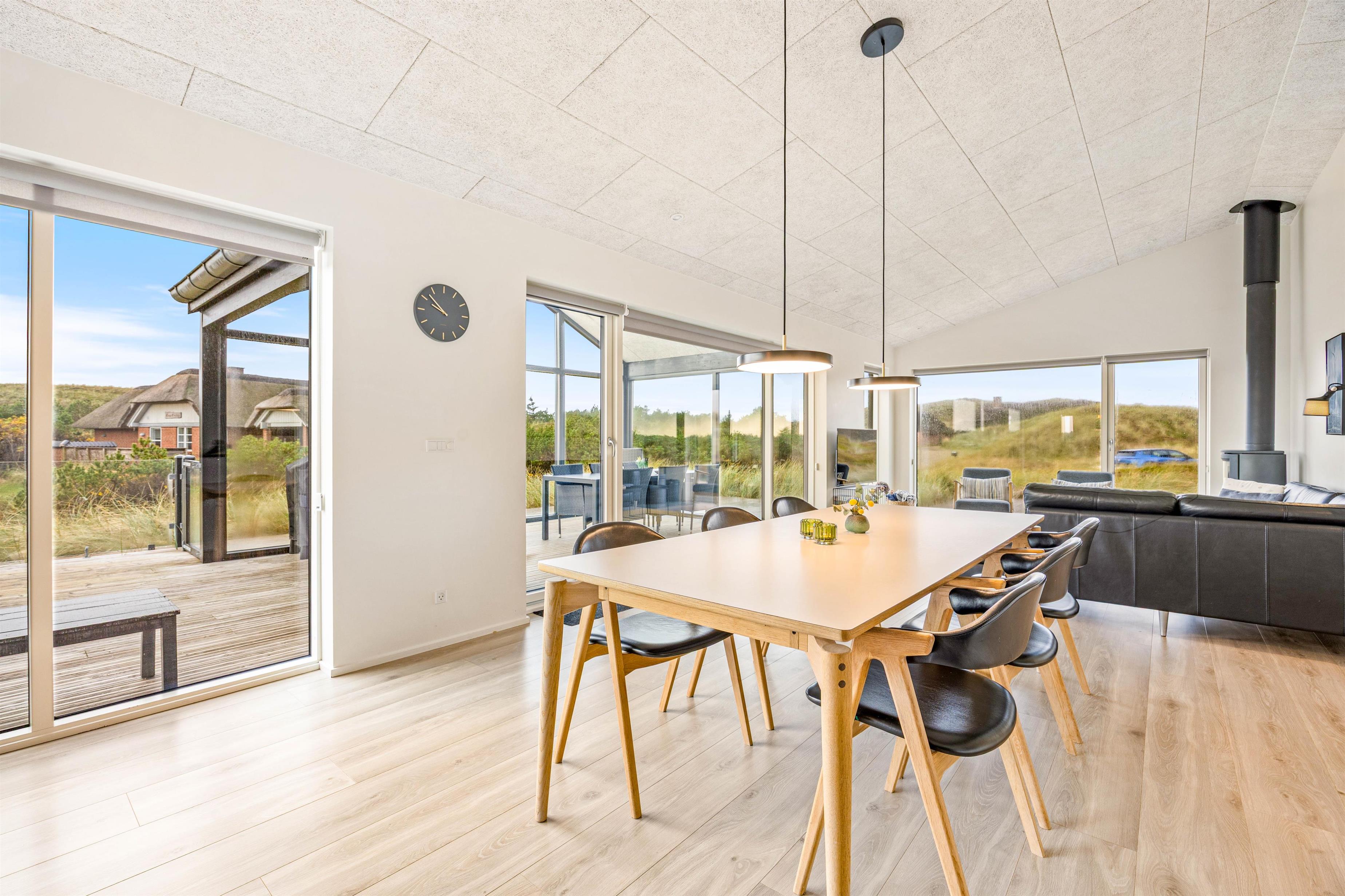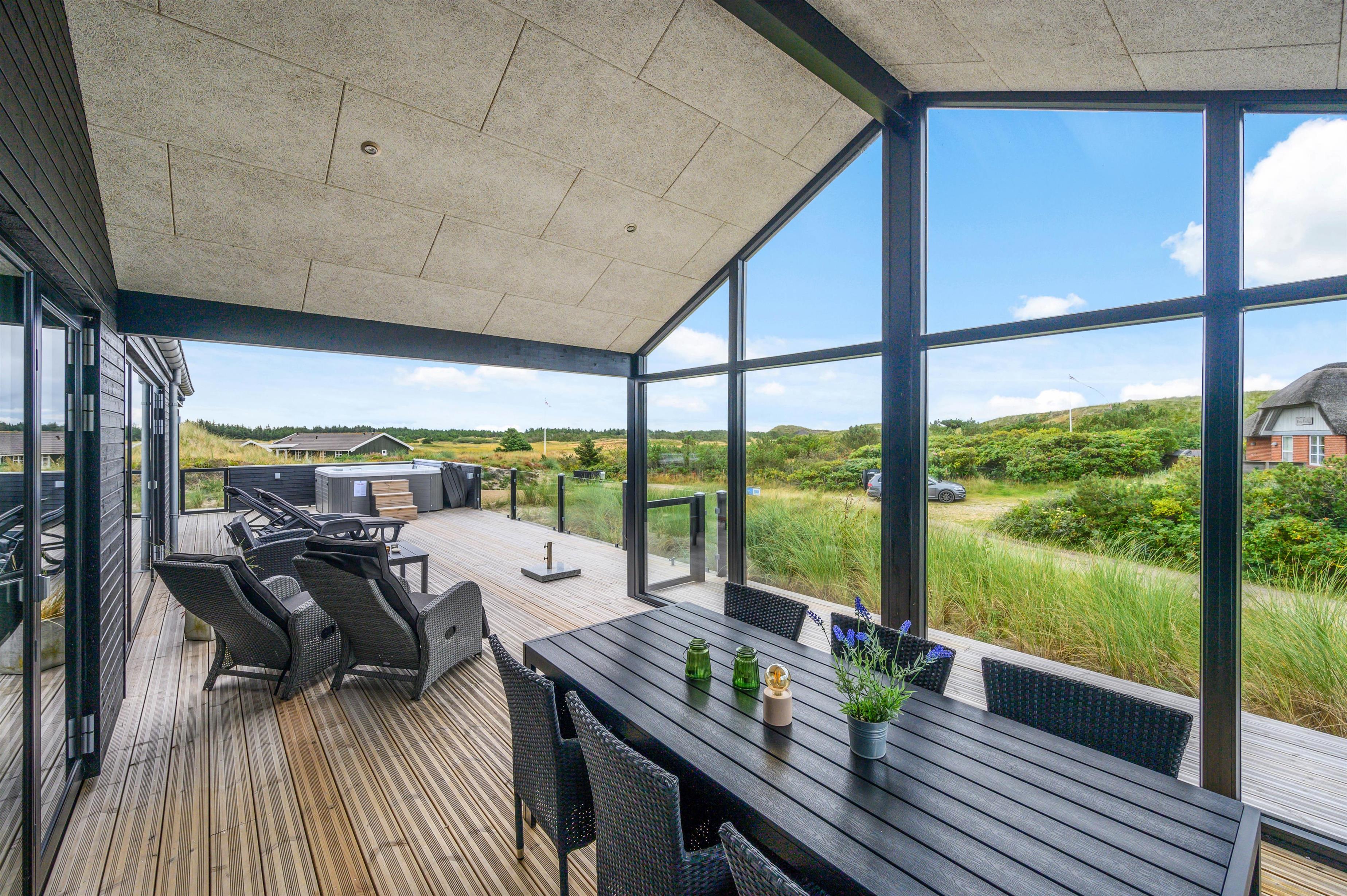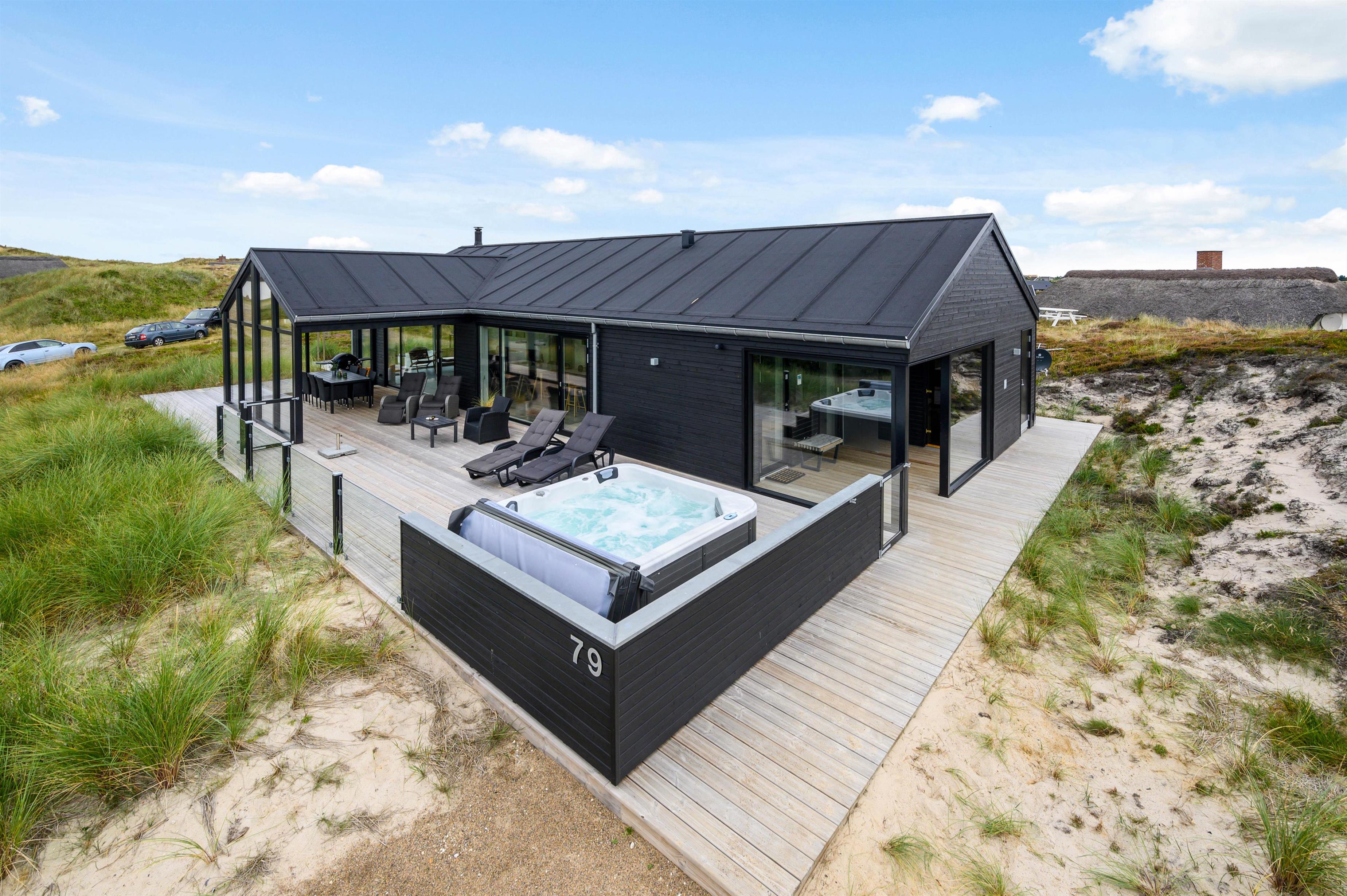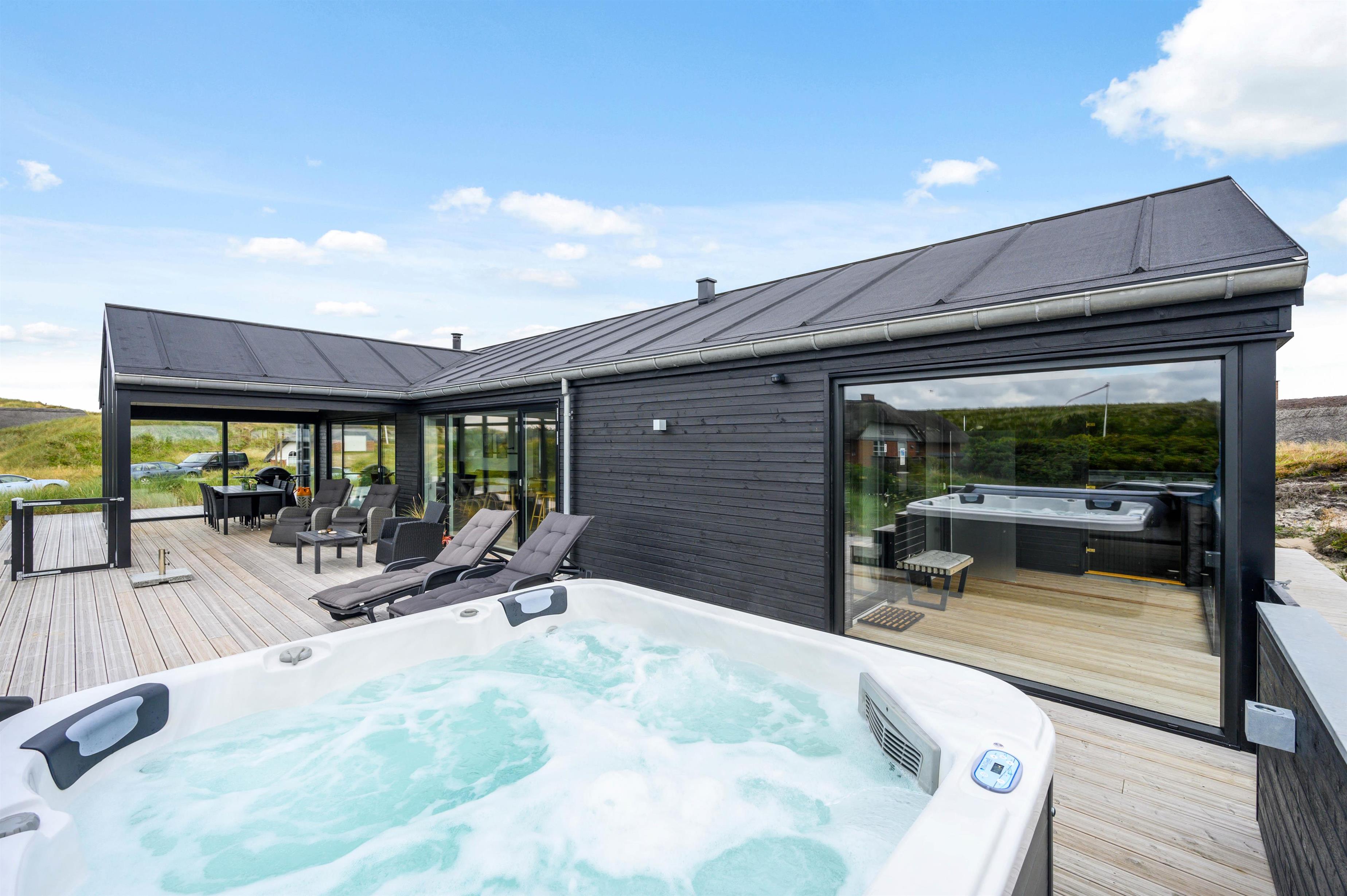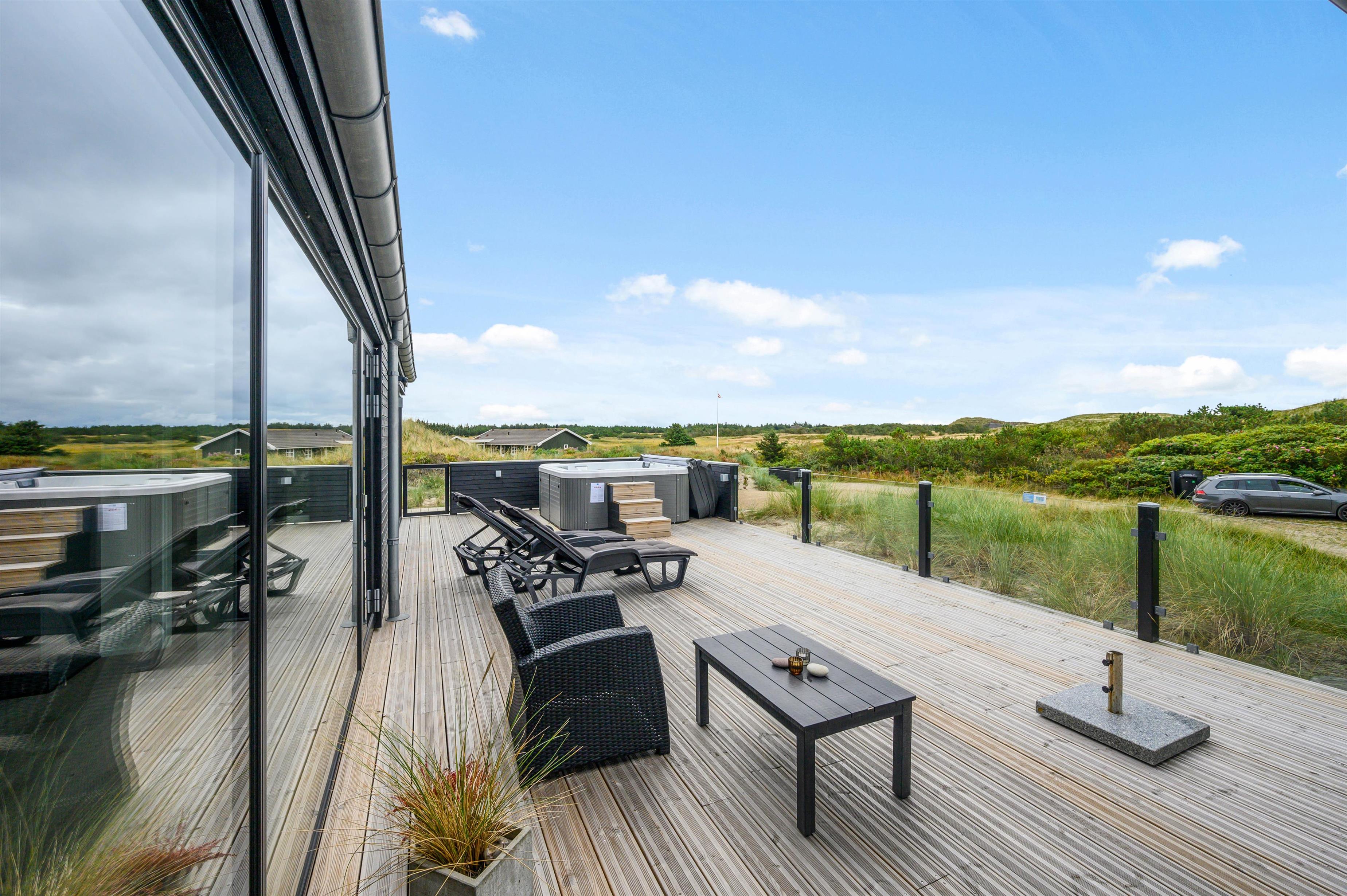 På terrassen finder I også feriehusets sauna – og ikke mindst det lækre udendørs spabad, som vil være til glæde for både børn og voksne. Hvem vil ikke gerne nyde de varme bobler på en sen sommeraften under en klar stjernehimmel med et glas rosé og den eneste ene? Fra den store lukkede terrasse har I også den mest fantastiske panoramaudsigt over det smukke lyngbeklædte klitlandskab.