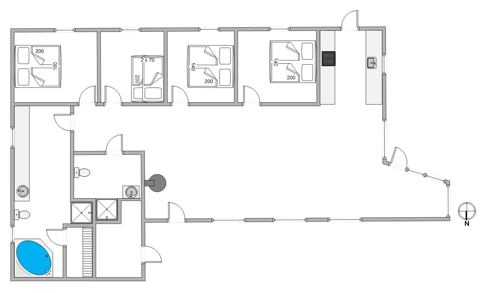 Det dejlige sommerhus har en god og hyggelig indretning. Feriehuset har 4 værelser, hvoraf de 3 af værelserne er med dobbeltsenge og det sidste med 1 køjeseng. Sommerhuset har desuden 2 gode badeværelser med gulvvarme, bruseniche og toilet. Det store badeværelse har endvidere spa og sauna.