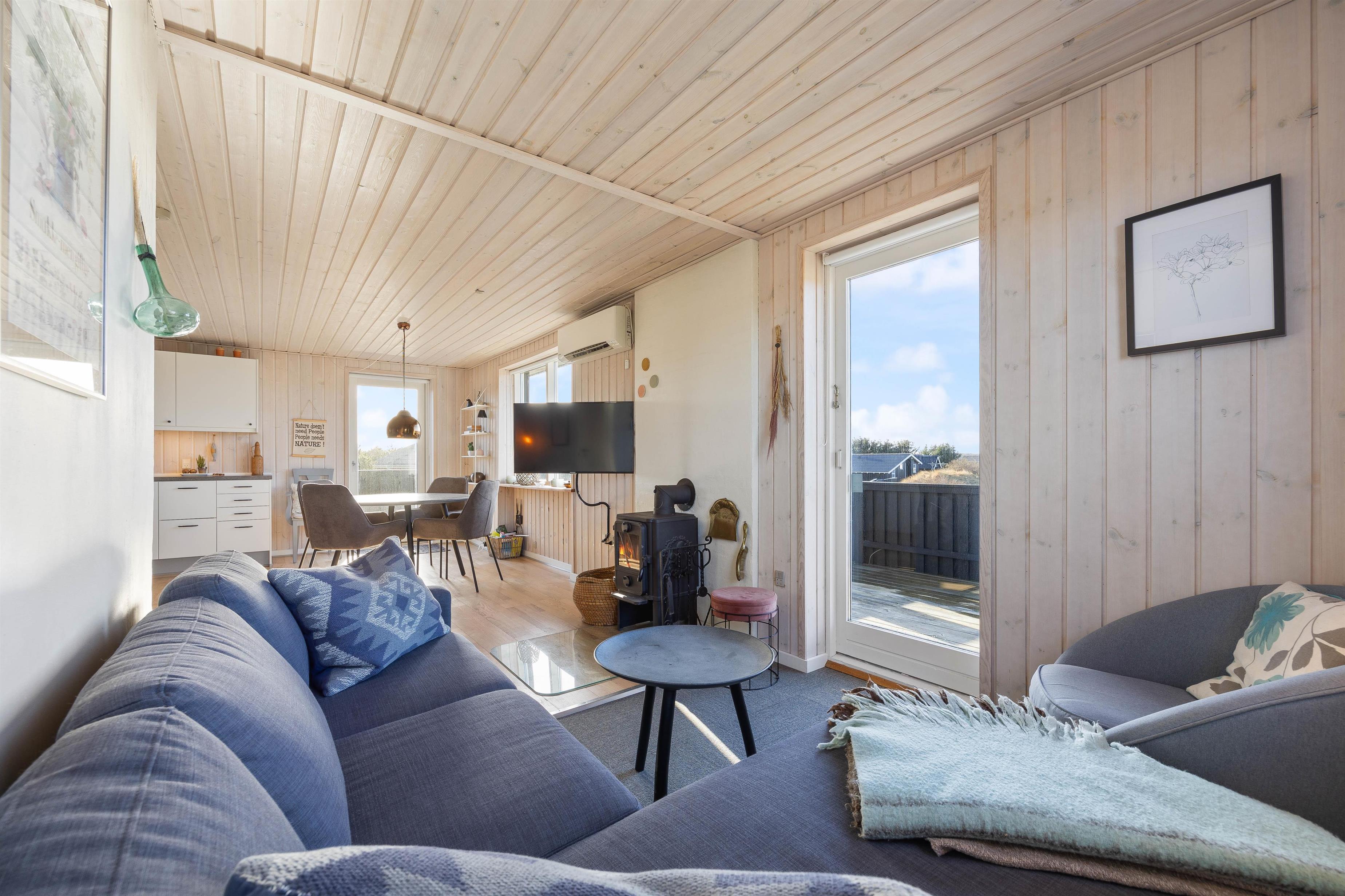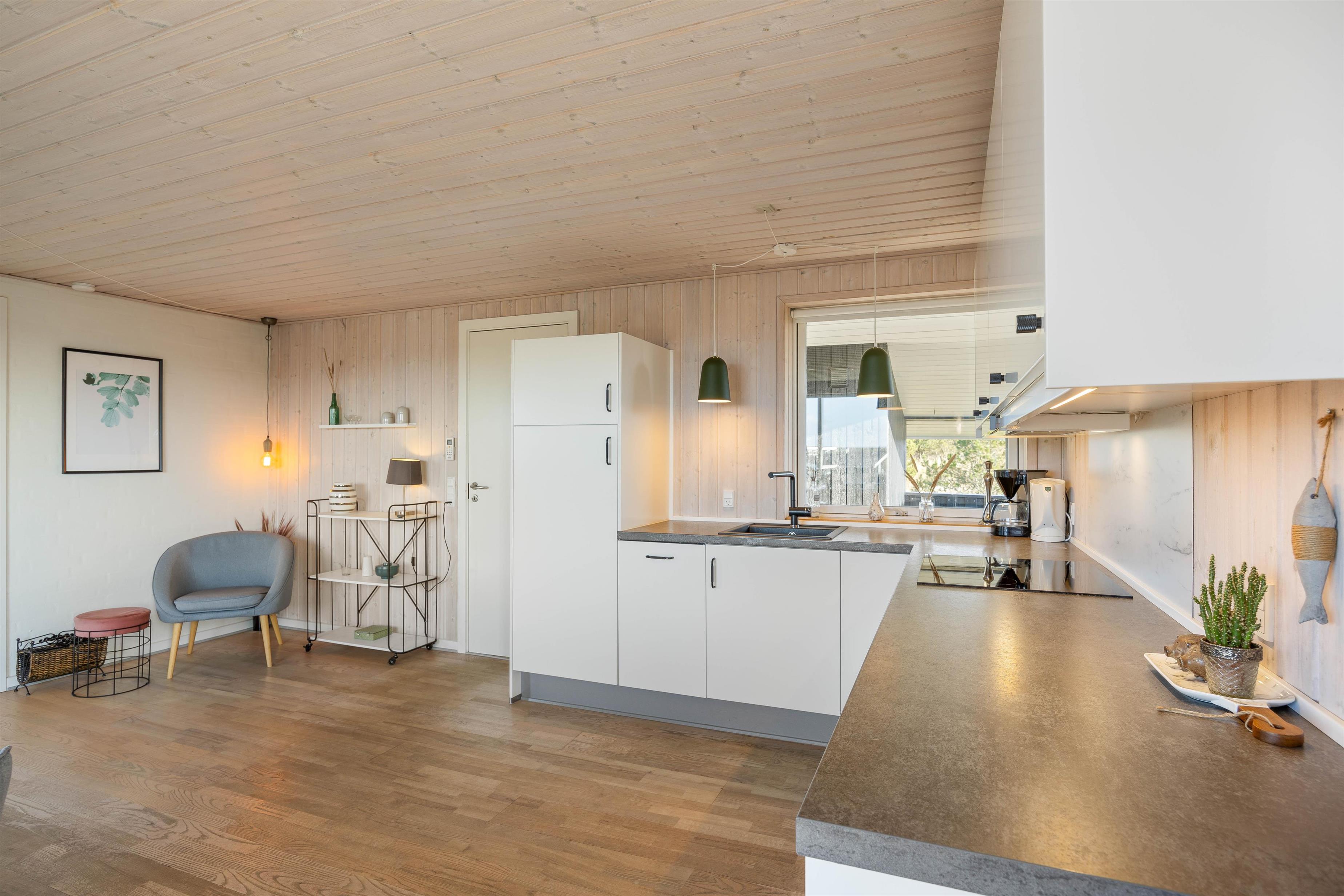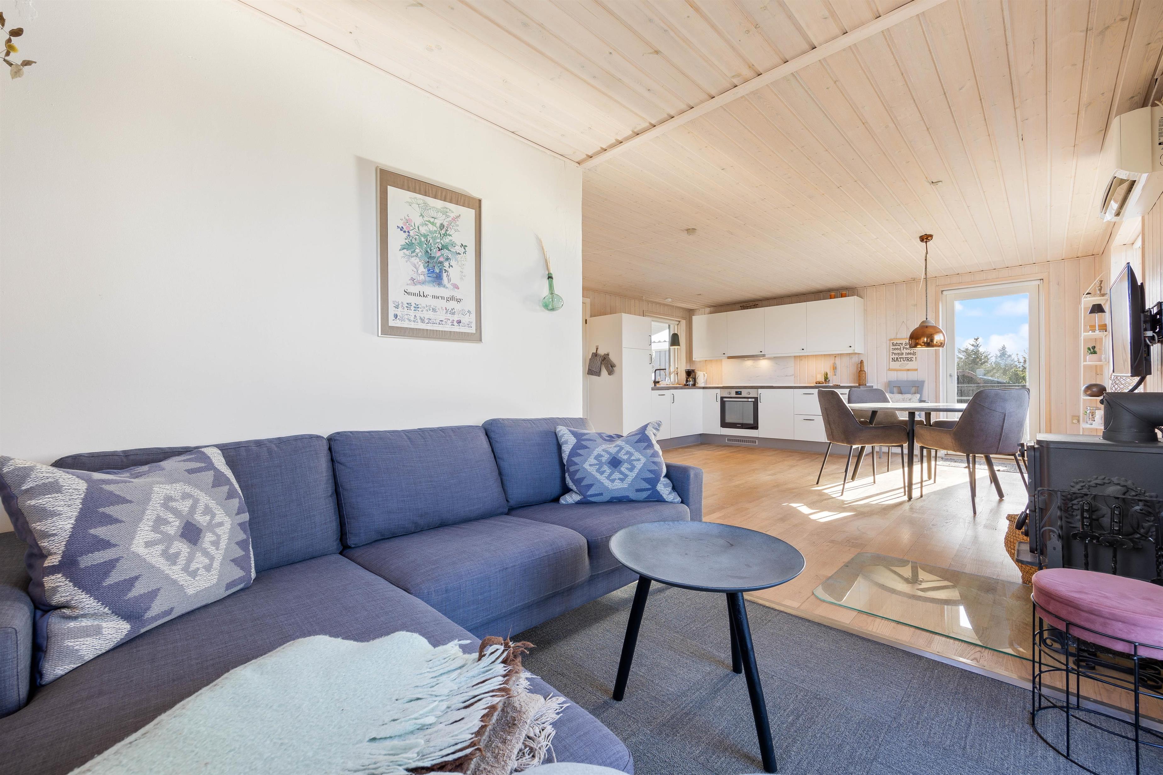 Man mærker feriestemningen straks, man træder ind ad døren til Sigfred Jensens Vej 4. De træbeklædte vægge og lofter samt det fine lysindfald giver en dejlig, luftig stemning. Den åbne planløsning gør, at stue, køkken og spisestue er samlet i et enkelt rum, hvor familien kan nyde at holde ferie sammen. Her vil alle føle sig hjemme, uanset om I bager eller laver mad i det lille, veludstyrede køkken med opvaskemaskine og induktionskomfur, eller I lægger puslespil sammen ved spisebordet. Tænd op i brændeovnen for hyggens skyld, den omkostnings- og energibesparende varmepumpe sørger for behagelige temperaturer i feriehuset. I sofagruppen kan I slappe af med en god bog, imens I nyder ilden i brændeovnen og den hyggelige varme.