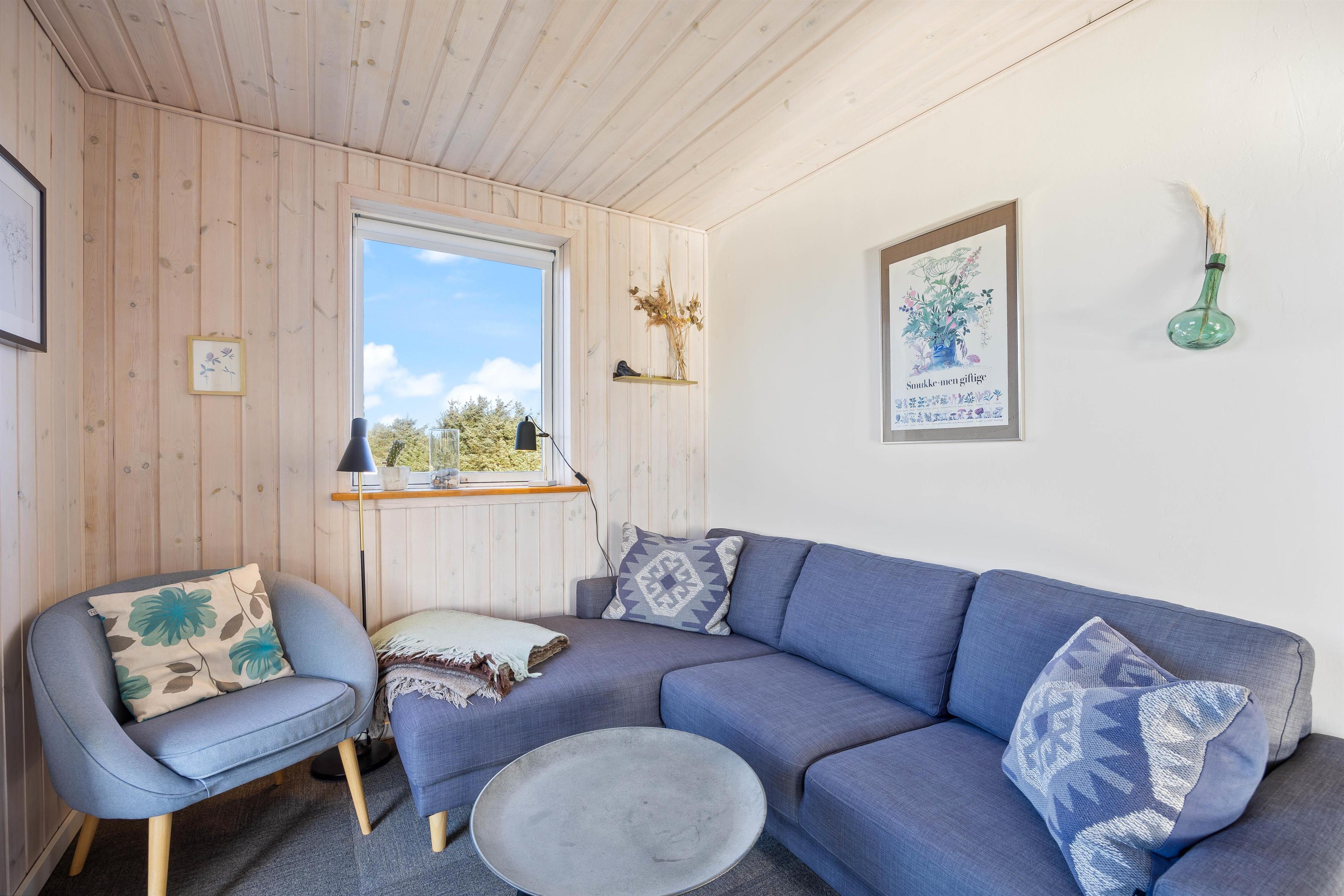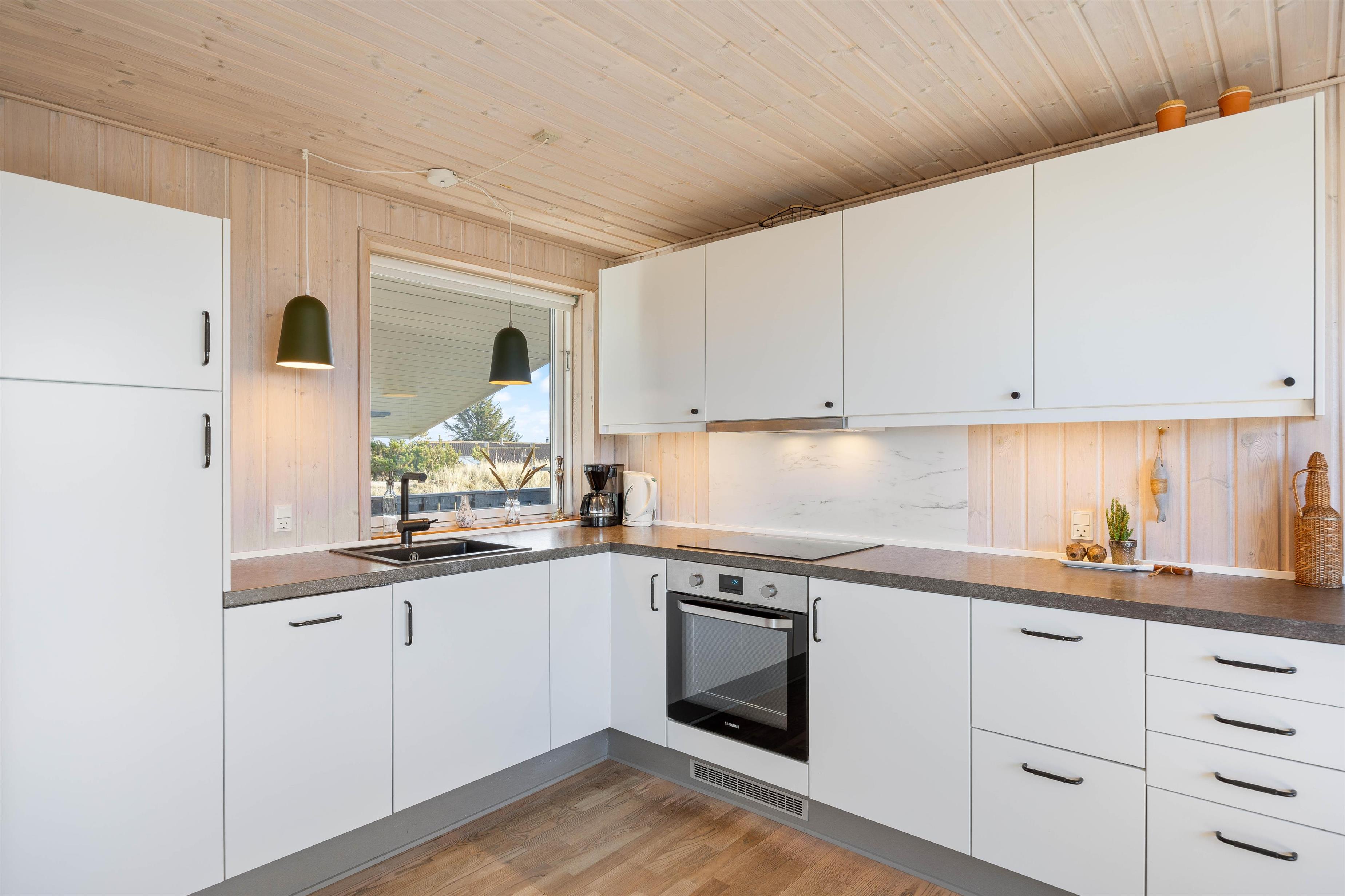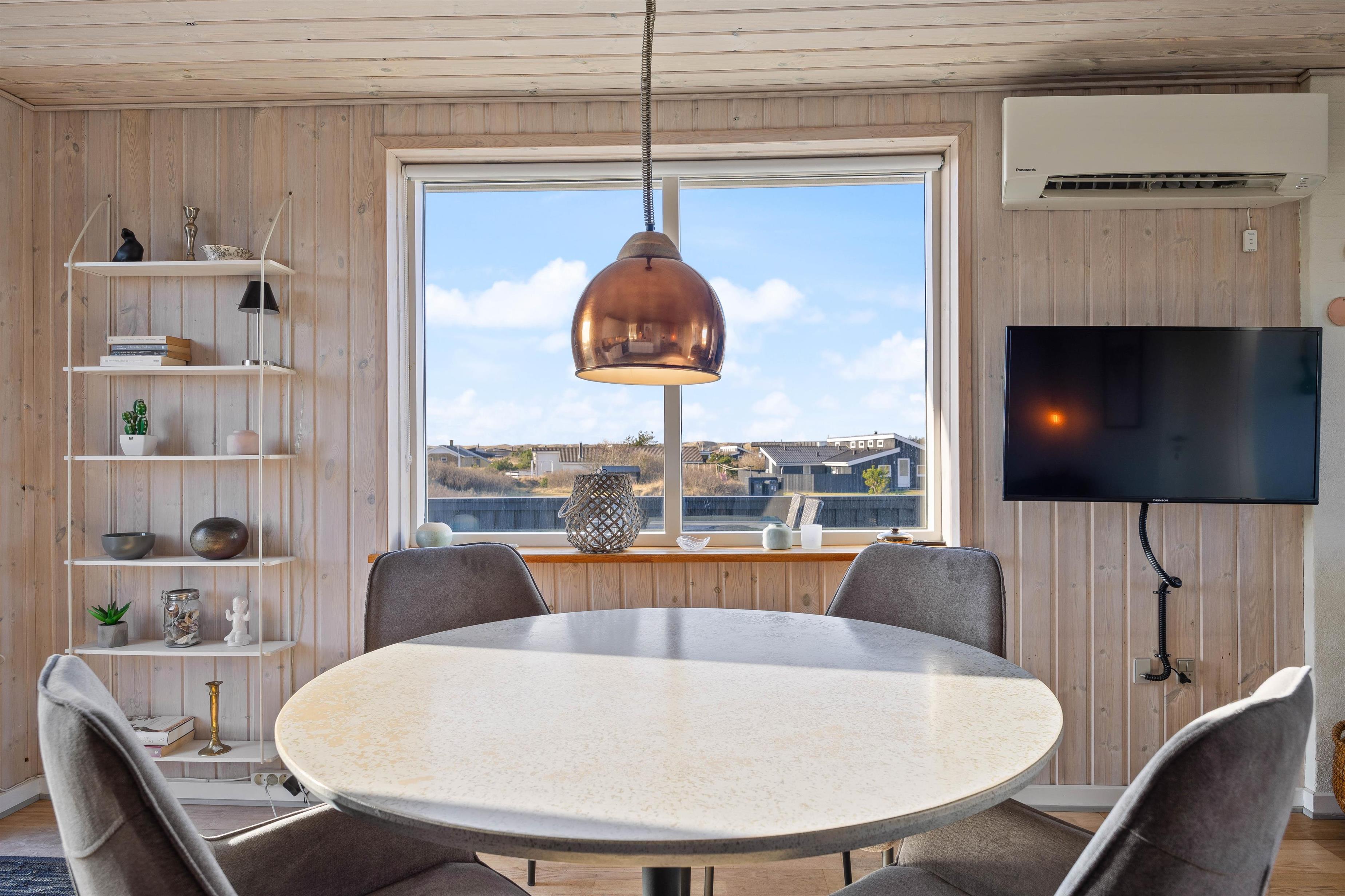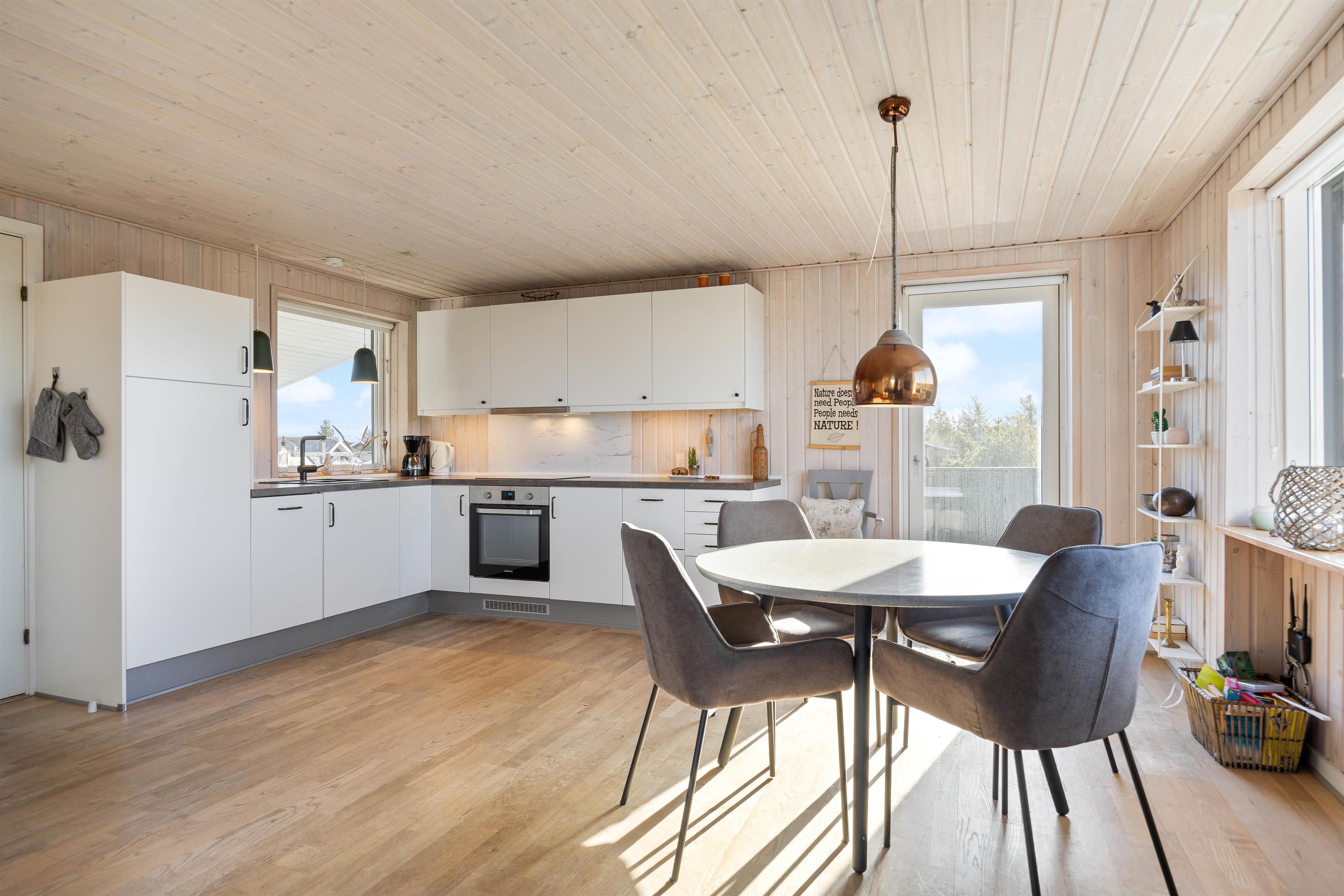 Man mærker feriestemningen straks, man træder ind ad døren til Sigfred Jensens Vej 4. De træbeklædte vægge og lofter samt det fine lysindfald giver en dejlig, luftig stemning. Den åbne planløsning gør, at stue, køkken og spisestue er samlet i et enkelt rum, hvor familien kan nyde at holde ferie sammen. Her vil alle føle sig hjemme, uanset om I bager eller laver mad i det lille, veludstyrede køkken med opvaskemaskine og induktionskomfur, eller I lægger puslespil sammen ved spisebordet. Tænd op i brændeovnen for hyggens skyld, den omkostnings- og energibesparende varmepumpe sørger for behagelige temperaturer i feriehuset. I sofagruppen kan I slappe af med en god bog, imens I nyder ilden i brændeovnen og den hyggelige varme.