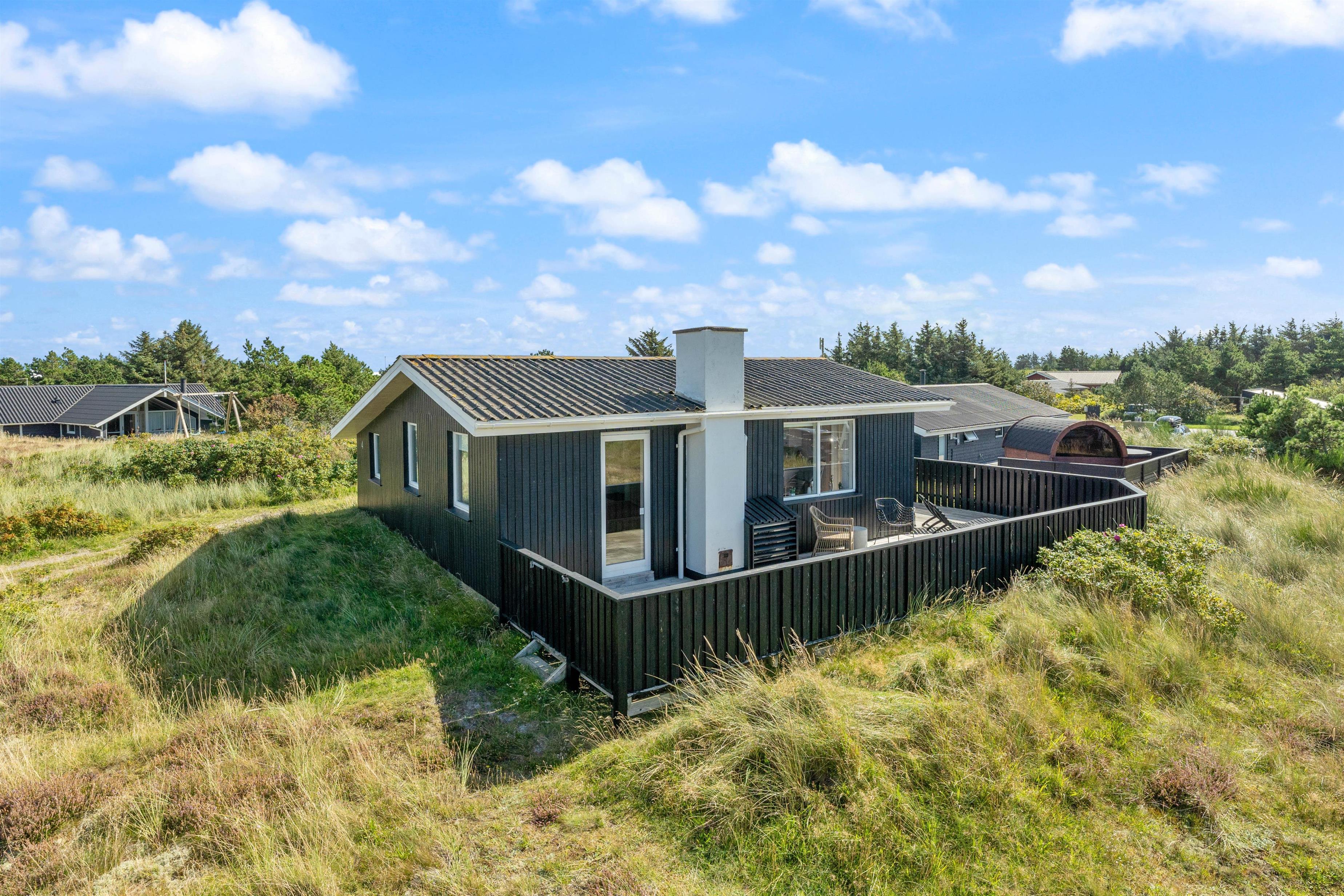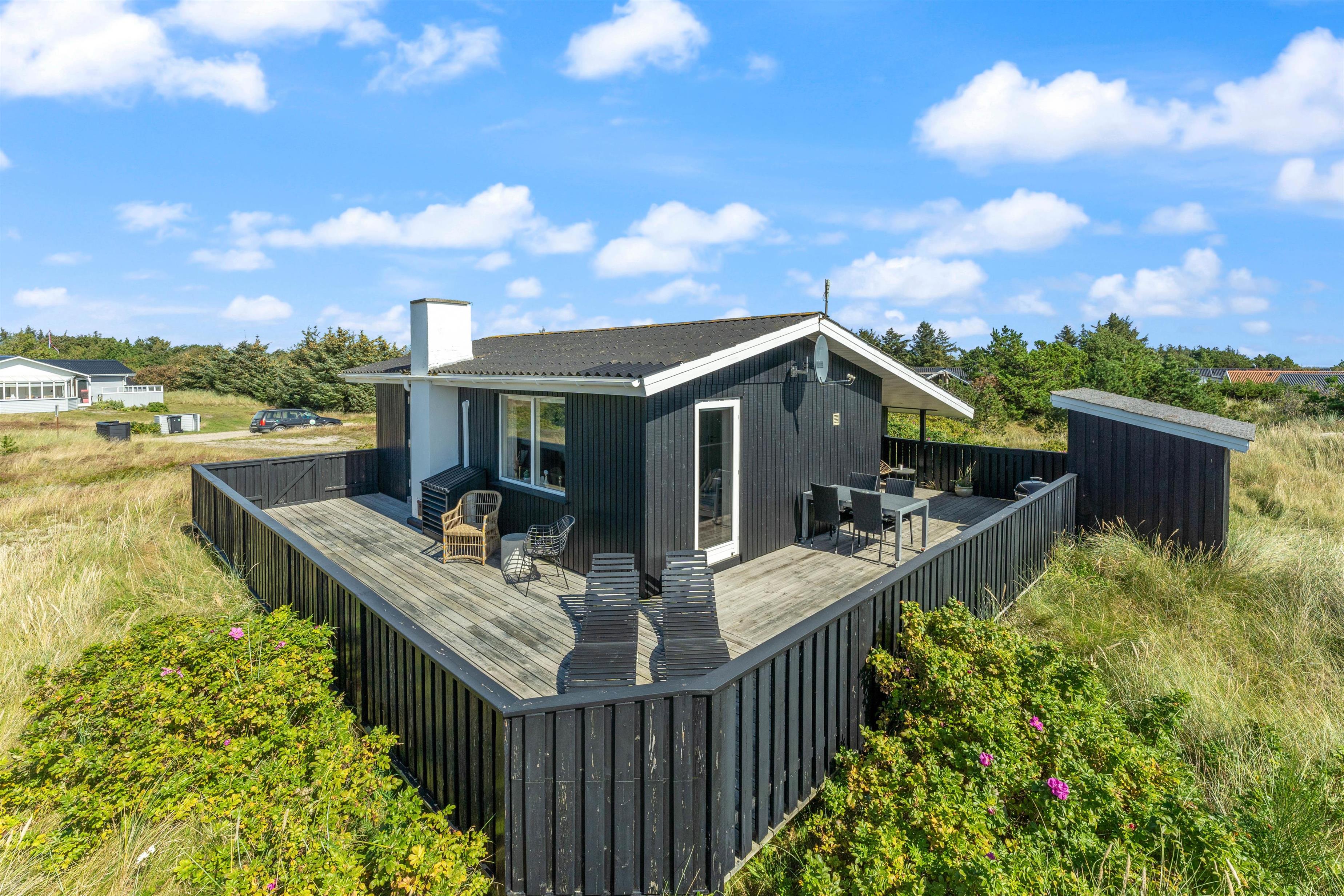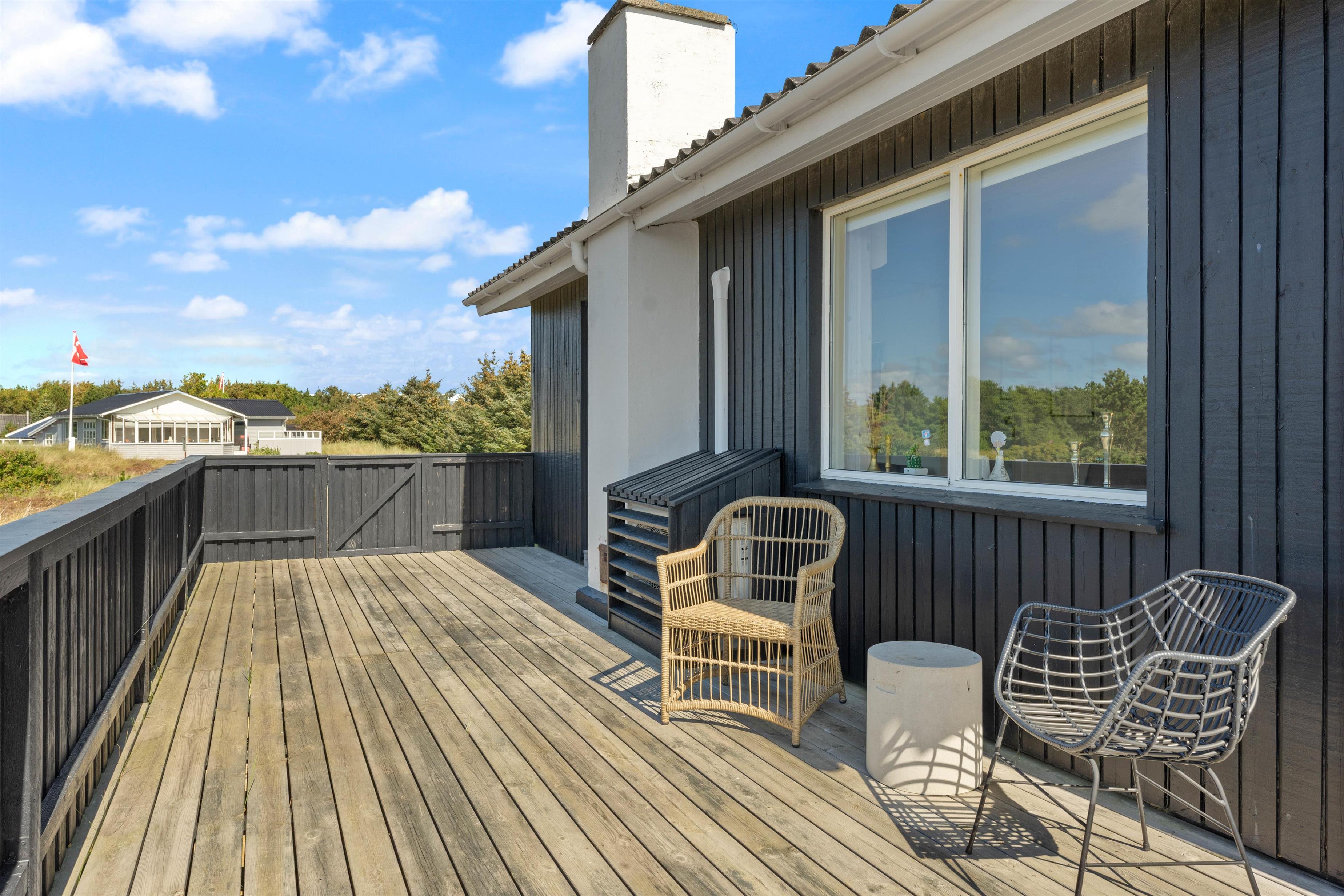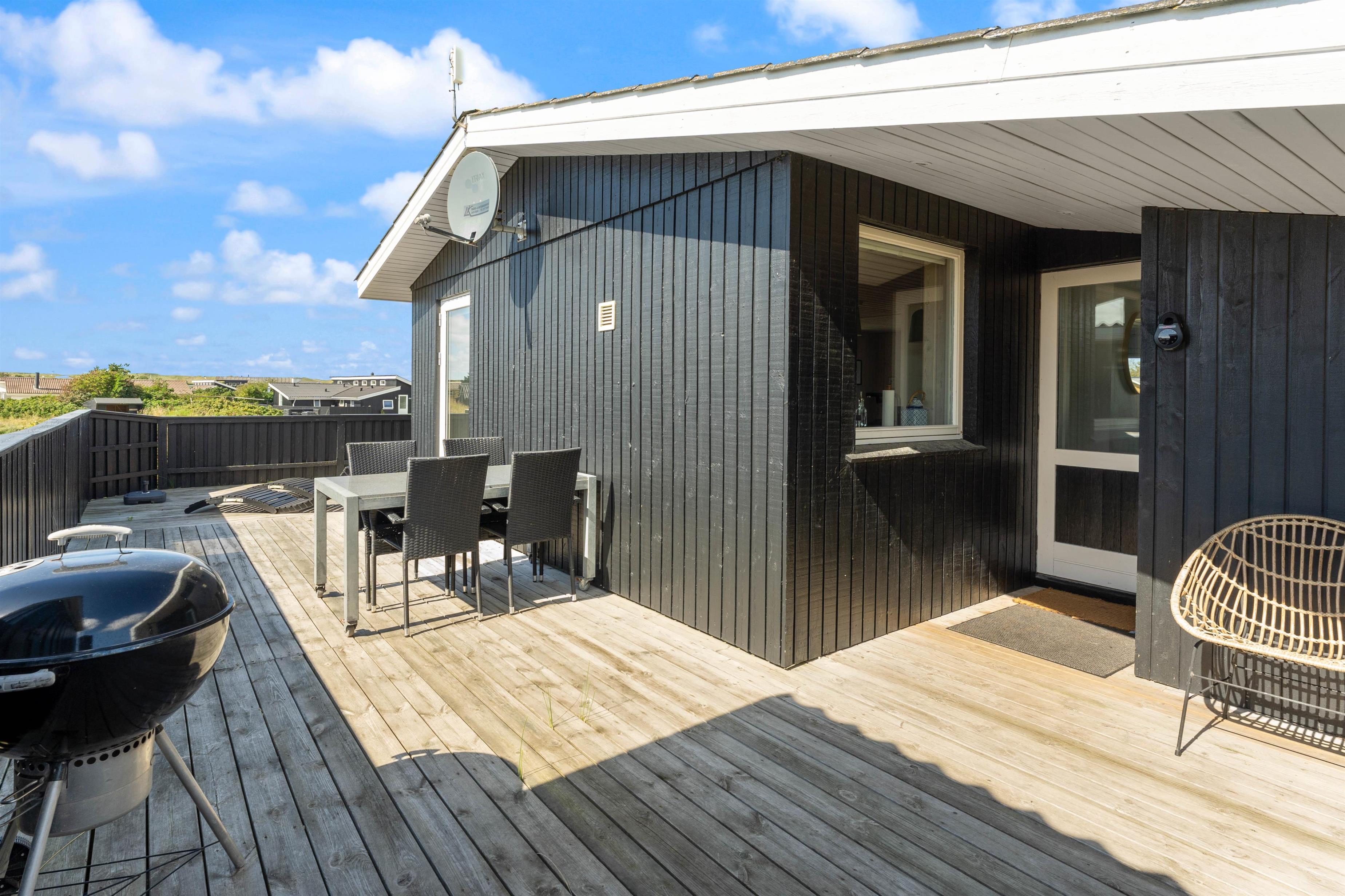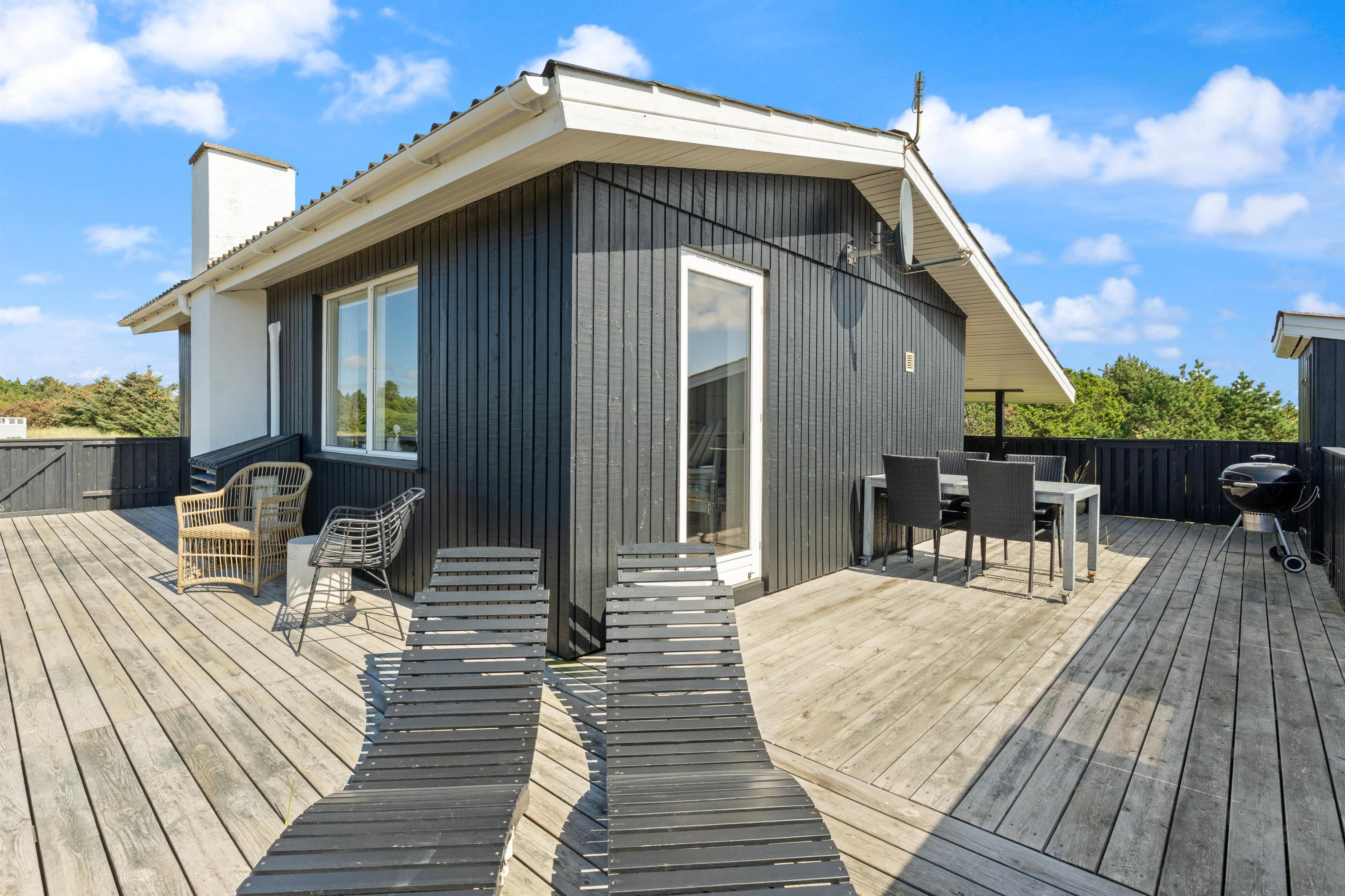 Den afskærmede og lukkede terrasse indbyder til at solbade og slappe af her. Havemøbler, liggestole, parasol og grill står til jeres rådighed. Her kan børn og hunde trygt boltre sig. Tænd op i grillen til aften og nyd et lækkert grillmåltid sammen, imens skyggerne bliver lange. Bagefter kan I stadig nå en tur til stranden, hvor I kan opleve solnedgangen i Vesterhavet.