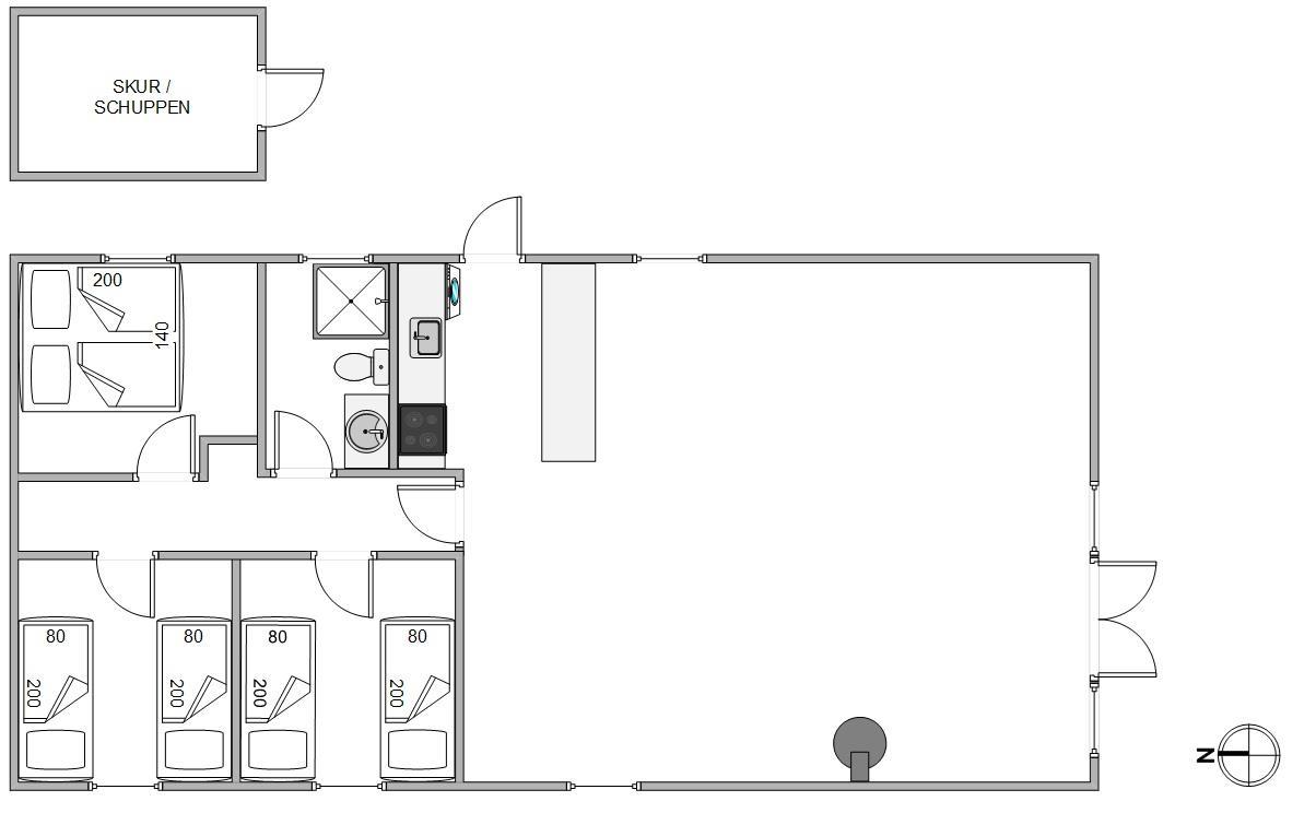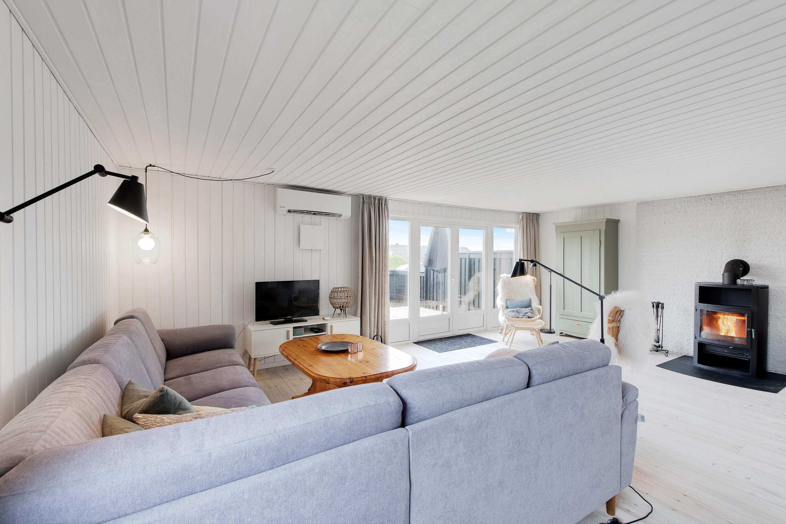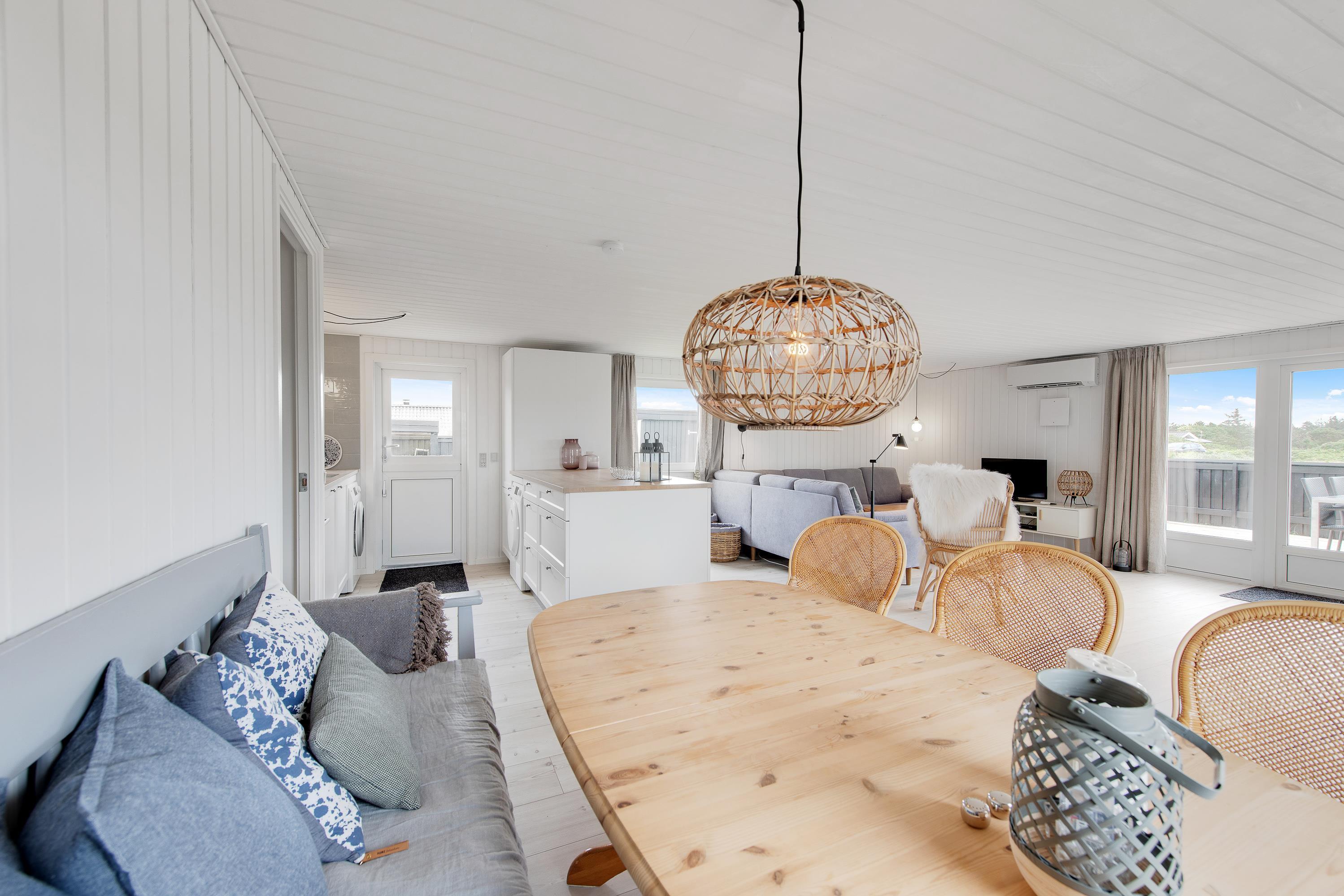 Husets hjerte er det åbne opholdsrum, hvor stue og køkken er slået sammen med brændeovnen som centrum. Det dejlige lyse køkken er holdt i bondehusstil der sammen med slagbænken og karlekammerskabet giver køkkenalrummet et skønt stemningsfyldt udtryk. Her vil der med garanti blive skabt et hav af nye ferieminder, og hele familien kan samles til lækre feriemåltider, hyggelige kortspil og afslapning på sofaen, mens brændeovnen knitrer i baggrunden.