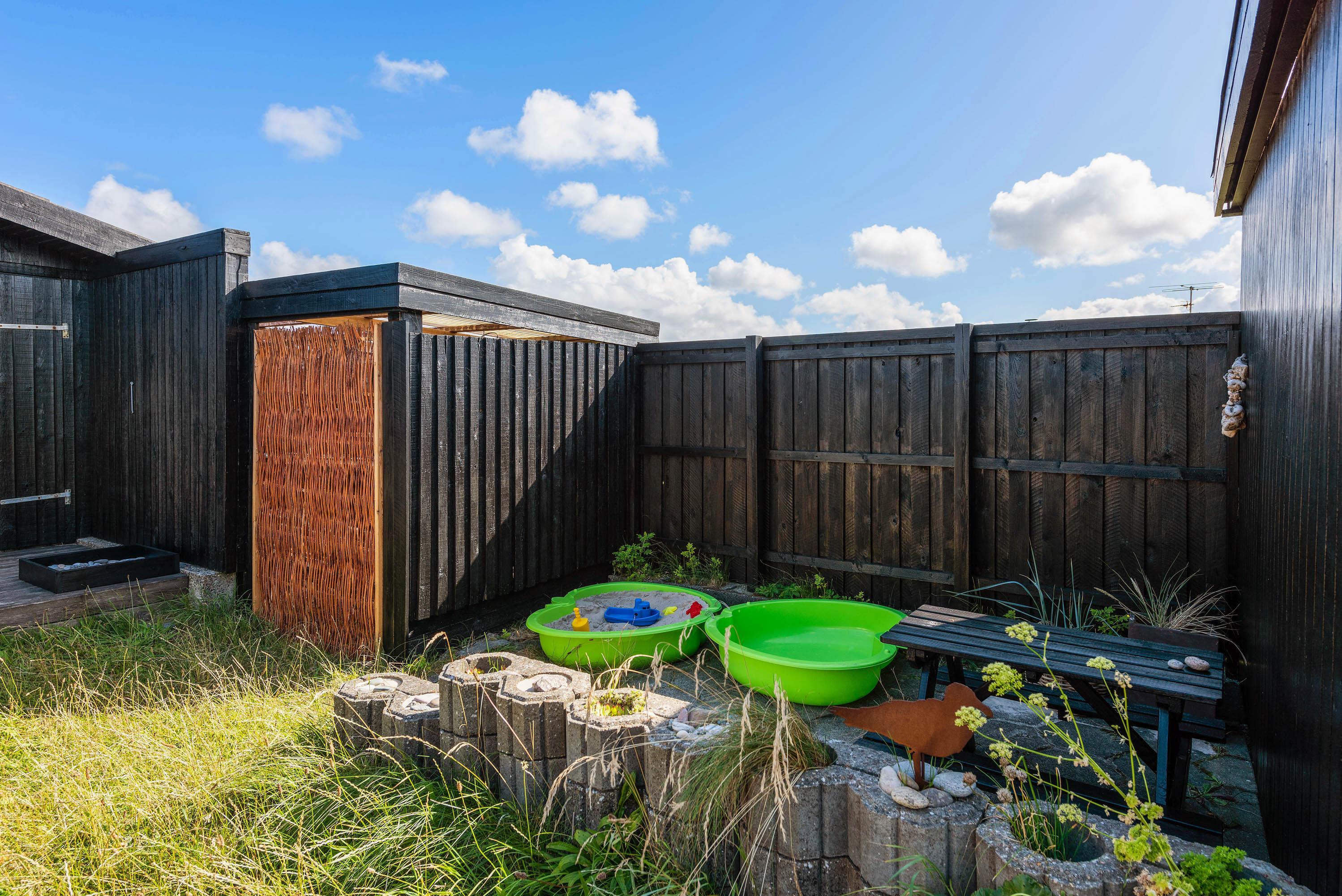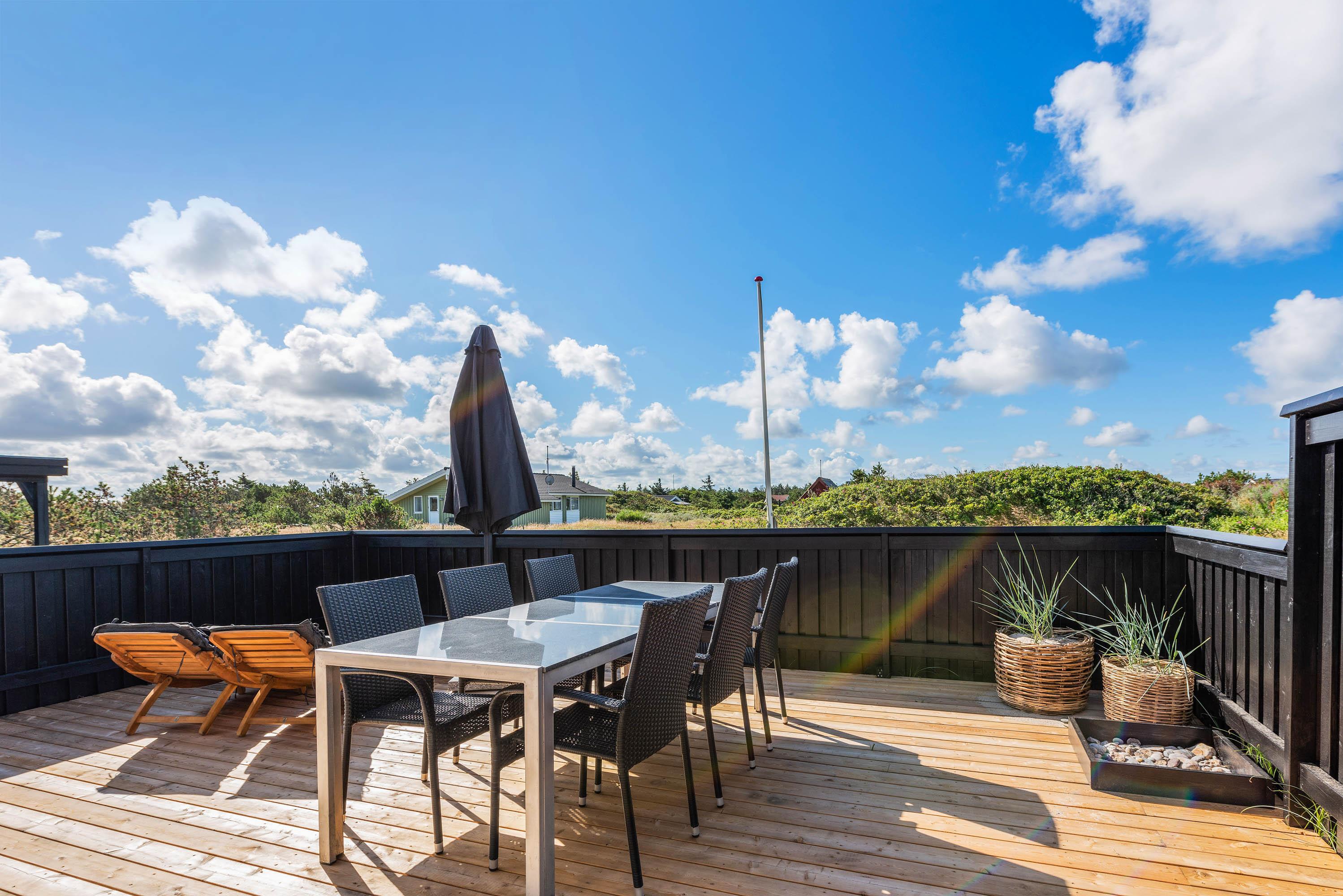 Fra stuen er der udgang til en afskærmet træterrasse, hvor I kan sidde og nyde det gode vejr og tanke nye kræfter i den friske havluft. Der er både sørget for havemøbler og liggestole, og til de lune sommeraftener; en grill.