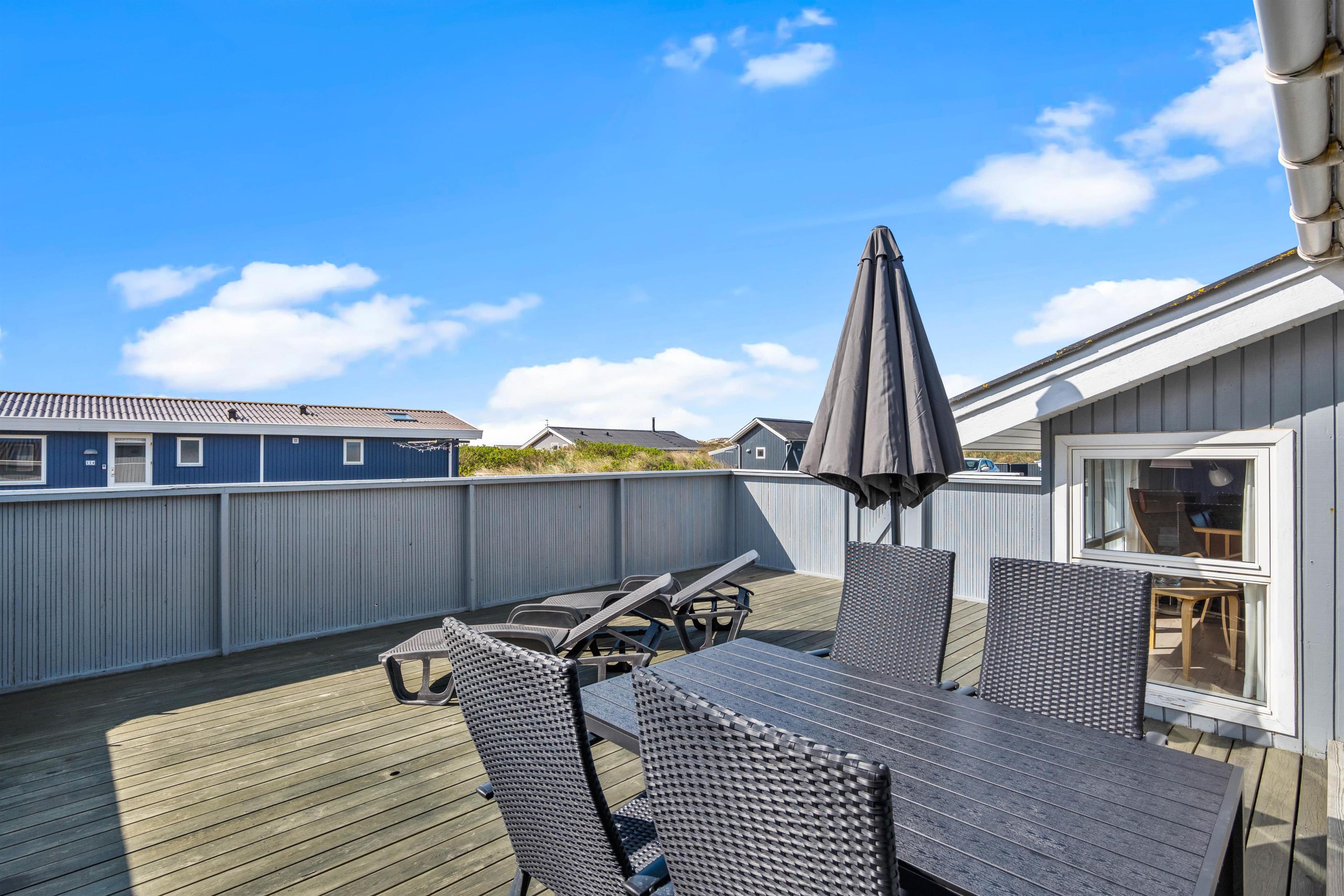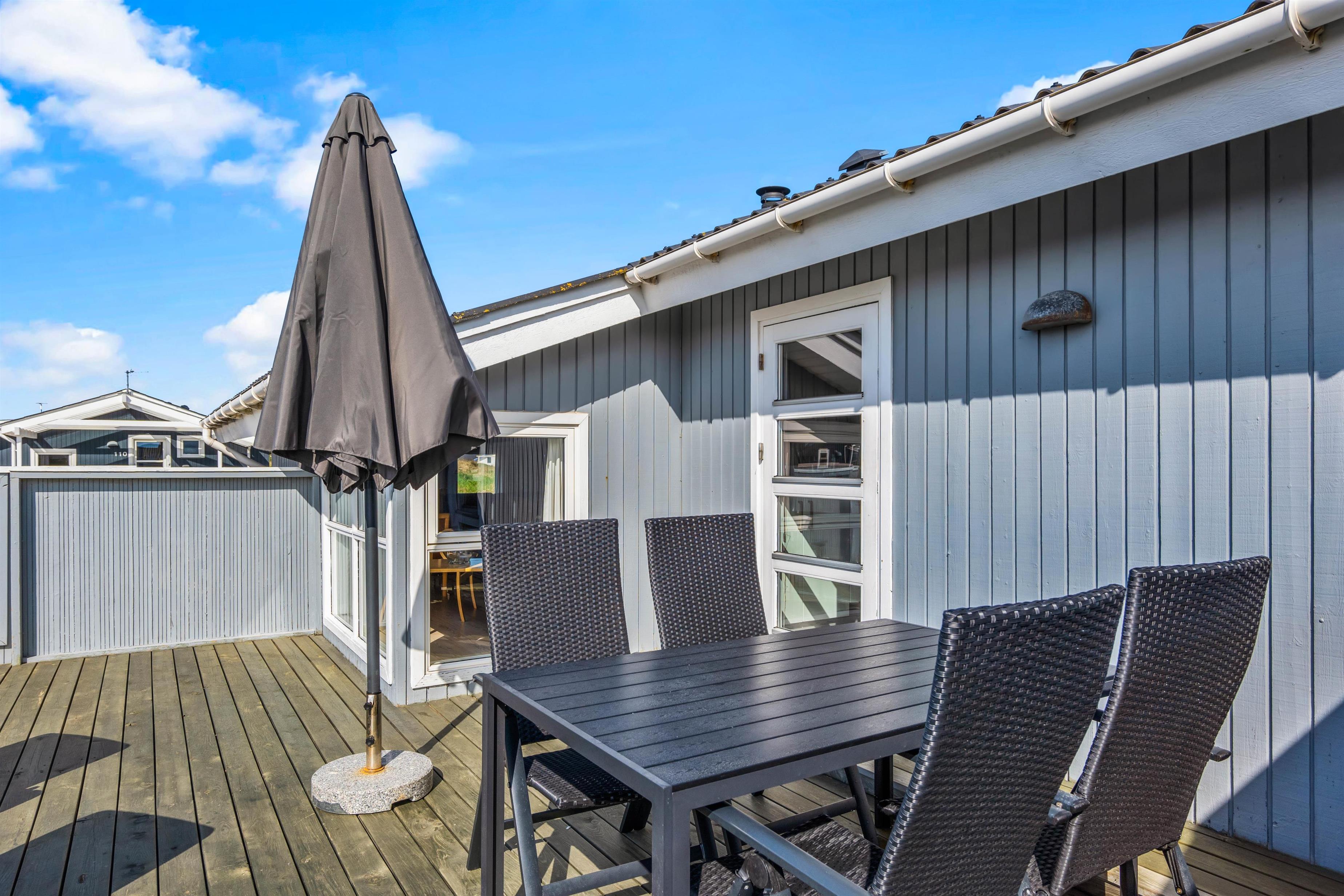 Udenfor har feriehuset en dejlig lukket træterrasse, hvor I kan nyde solskinstimerne. Her er både liggestole til afslapning samt havemøbler, hvor I kan nyde frokosten i solen.