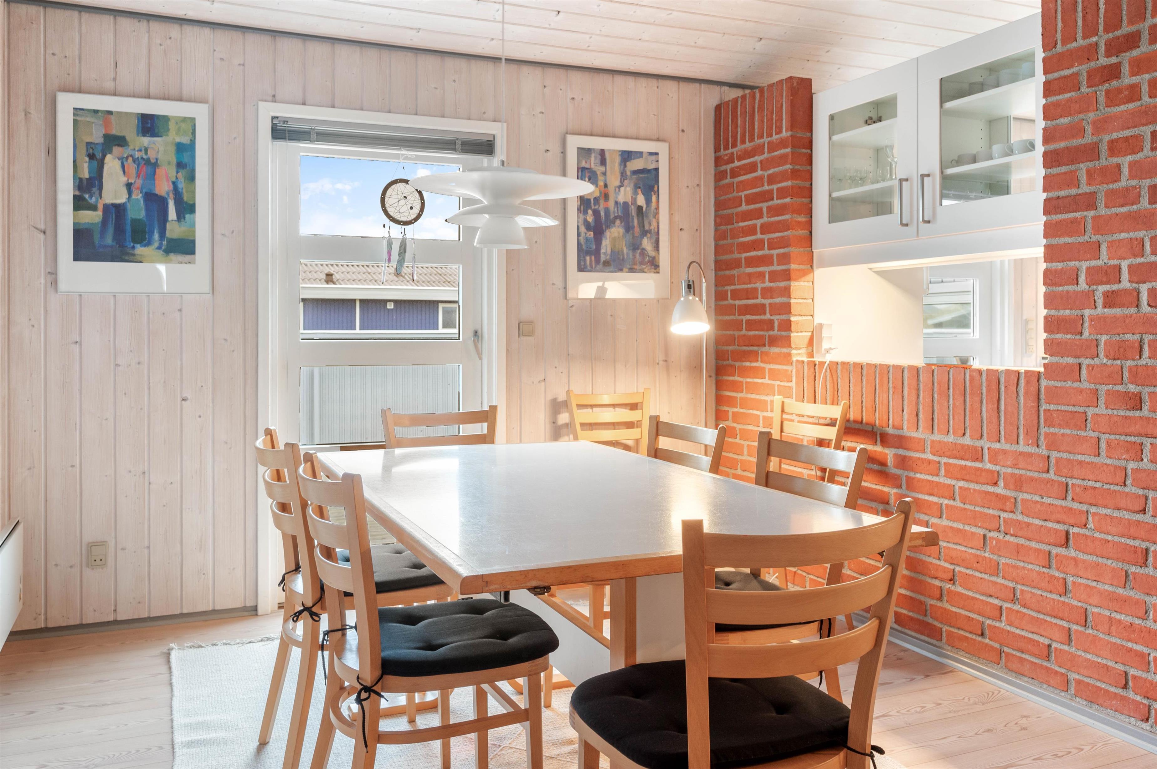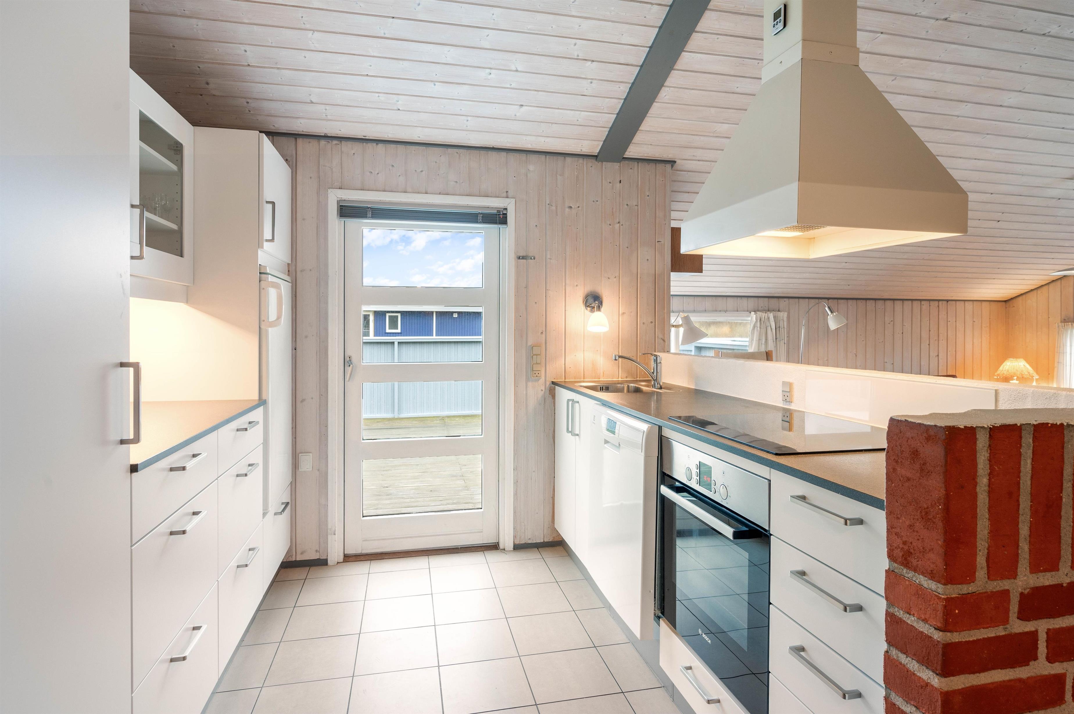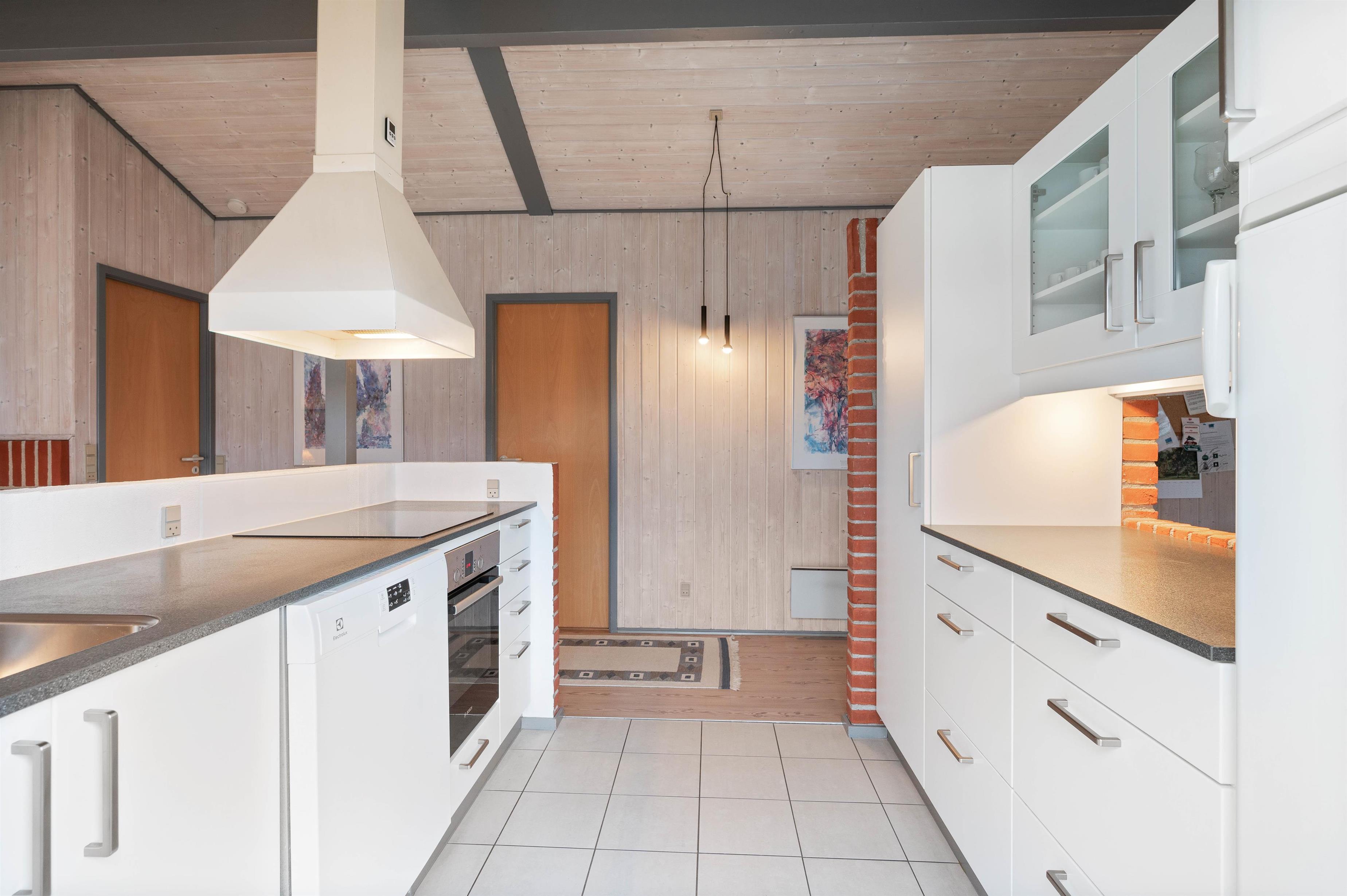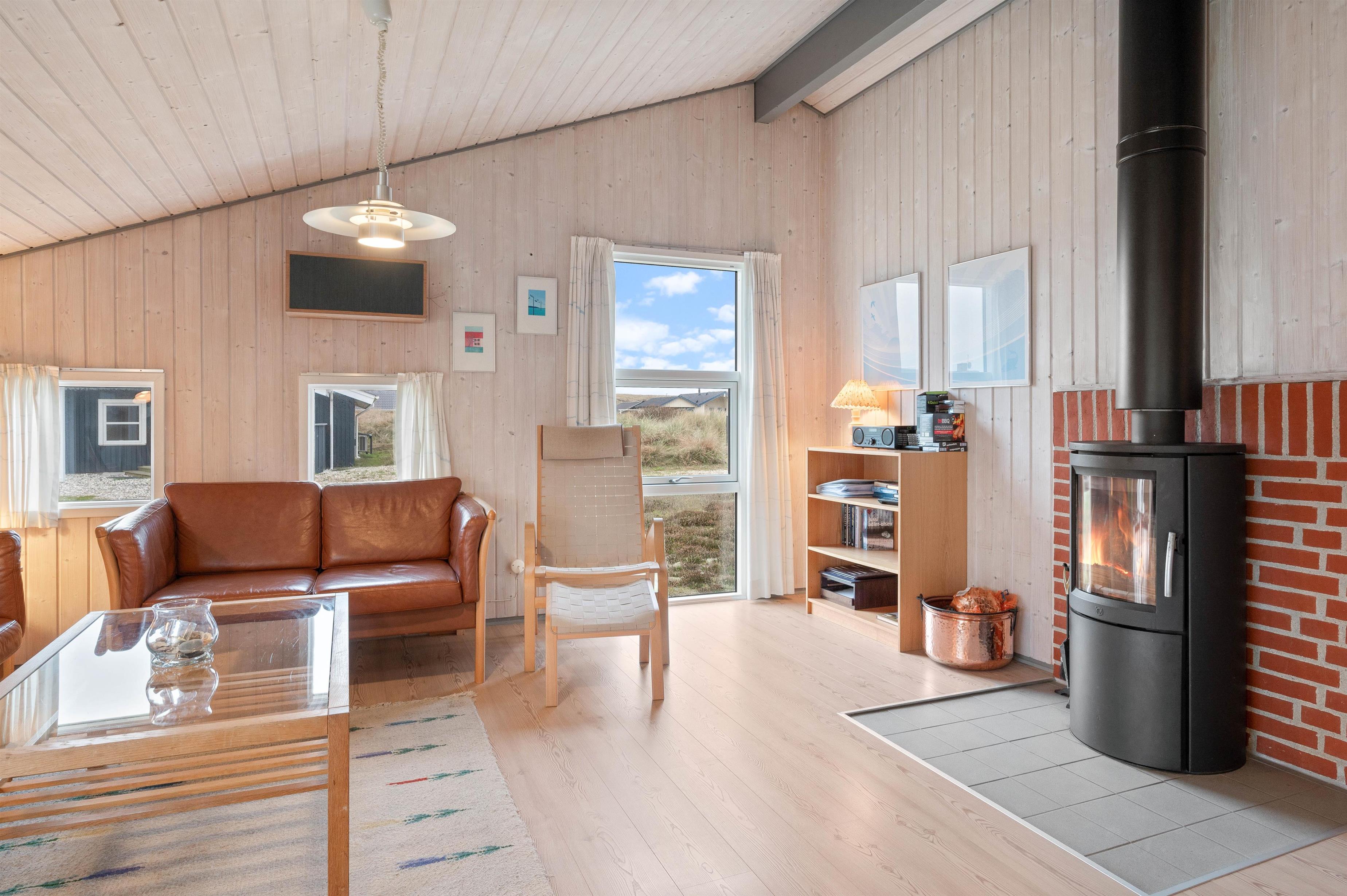 Samlingspunktet er stuen, køkkenet og spiseafdelingen, som er i åben forbindelse. Køkkenet er indrettet med opvaskemaskine og mikroovn samt kig til både stue og spisestuen, hvor I kan nyde maden omkring bordet. Ligesom i resten af sommerhuset er her lyse trægulve og loft til kip, hvilket skaber en rar atmosfære sammen med stuens brændeovn. Her kan I slappe af i sofaen eller samles omkring familiens yndlingsbrætspil, mens morgendagens aktiviteter planlægges.