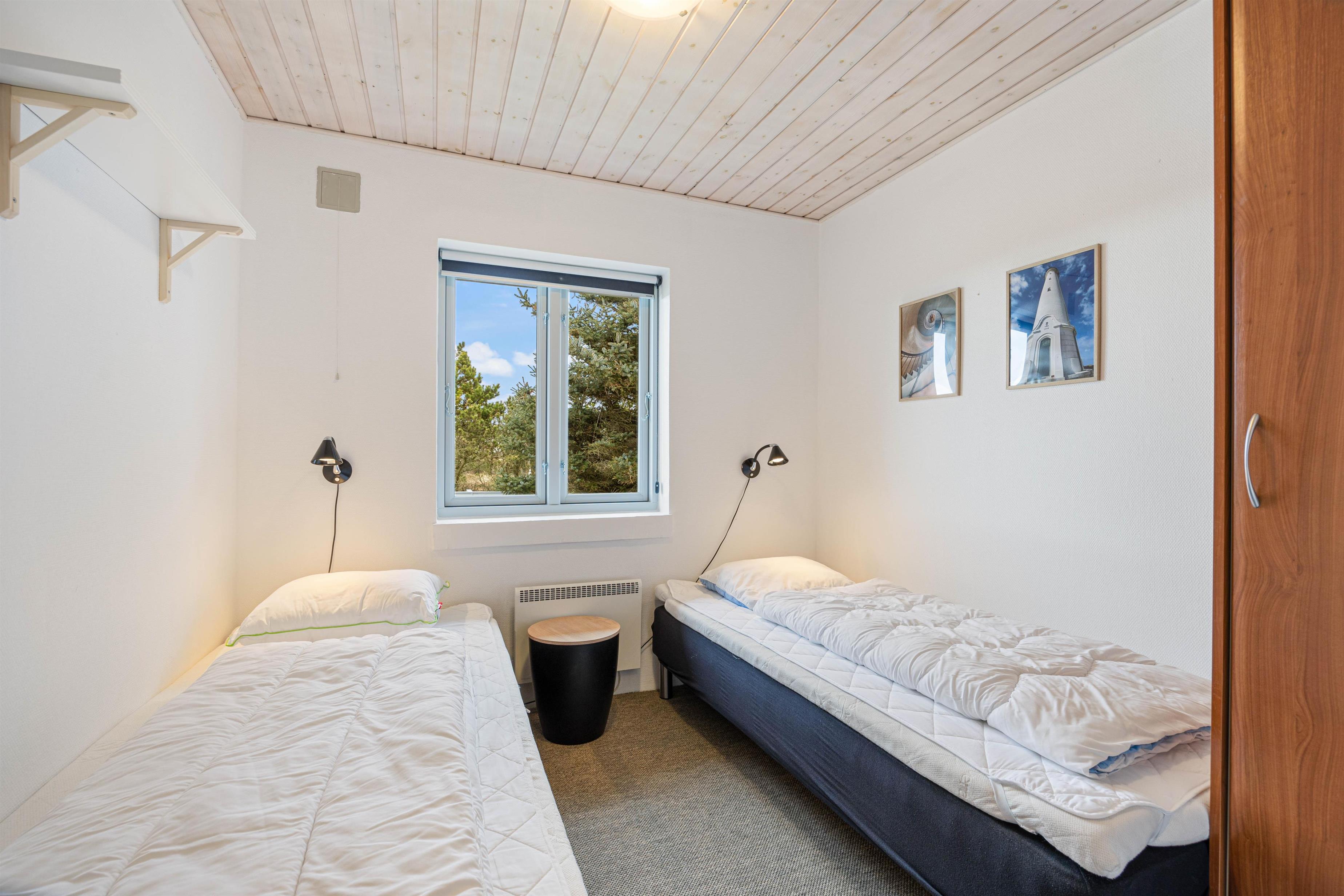 Sommerhuset har 3 gode soveværelser, heraf 1 med dobbelt- og 2 med enkeltsenge, som giver komfortable forhold for 6 personer.