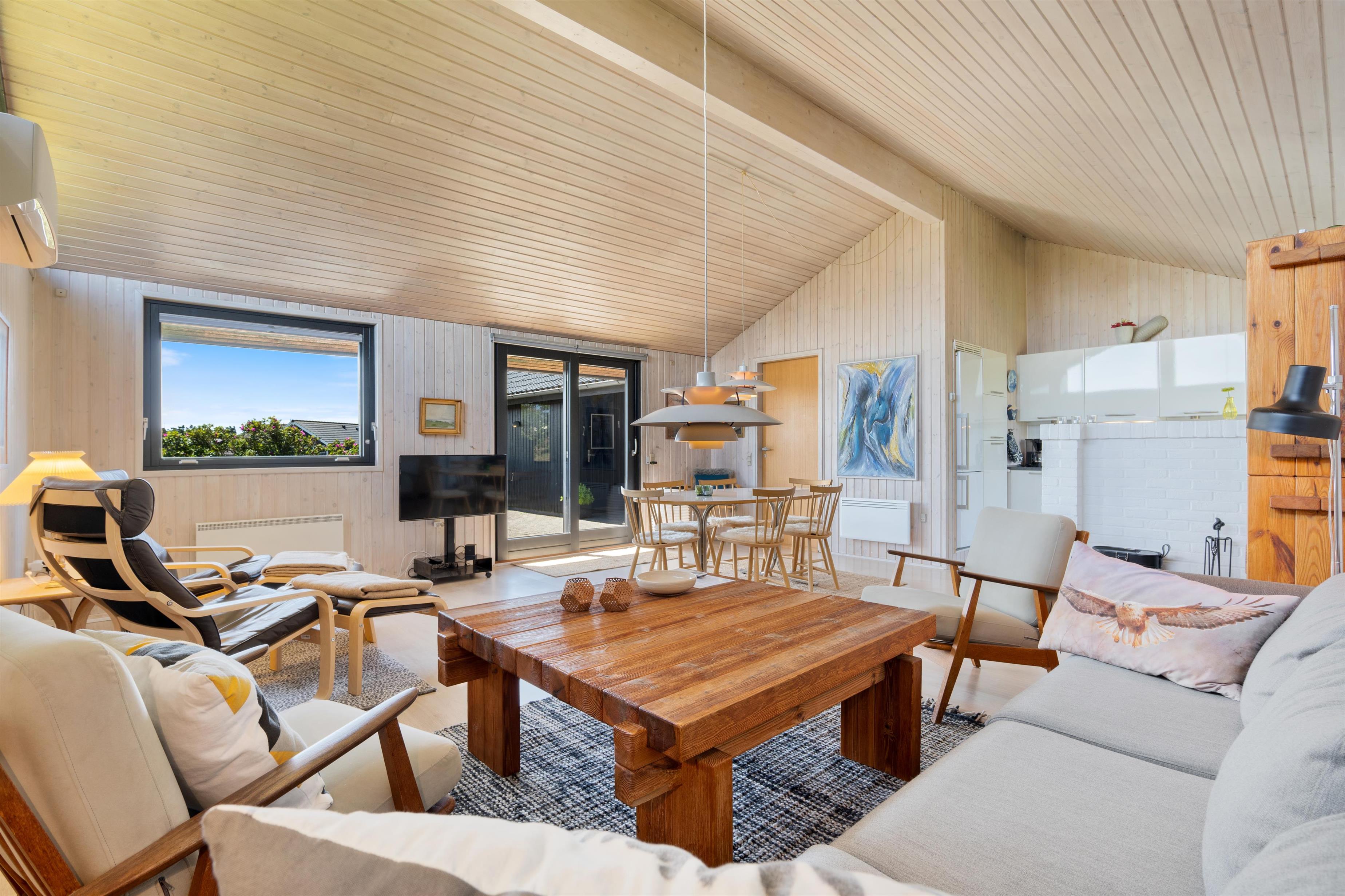 I sommerhuset bliver I mødt af en hyggelig indretning med loft til kip og vidunderligt lysindfald i alle rum. Det moderne køkken med alt i hvidevarer står i åben forbindelse med den store stue, som er indrettet med gedigne møbler i både spiseafdelingen og opholdsafsnittet, hvor der skal hygges foran den store brændeovn. Her findes både TV med parabol og radio med CD.