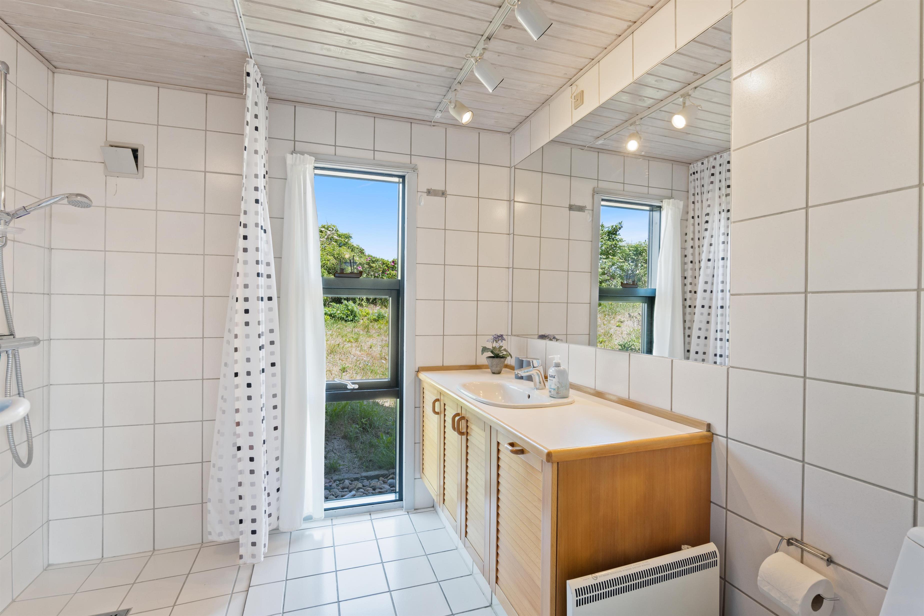 Feriehusets badeværelse er med gulvvarme, bruser og vaskemaskine.