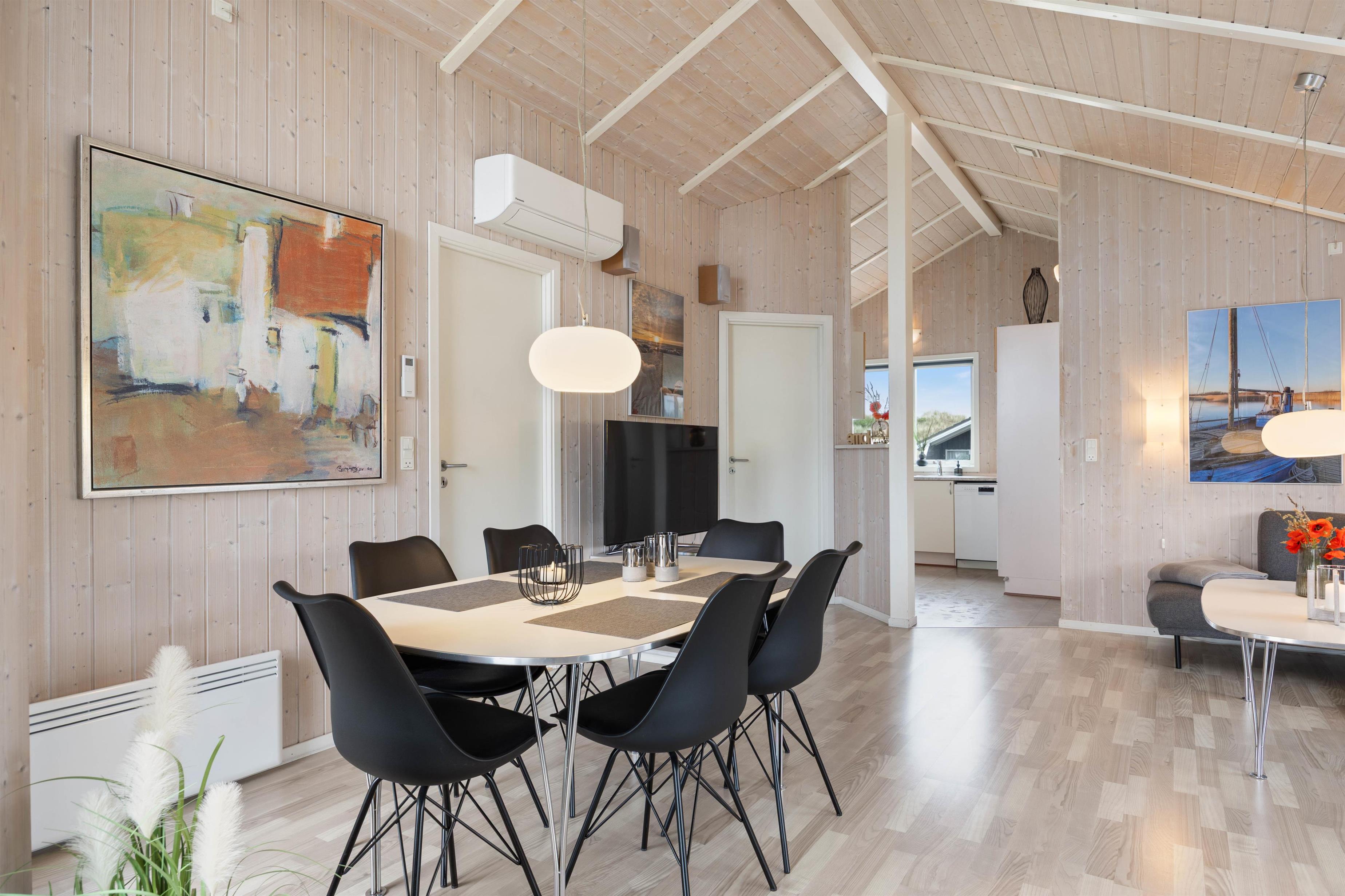 Stuen er smagfuldt indrettet, lys og hyggelig og med et sofahjørne, som indbyder til familiehygge - måske brætspil eller en god bog ved brændeovnen. Som et ekstra plus er der også varmepumpe i sommerhuset