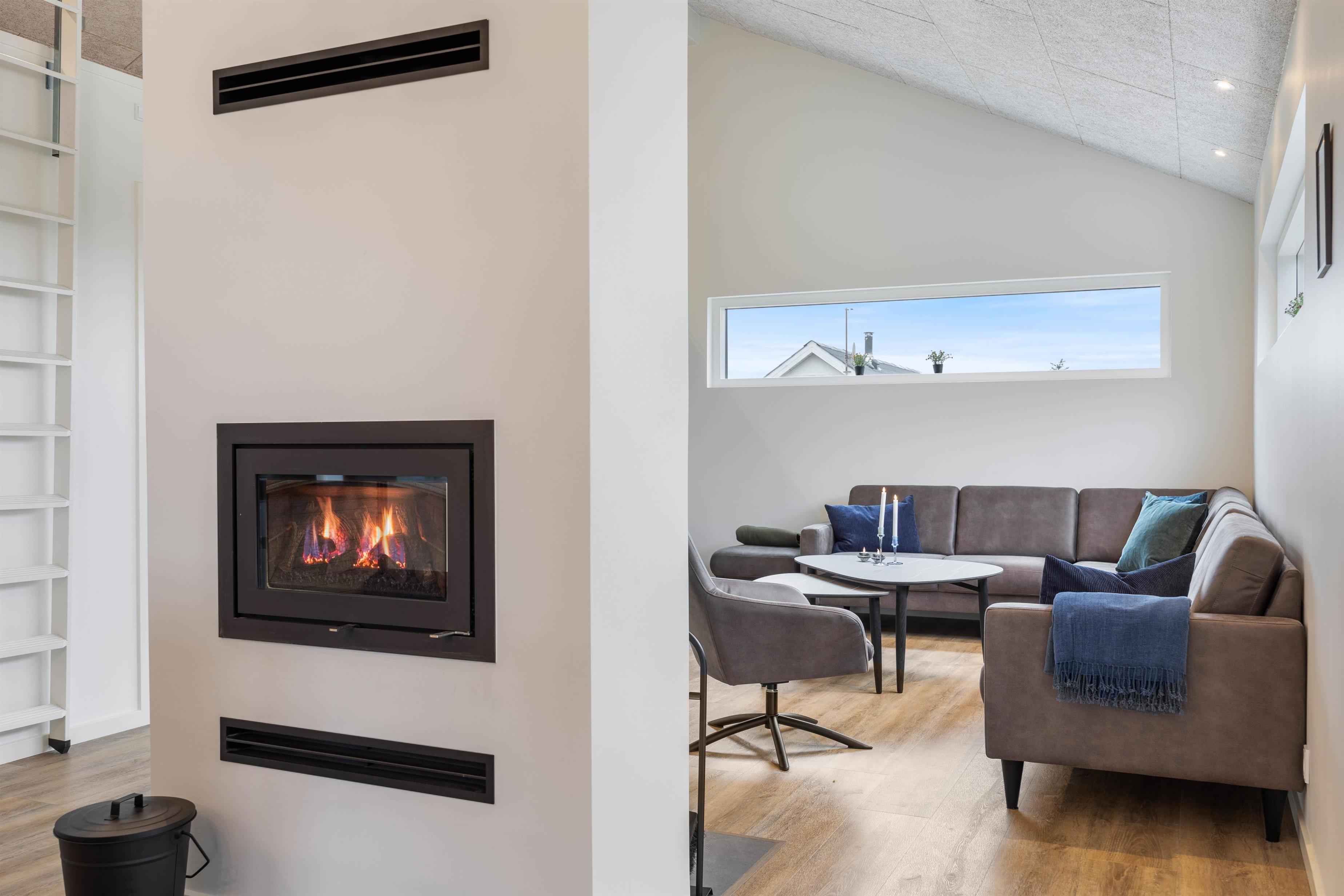 Sommerhusets stue ligger i forlængelse af det veludstyrede køkken, hvor brændeovnen i midten af rummet skaber en fin opdeling af de 2 rum. Her kan I samles til mange hyggelige stunder, mens ilden i brændeovnen giver en behagelig varme og sætter prikken over i’et til feriestemningen.
