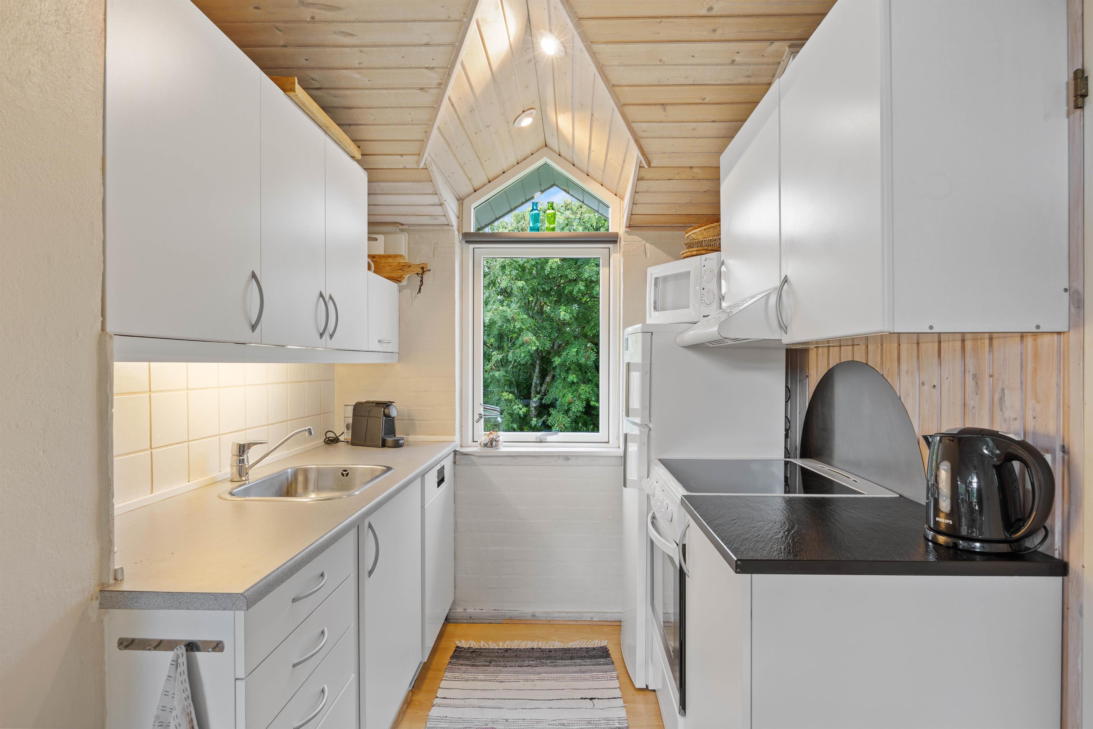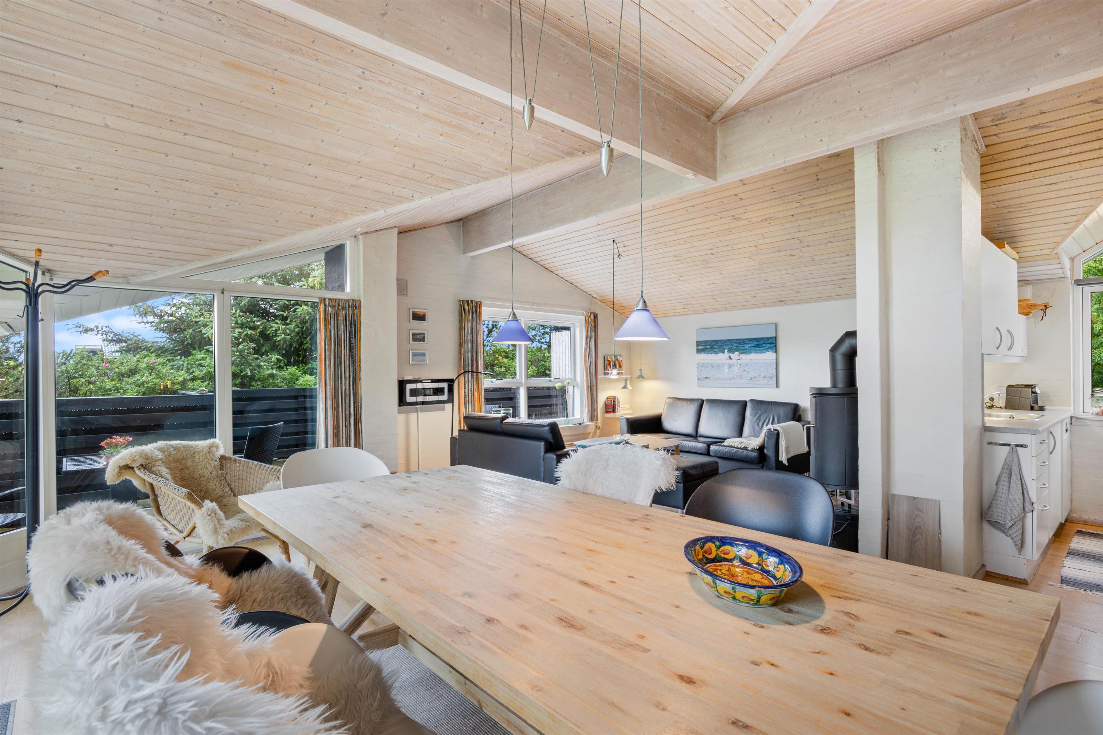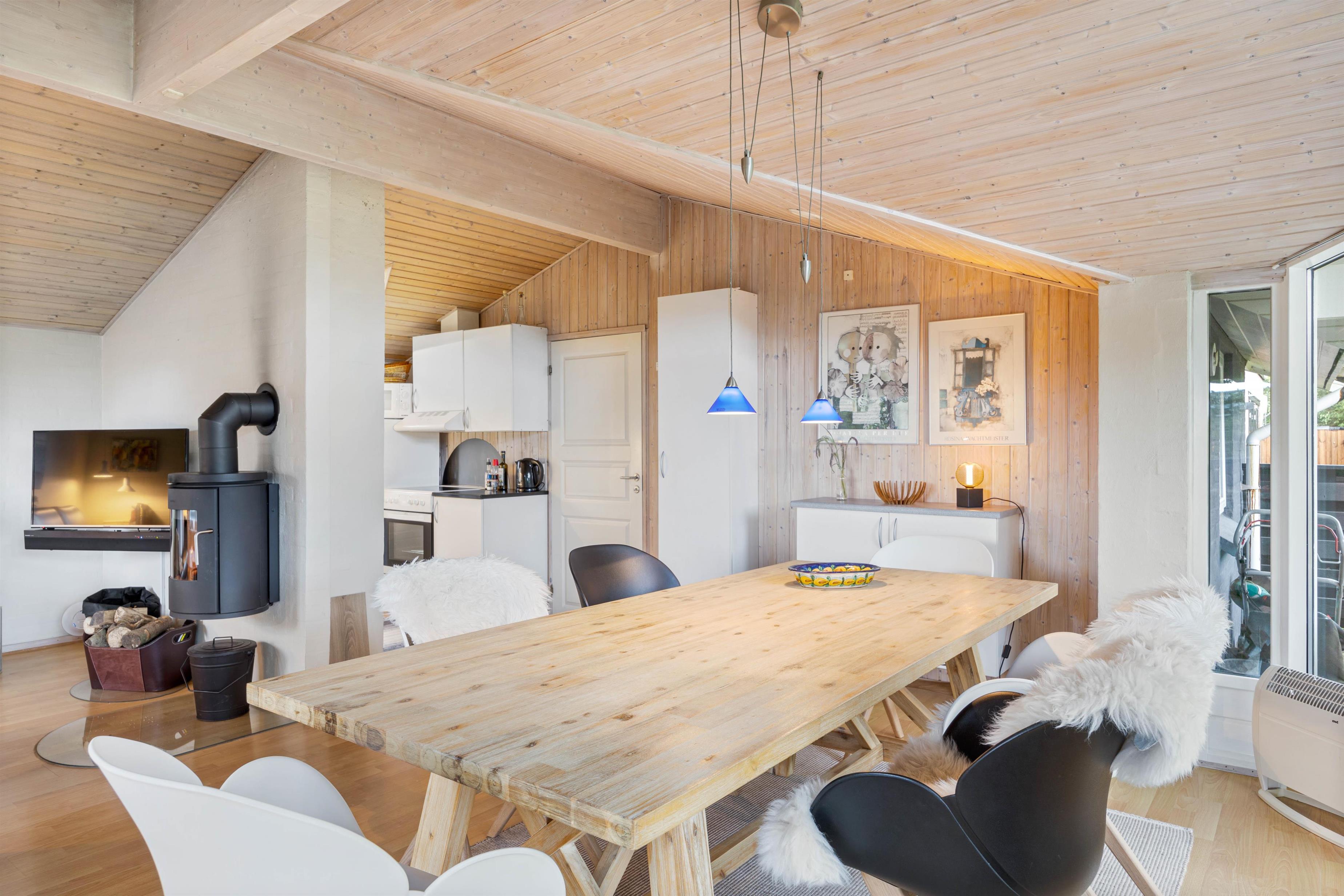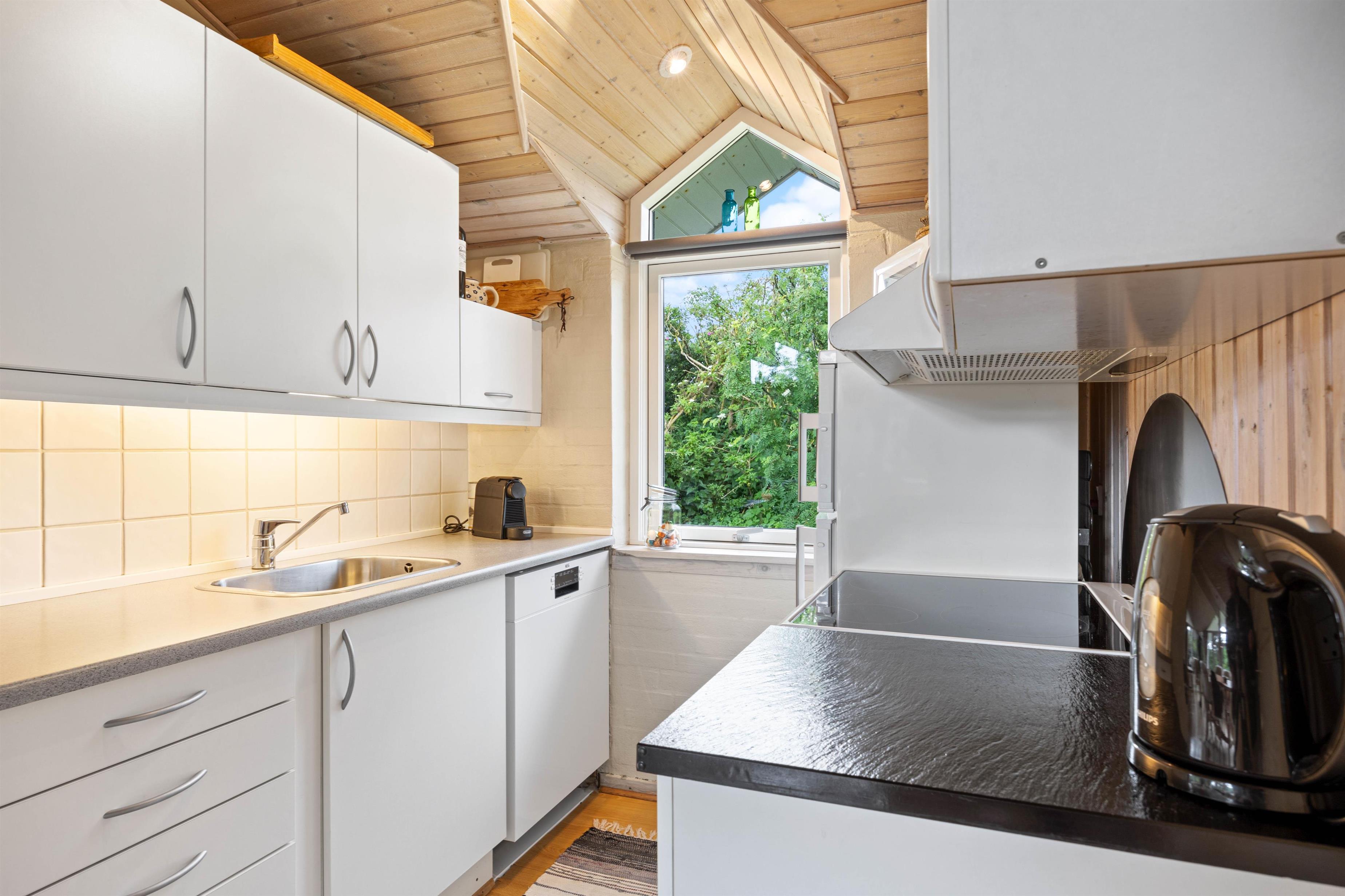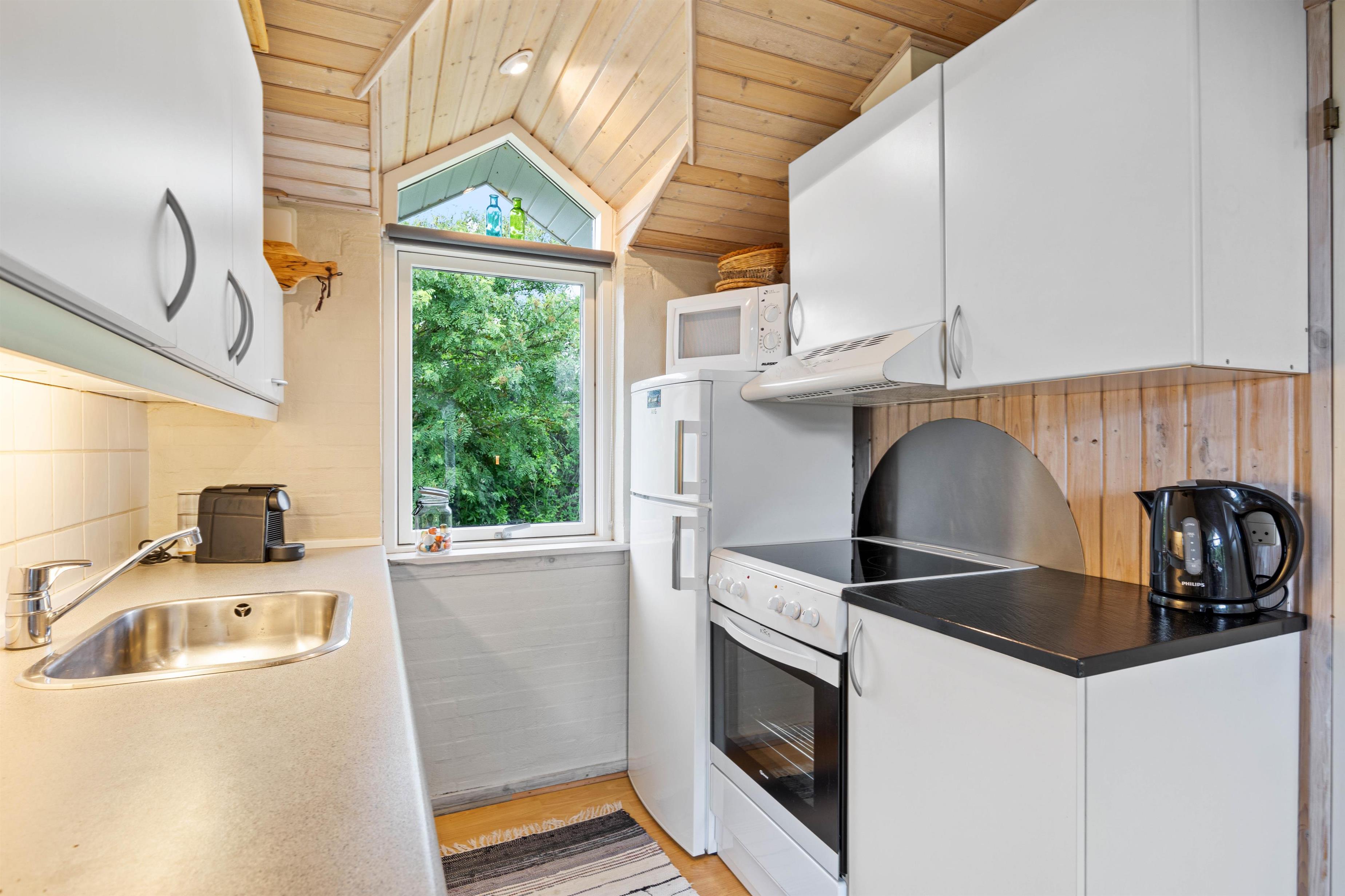 I sommerhuset finder I en rummelig opholdsstue - perfekt til afslappende aftener. Brændeovnen sørger for varme på køligere dage og tilføjer en ekstra portion hygge til ferien. Køkkenet byder på alt, hvad der skal til for at tilberede lækre måltider, og er naturligvis også udstyret med en opvaskemaskine, så opvasken hurtigt er klaret.