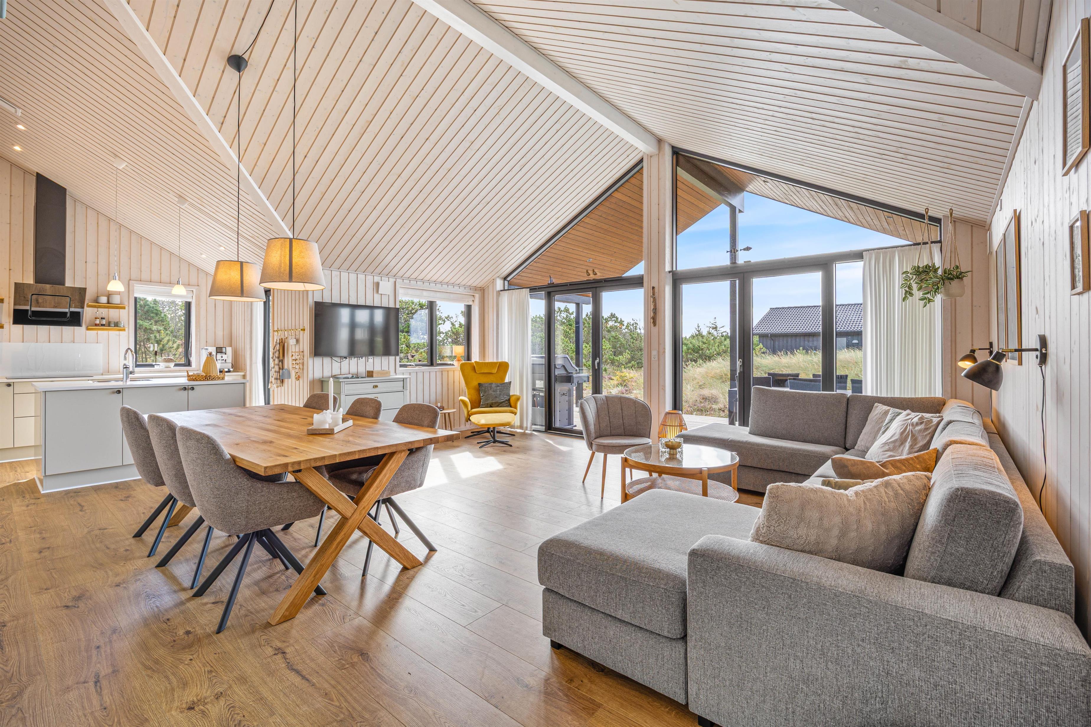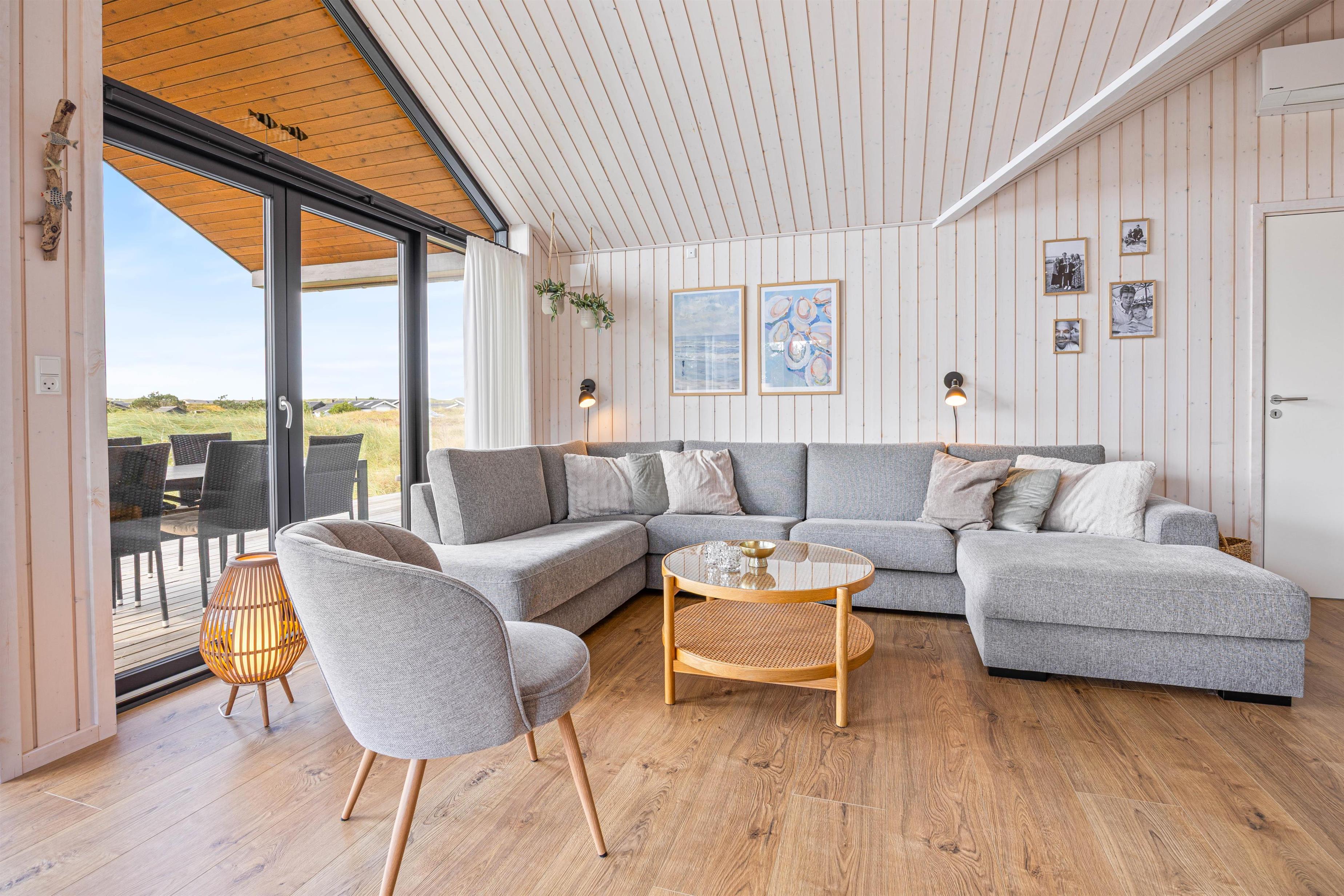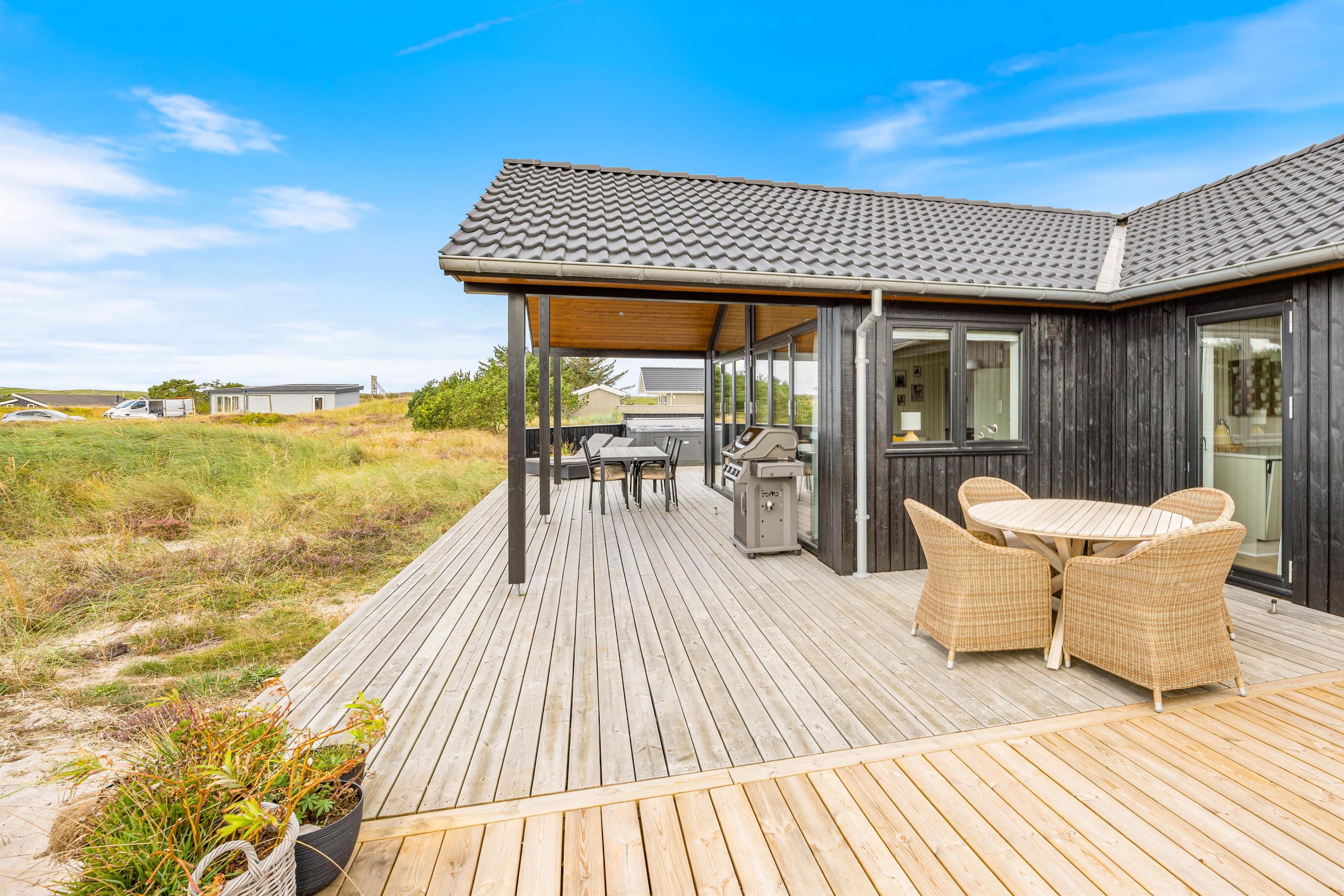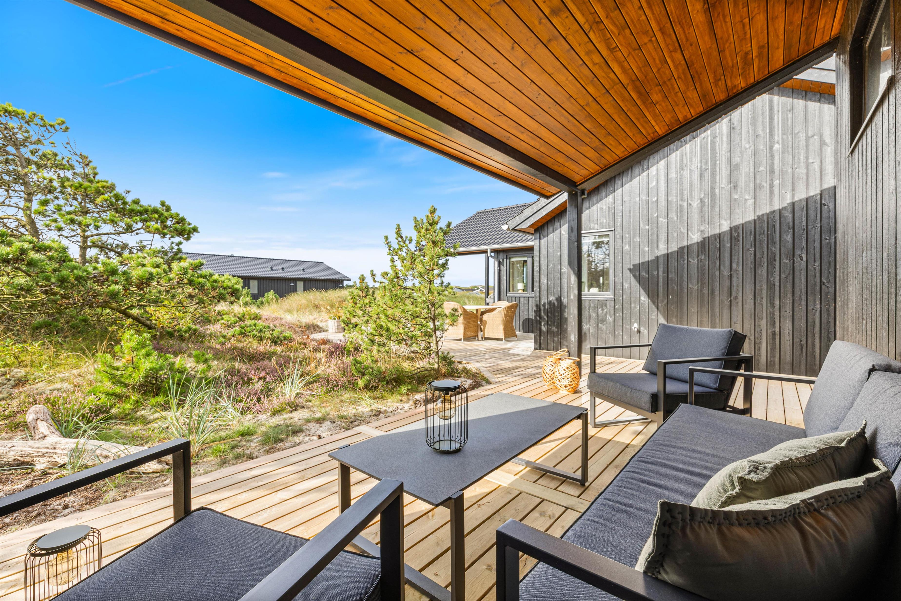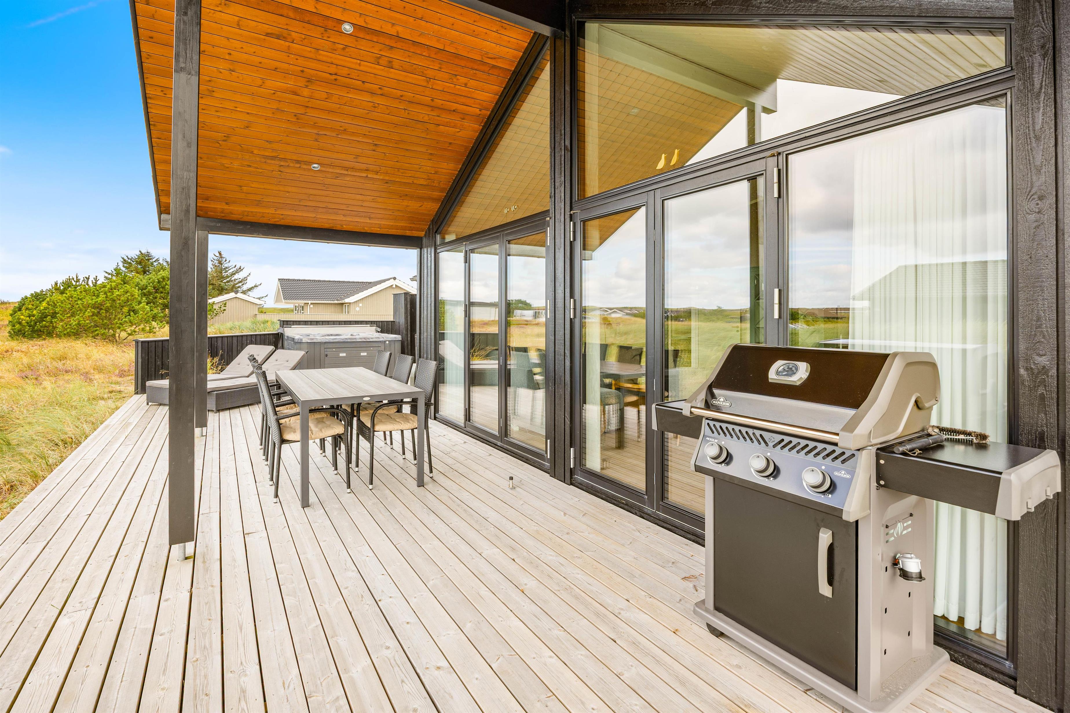Fra stuen, køkkenet og aktivitetsrummet er der udgang til en stor sydvendt og delvist overdækket træterrasse. Terrassen er perfekt til afslapning og nydelse med både udespa og udebruser, som giver en luksuriøs følelse af velvære. På de solrige dage kan I slappe af på solvognene, og om aftenen kan hele familien samles til grillhygge eller brætspil i de lune sommeraftener. Det er et fantastisk sted at skabe uforglemmelige ferieminder, omgivet af den smukke klitnatur.