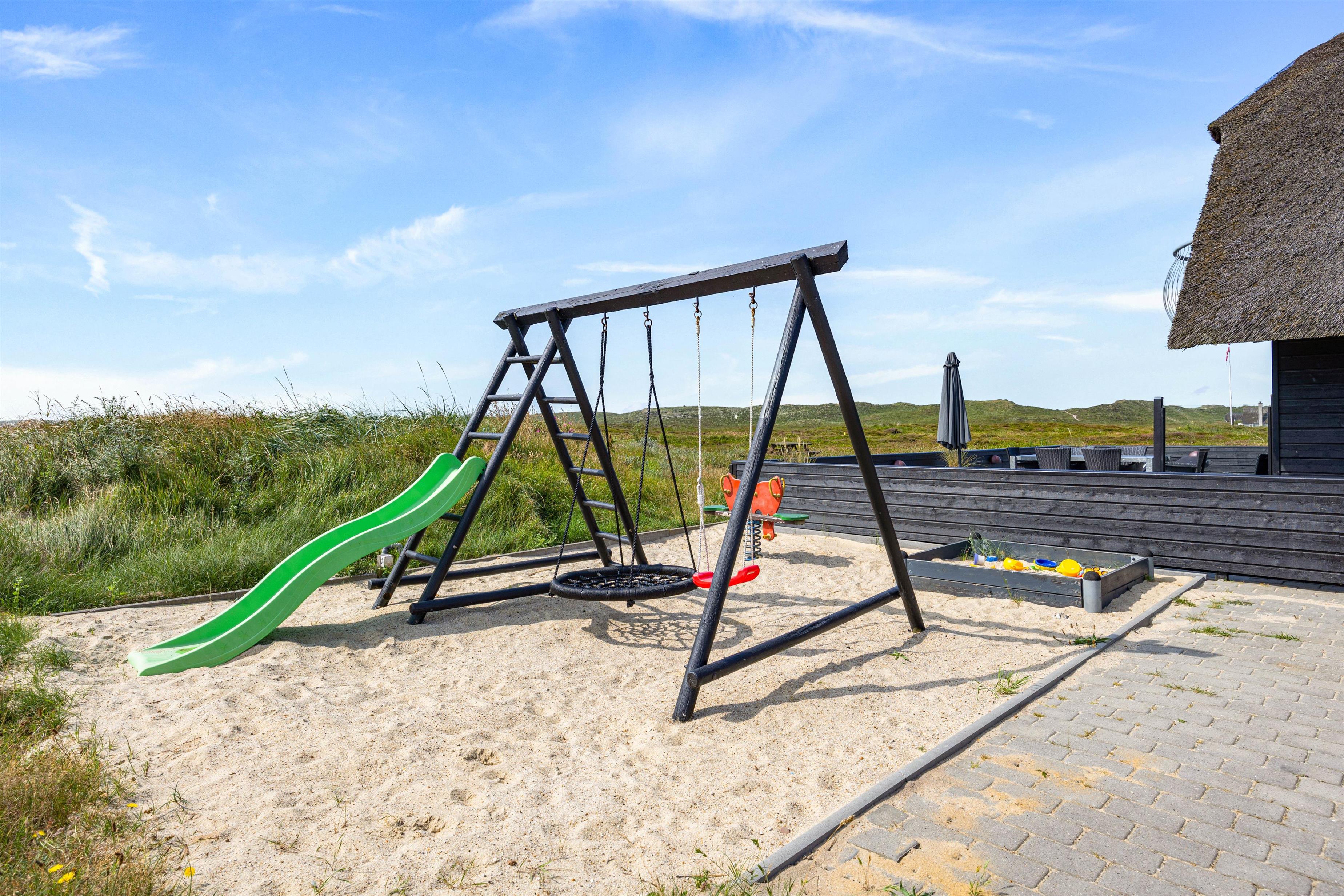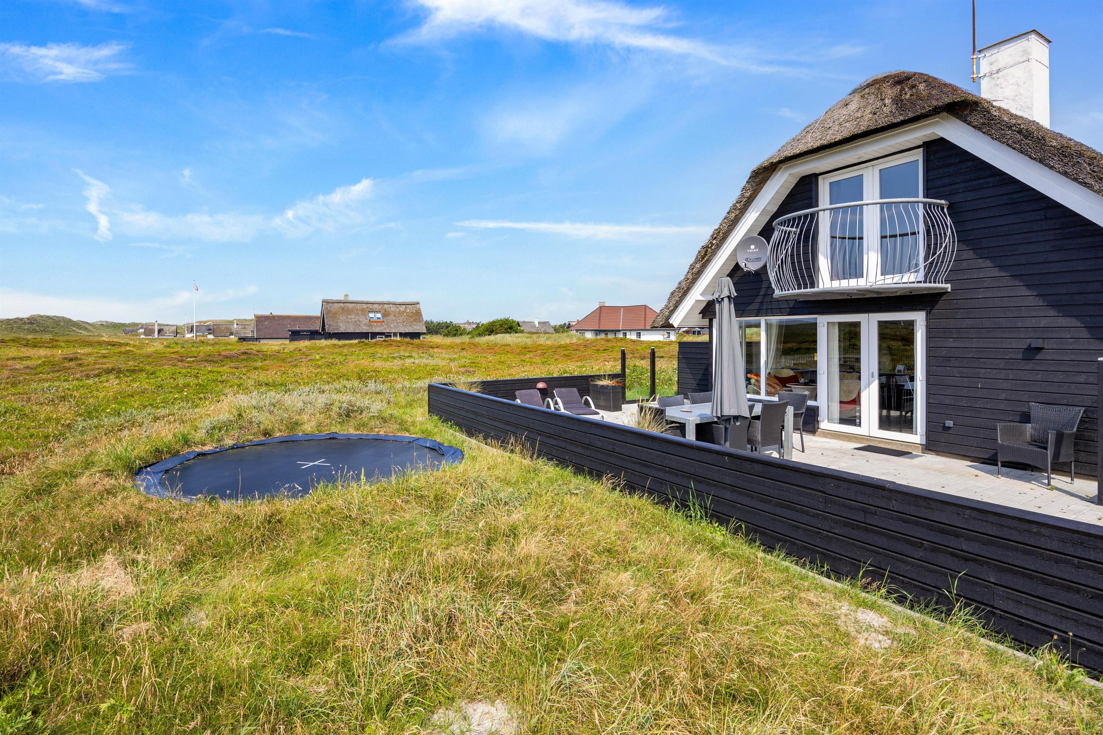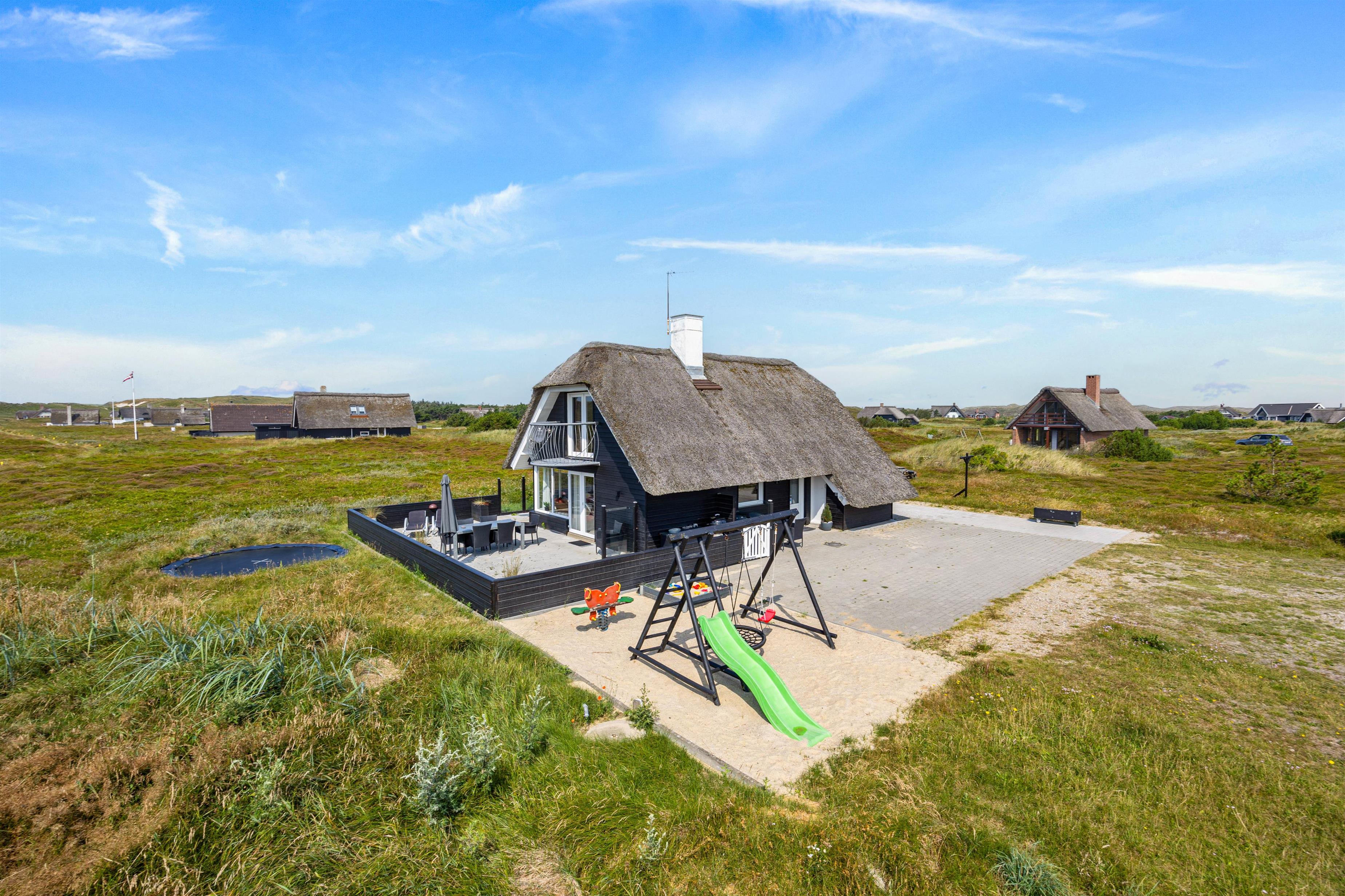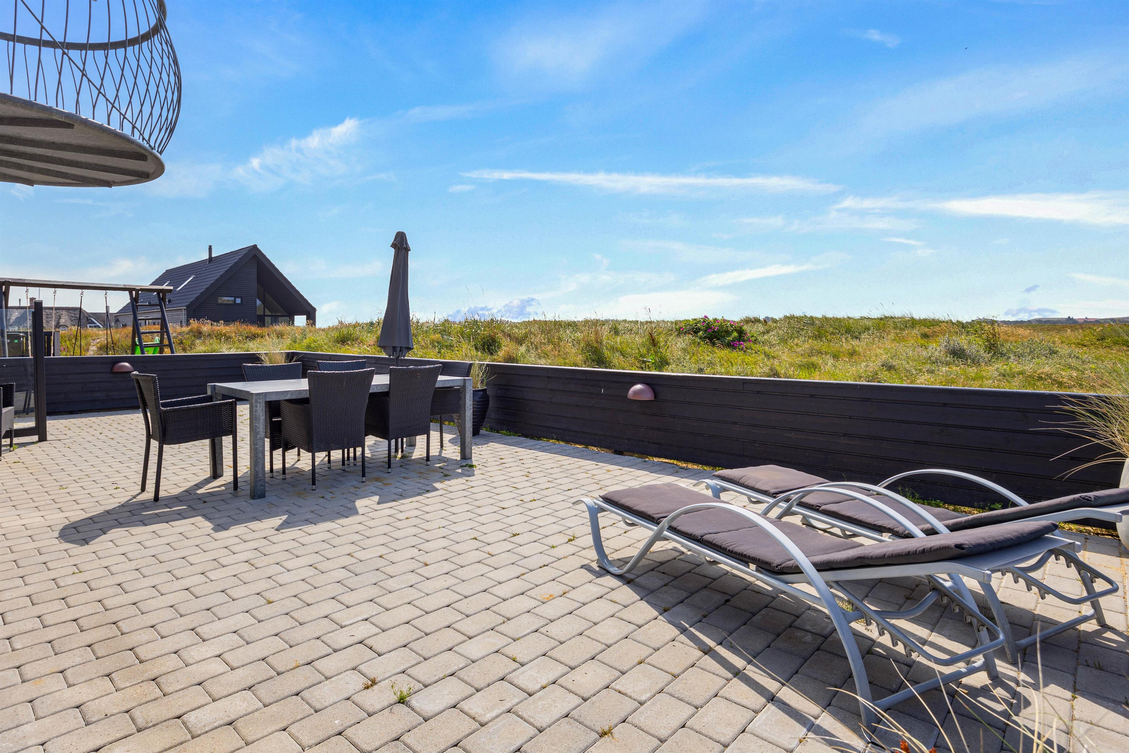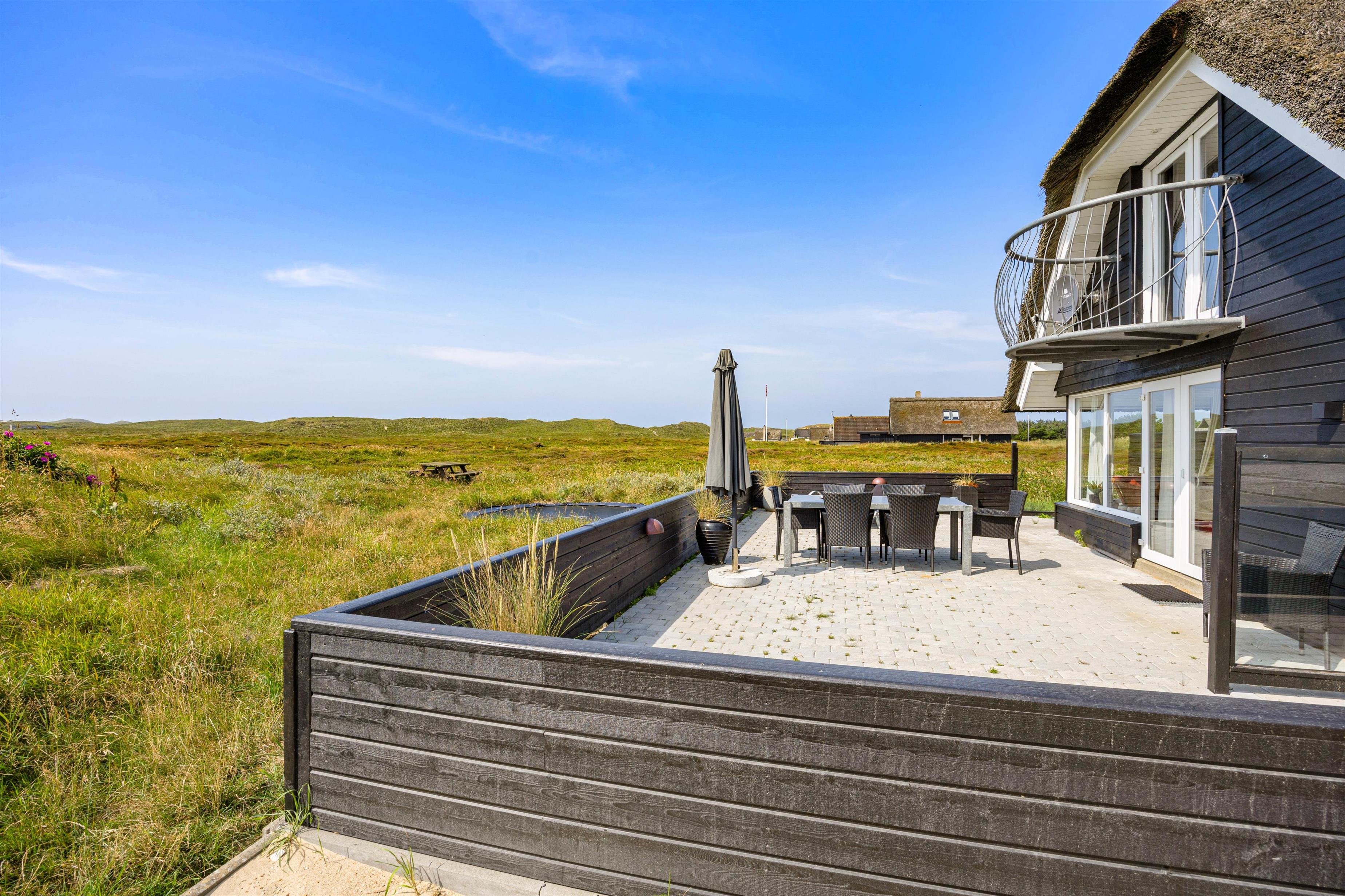 Rundt om huset her på Heden 6 finder I flere hygge og læ-kroge. Den store lukkede terrasse mod sydvest er perfekt til udedagene – her kan I slappe af i liggestolene, mens børn og hunde leger frit.