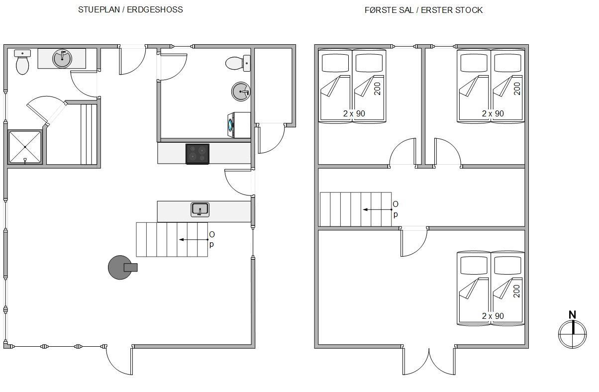 De 6 sovepladser fordeler sig i 3 gode soveværelser med dobbeltseng på første sal, hvor I alle vågner op til den smukke udsigt – enten over hede-landskabet mod syd – eller til viewet over sommerhusområdet mod nord.