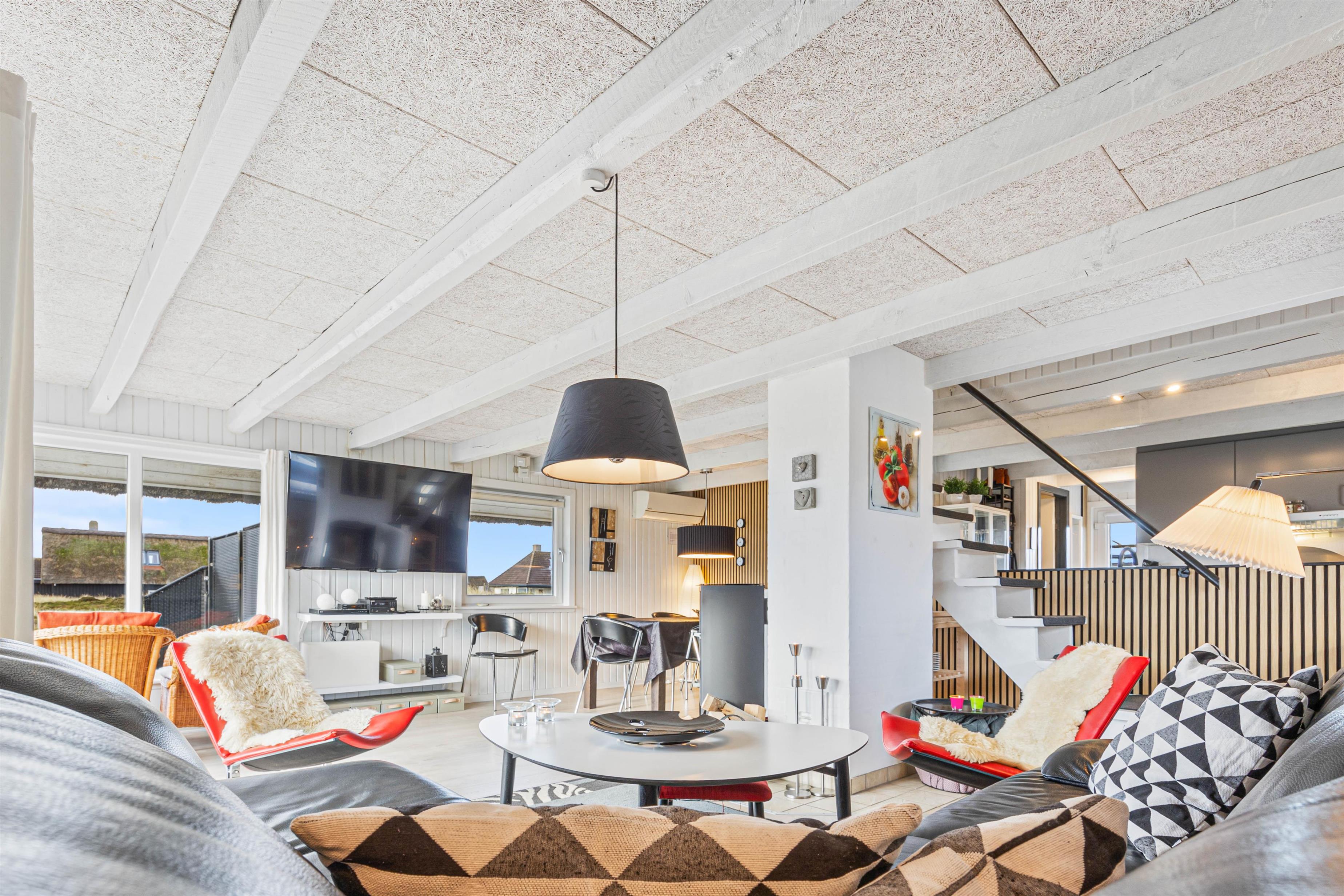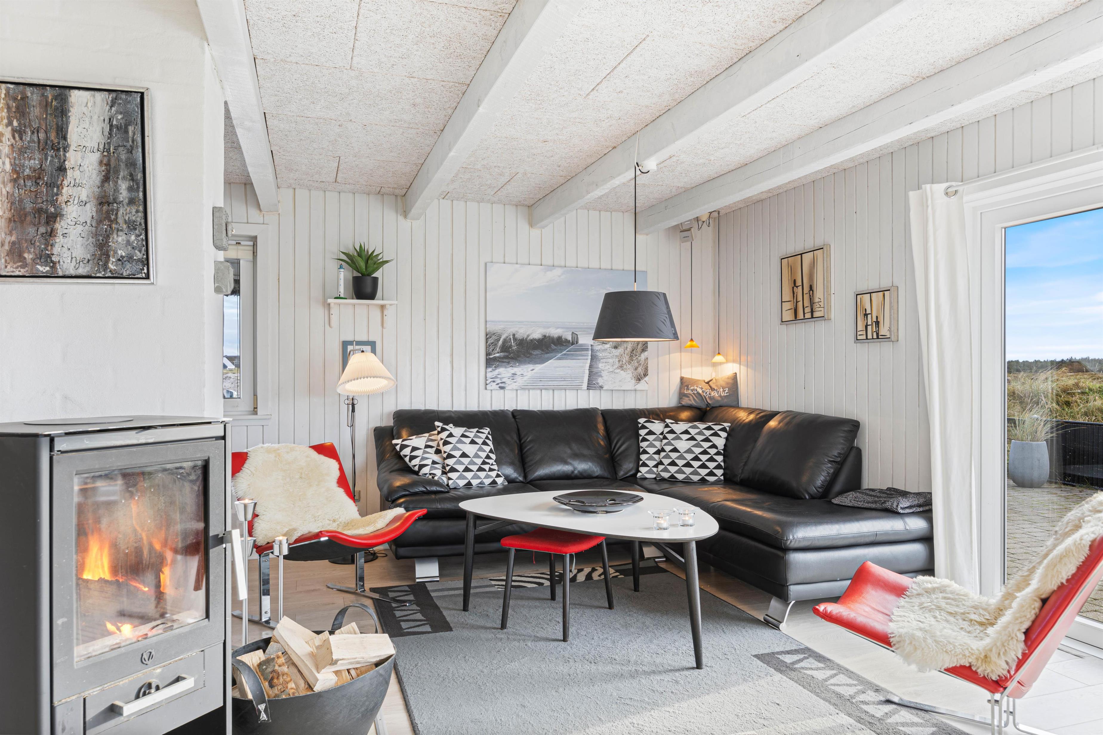 Hvis I kan løsrive jer fra det fantastiske view ud over hede-landskabet og klitterne, kan I slappe af i sofaen med en god bog og en kop kaffe – mens I nyder den knitrende ild i brændeovnen.