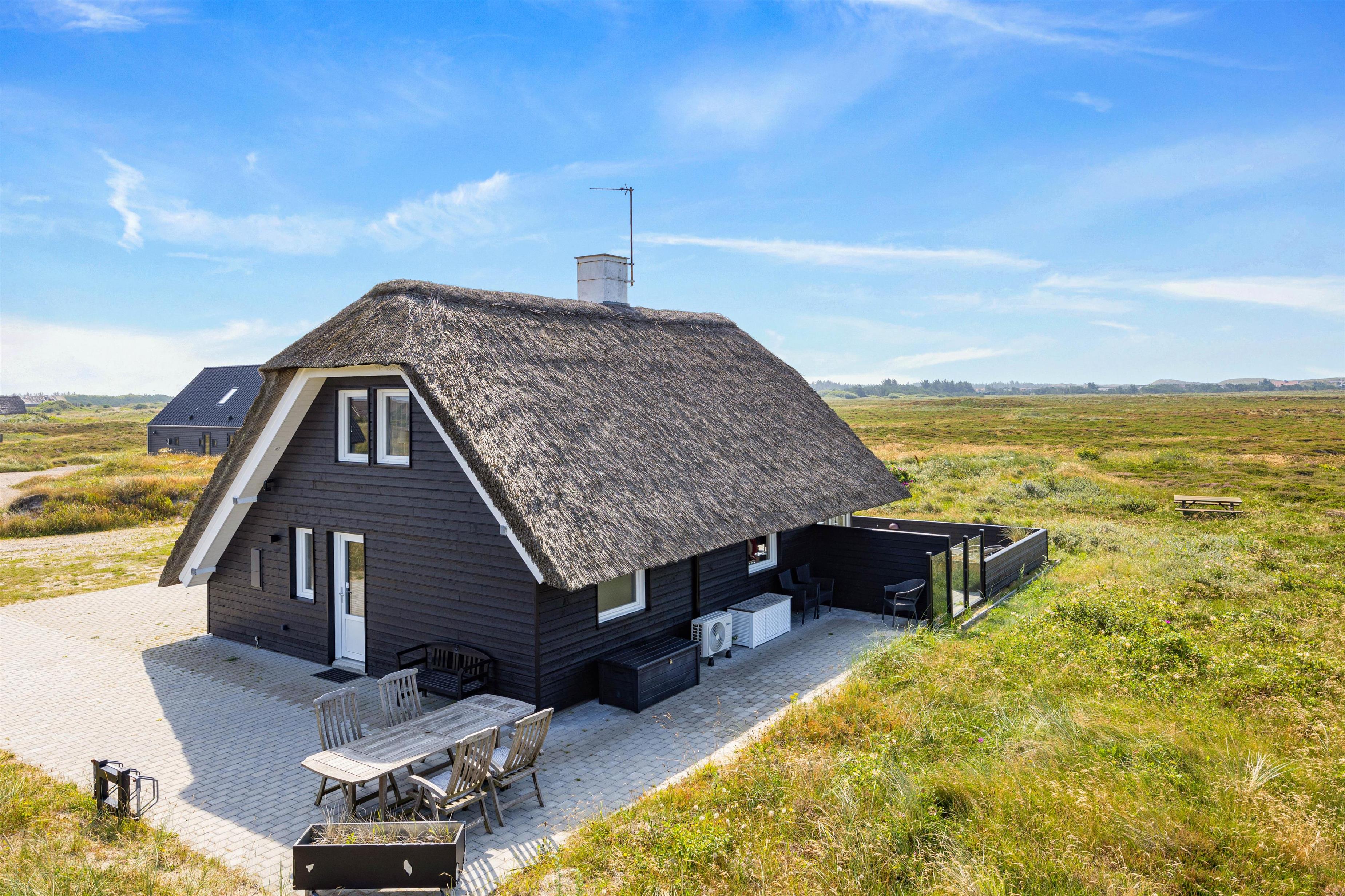 Dette hyggelige træ-sommerhus med stråtag ligger på Heden 6 i den nordlige del af det populære feriehusområde Bjerregård. Sommerhuset vender ud til åbne naturområder med gode stisystemer, som inviterer til gå- og cykelture. Her er plads til 6 personer og både brændeovn og sauna – perfekt til en ferie i den vestjyske natur.