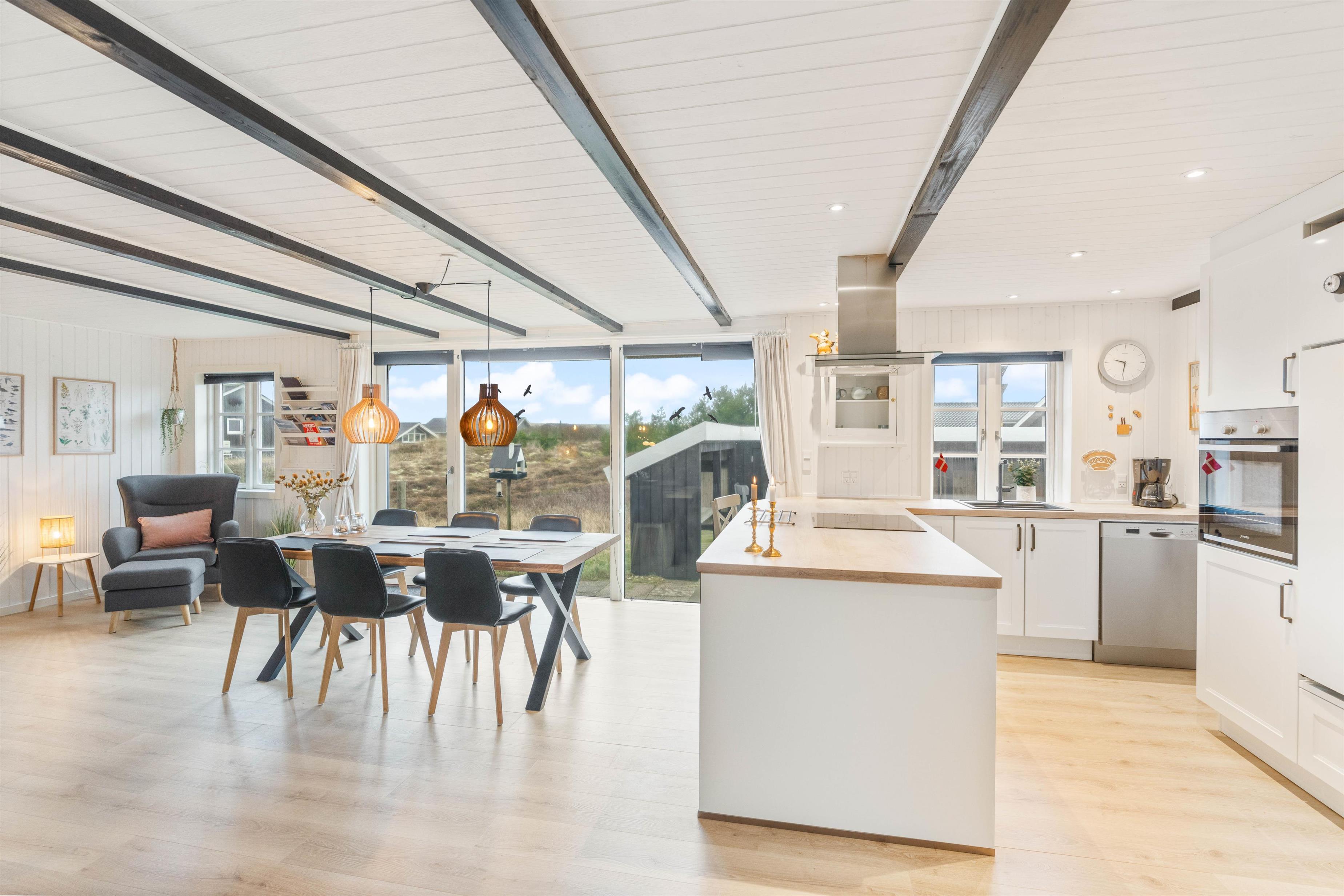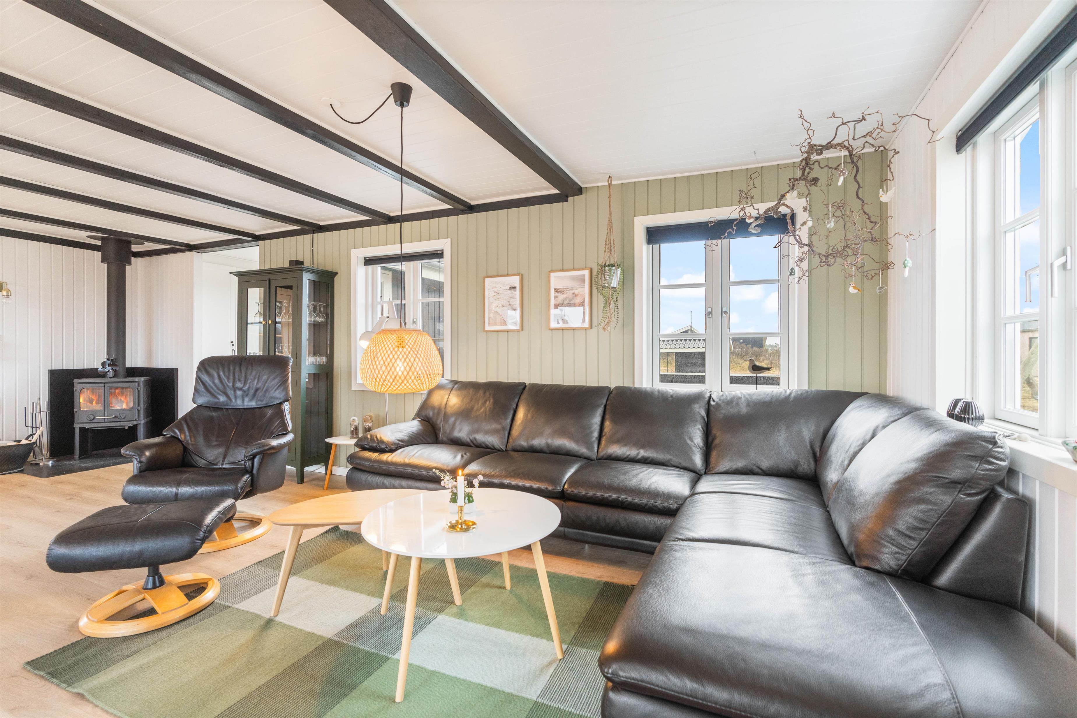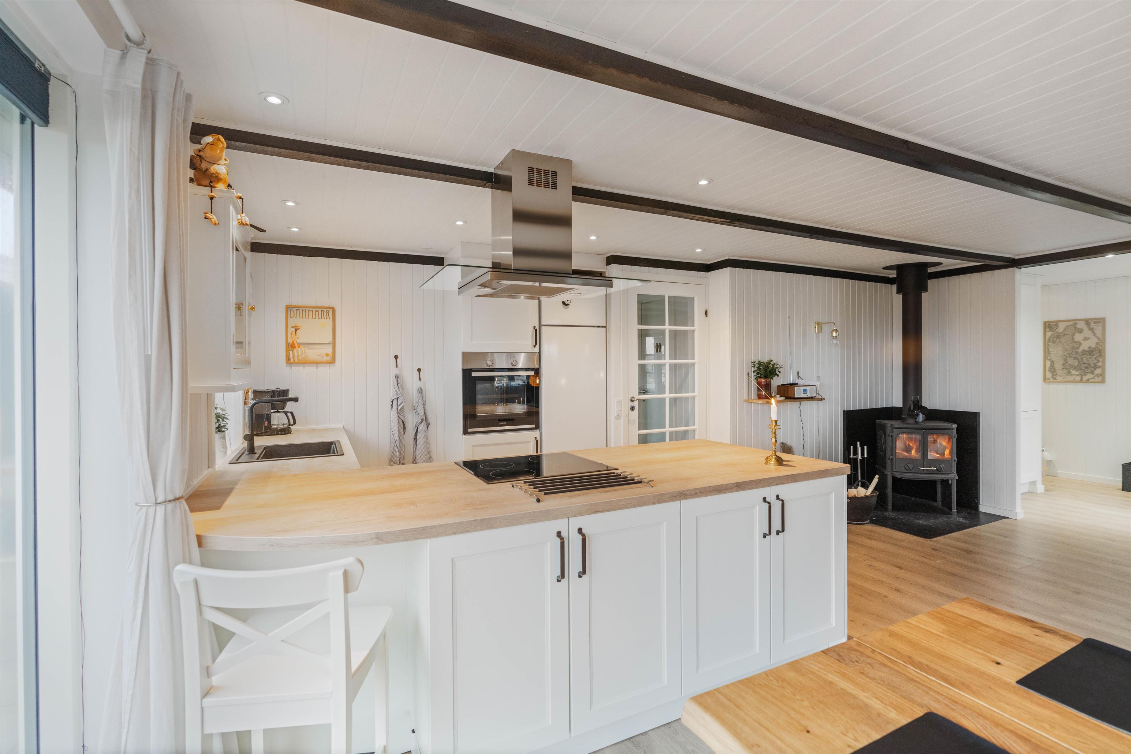 Samlingspunktet i feriehuset er det rummelige opholdsrum, der ligger i åben forbindelse med køkkenet. Her er der plads til hele familien, som kan samles til en hyggelig aften med et spil kort, mens brændeovnen knitrer i baggrunden. Her er også en varmepumpe, som I med fordel kan benytte jer af.