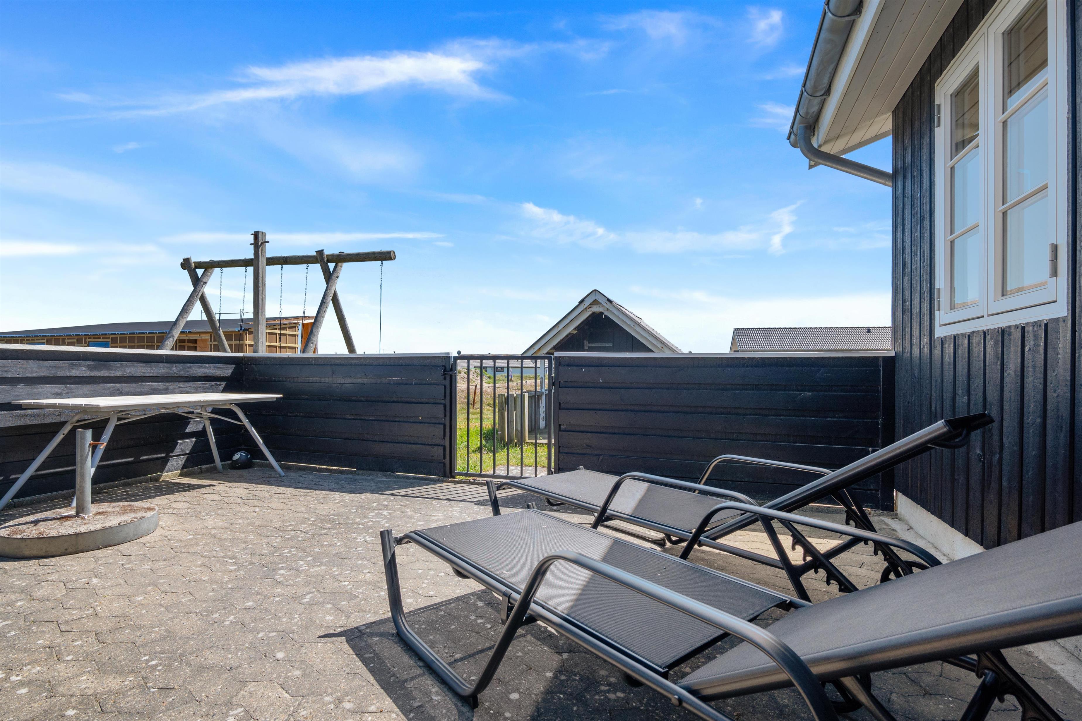 Sommerhuset har også en sydvendt terrasse, hvor dagen kan nydes, mens børnene leger på naturgrunden, der både har gyngestativ, sandkasse og trampolin. Den sydvendte terrasse er lukket, så her kan hunden gå frit rundt.
