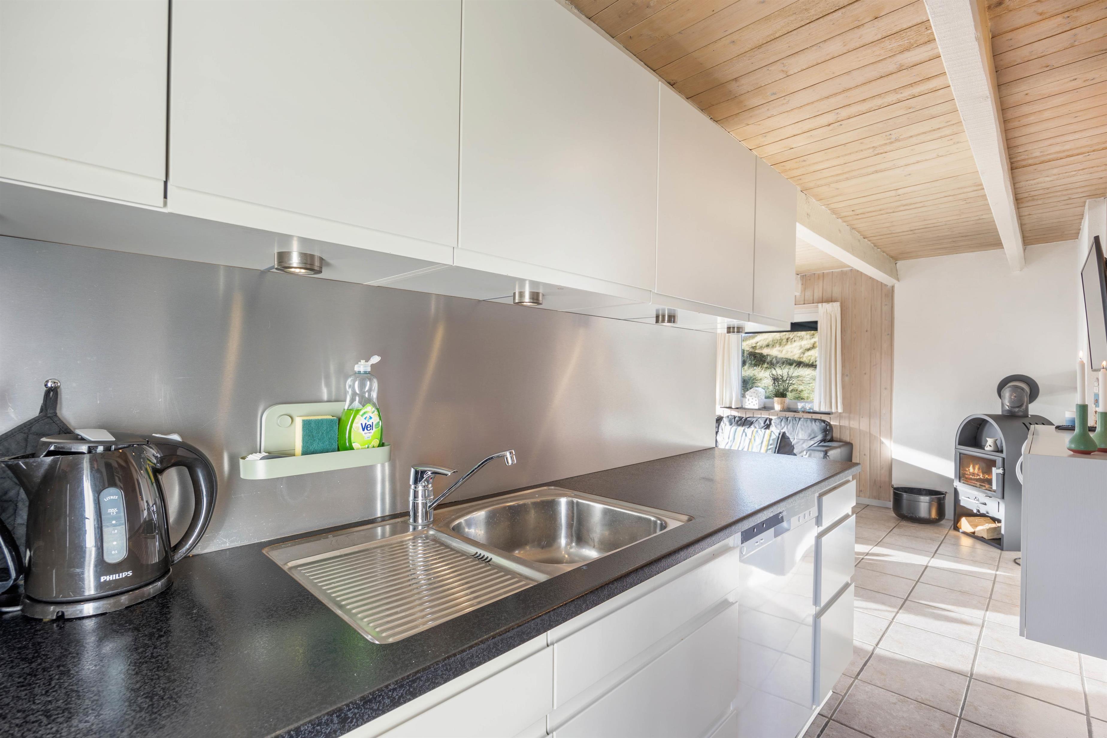 Sommerhuset har et veludstyret køkken med bl.a opvaskemaskine og mikroovn. Køkkenet står i åben forbindelse med stuen, som er pænt indrettet med gode møbler og brændeovn. Der er klinkegulv i stuen og køkkenet.