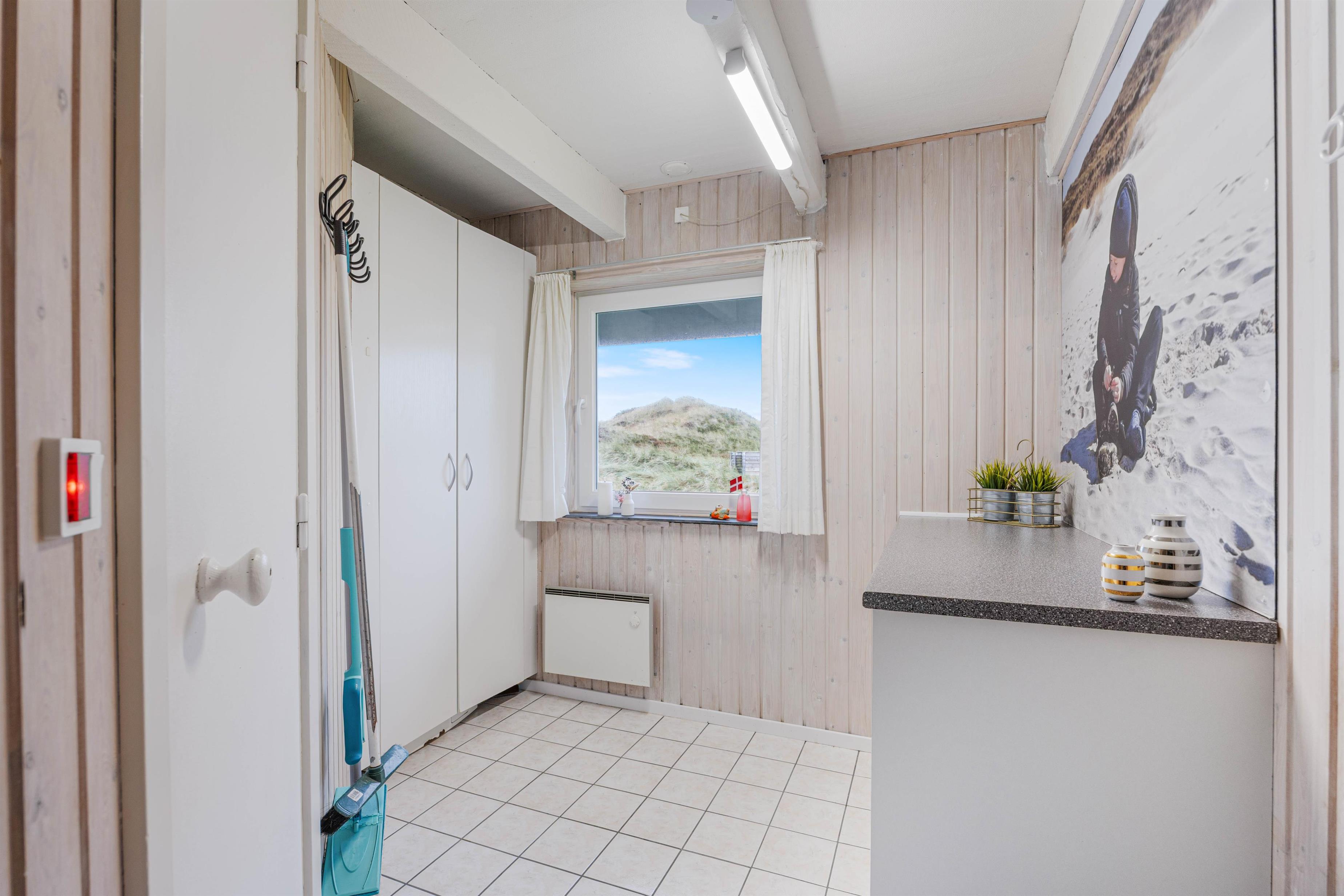 I stueetagen er der et godt badeværelse med bruser og gulvvarme samt indgang til feriehusets sauna. Varmen i saunaen er helt perfekt til aflsapning og velvære efter en god gåtur i den friske havluft. Derudover er der både vaskemaskine og tørretumbler i feriehuset.