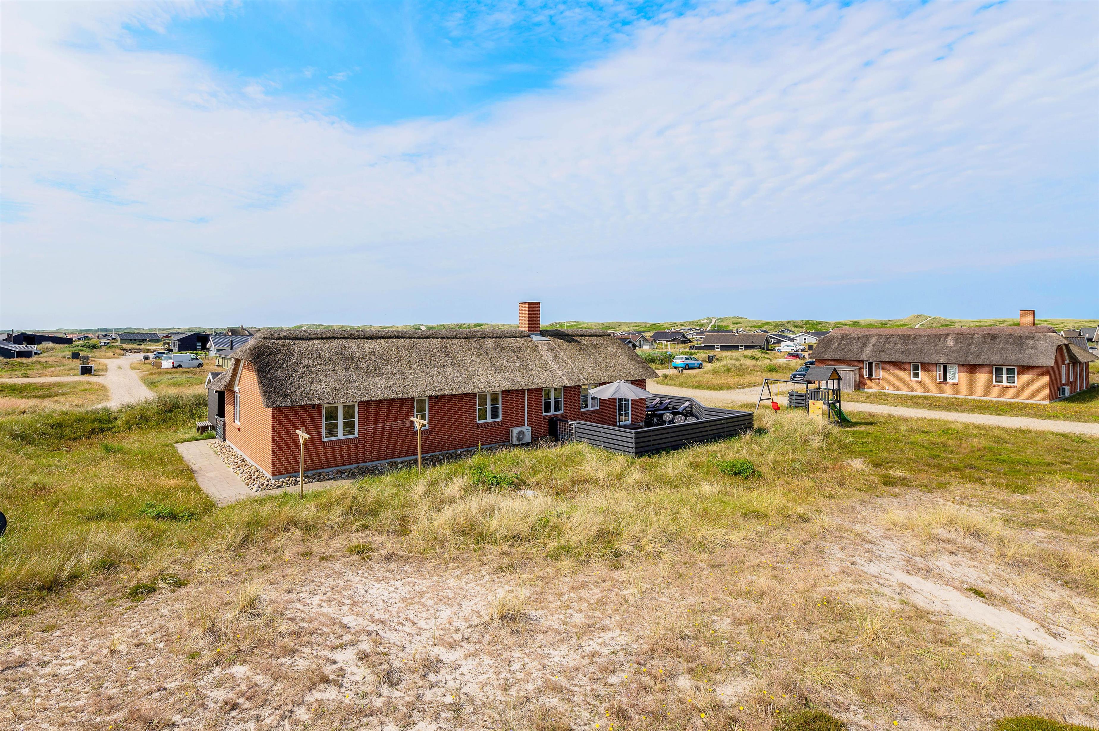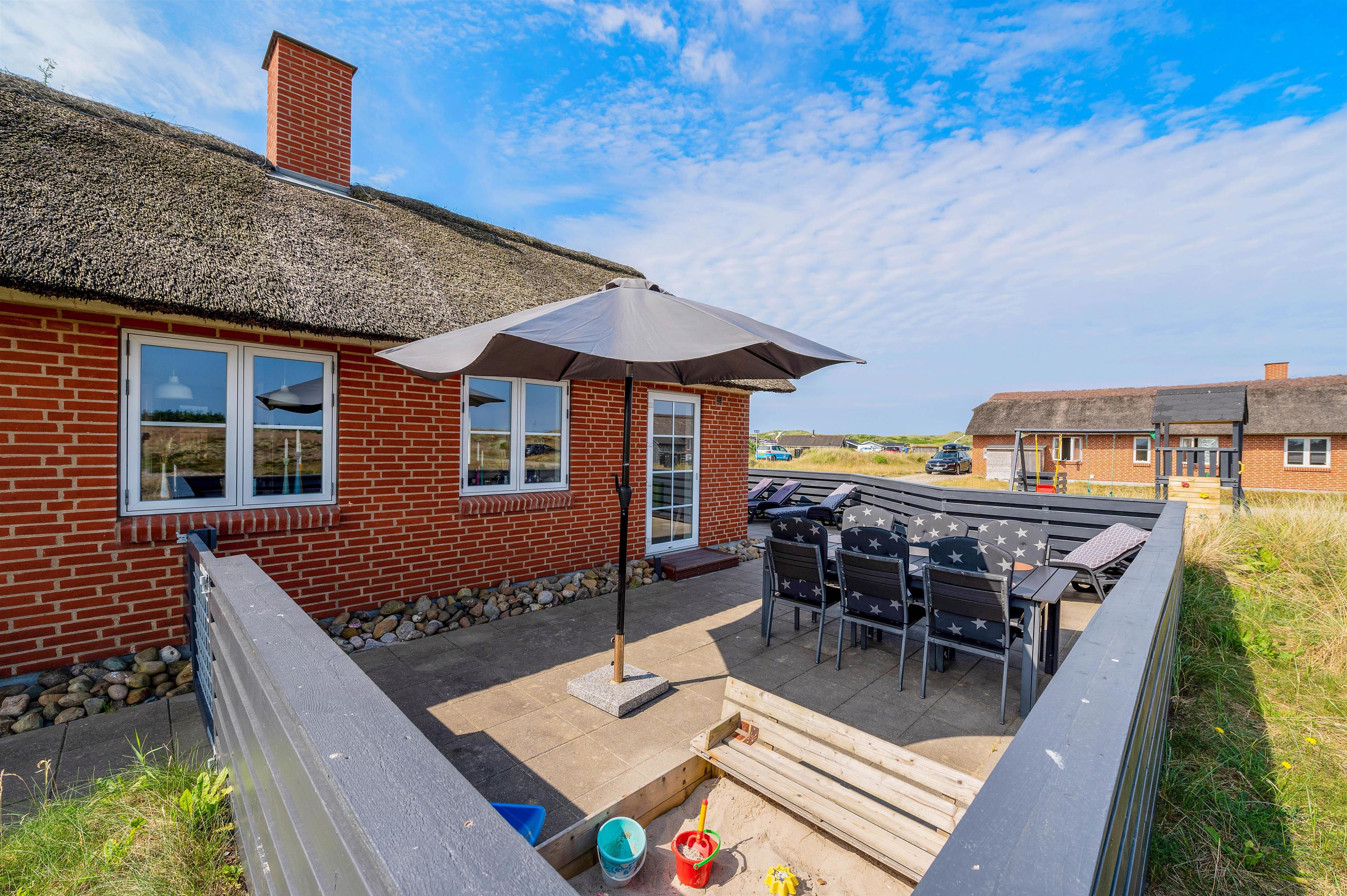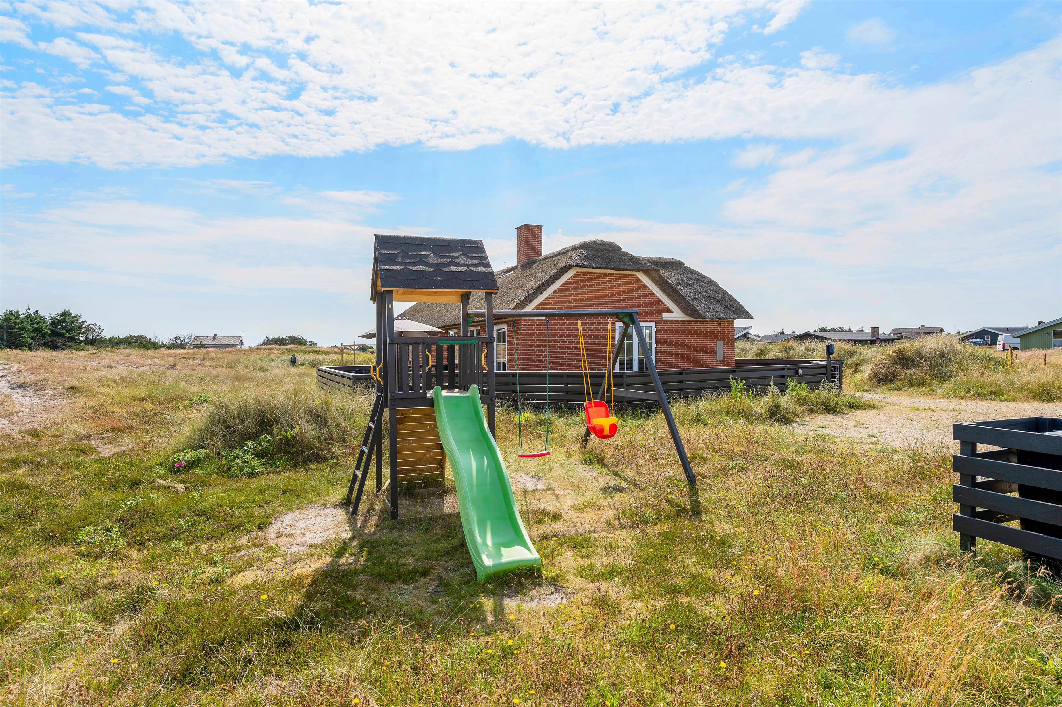 Dette smukke, velindrettede luksushus ligger midt i den skønne natur i Bjerregård. Kun 350 meter til stranden og et stenkast fra et stort ubebygget hedeområde, som indbyder til lange gåture eller blot kan nydes fra terrassen. Rundt om huset er der nemlig en fliseterrasse, hvor aftensolen kan nydes under et måltid, som er blevet tilberedt på grillen. Imens de voksne nyder et glad vin, kan hundene løbe frit rundt på den indhegnede terrasse og børnene hygge sig i sandkassen eller ved det lille legetårn, der er få skridt fra huset.