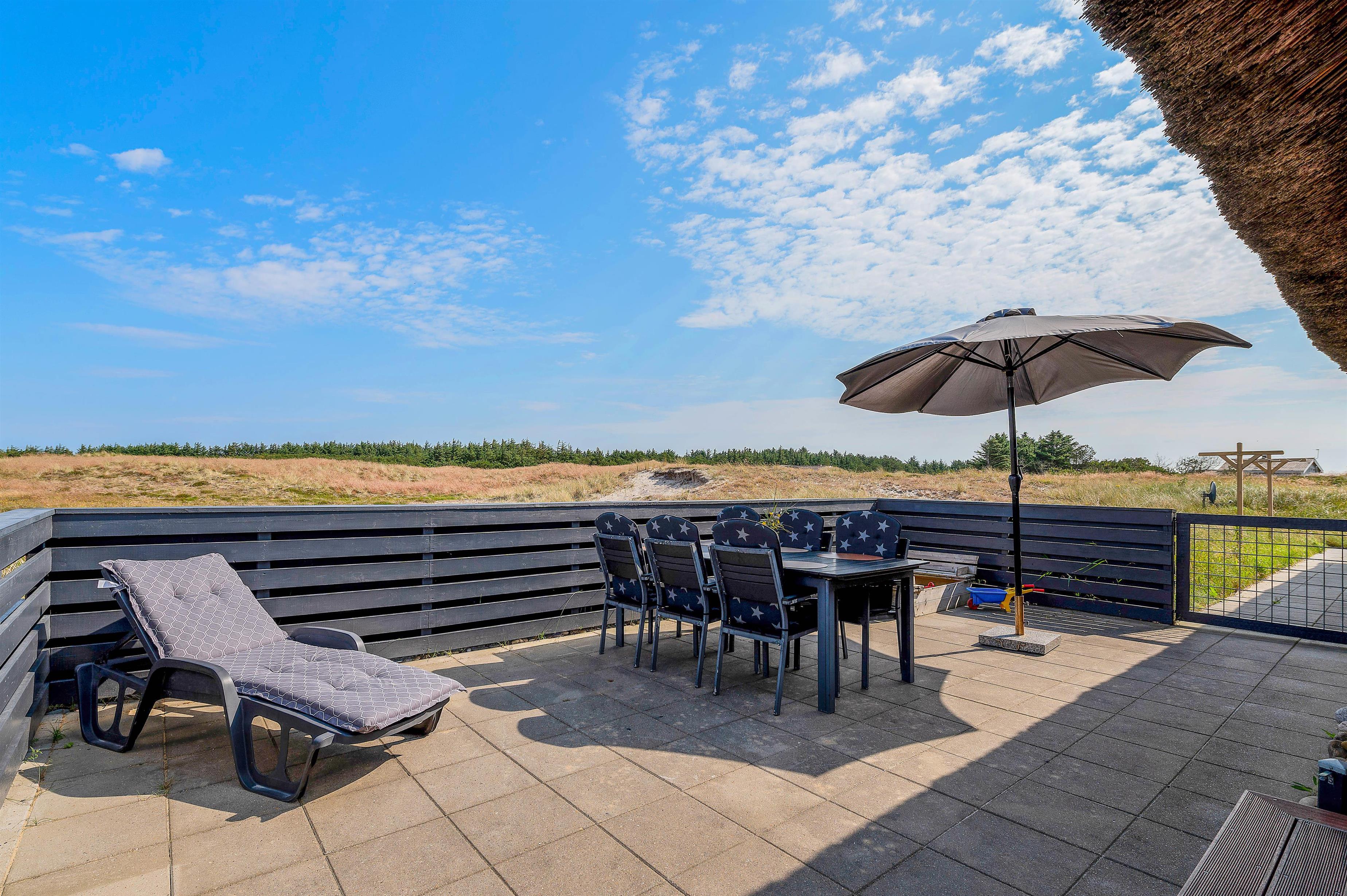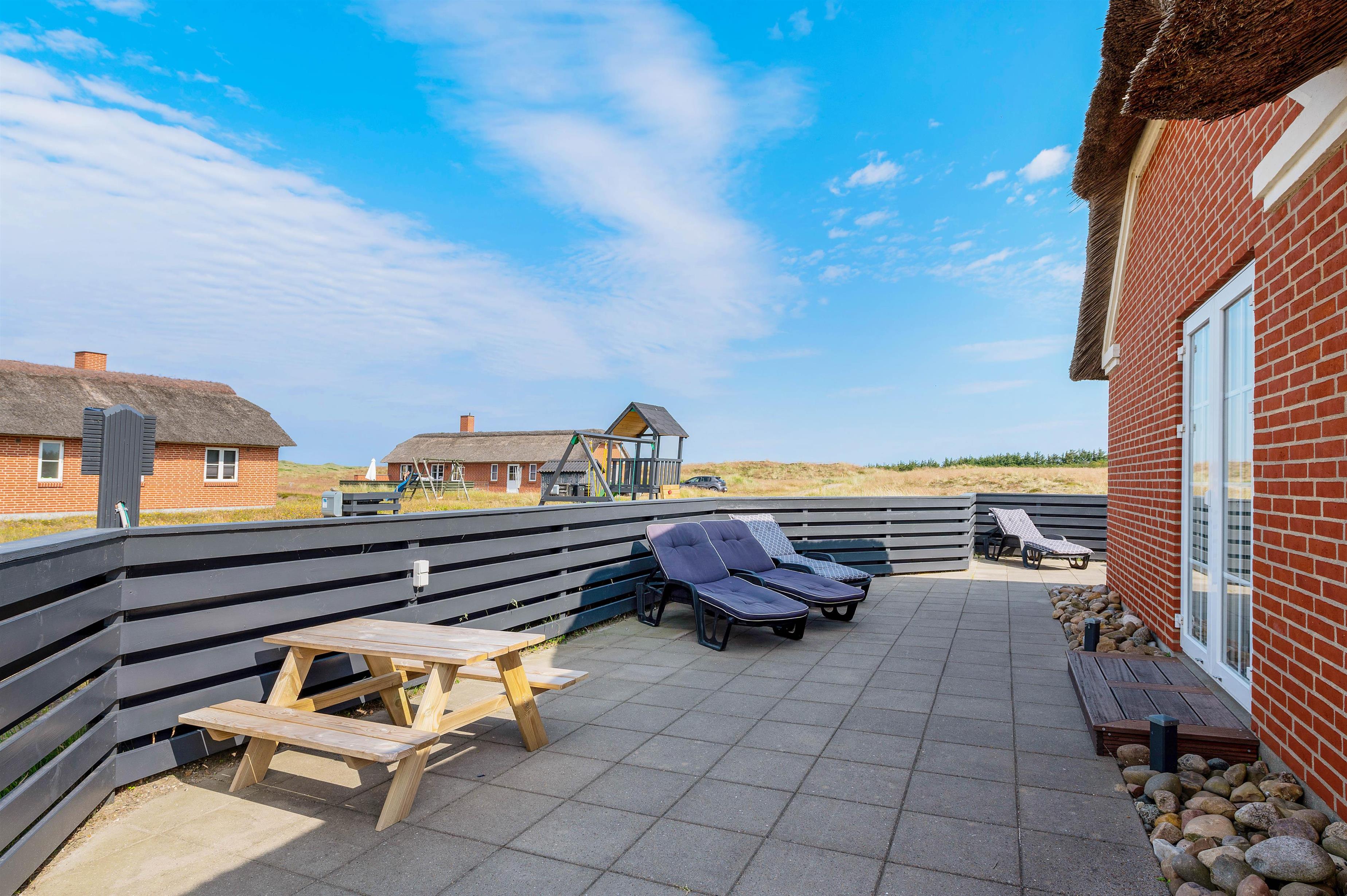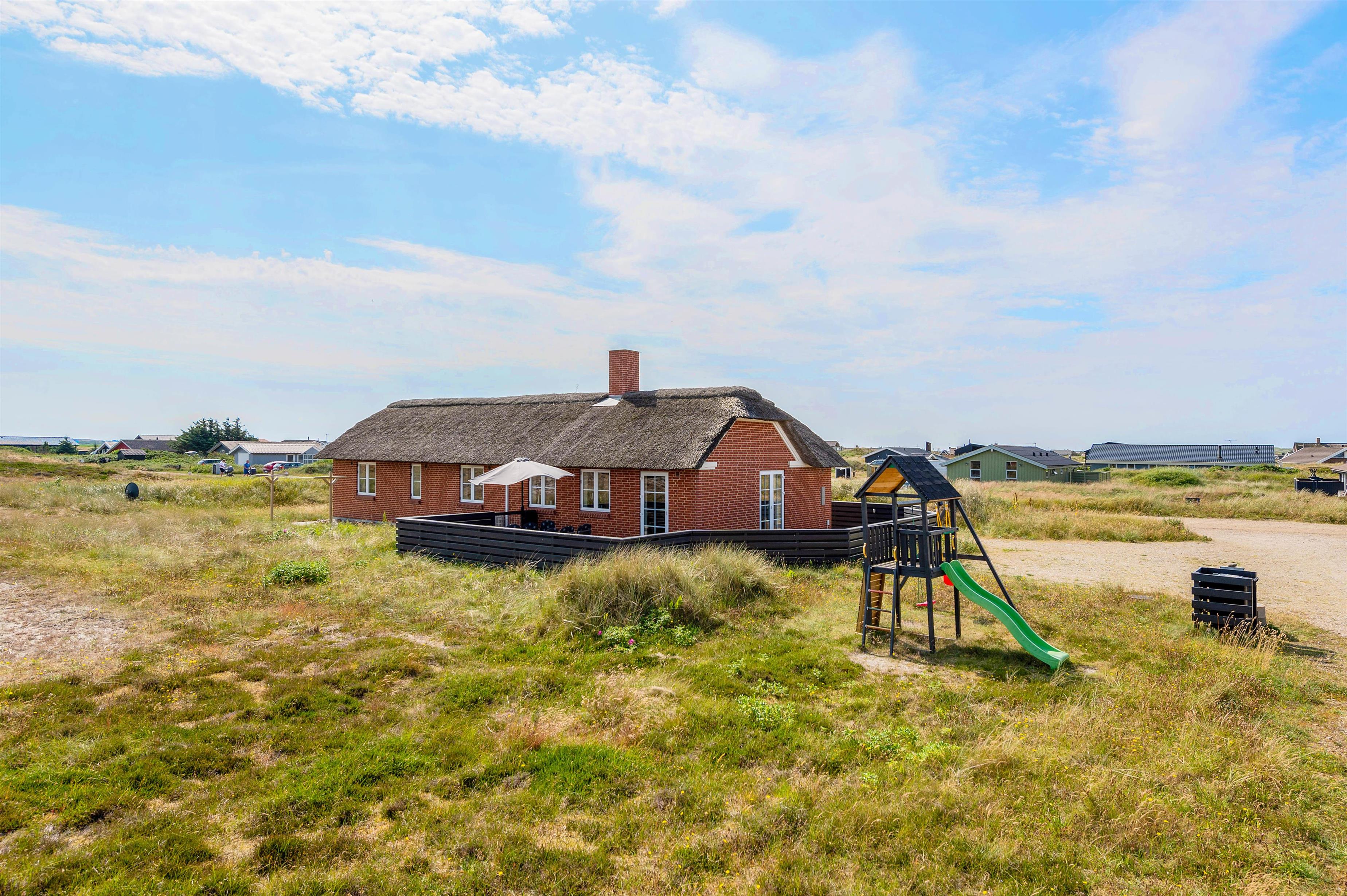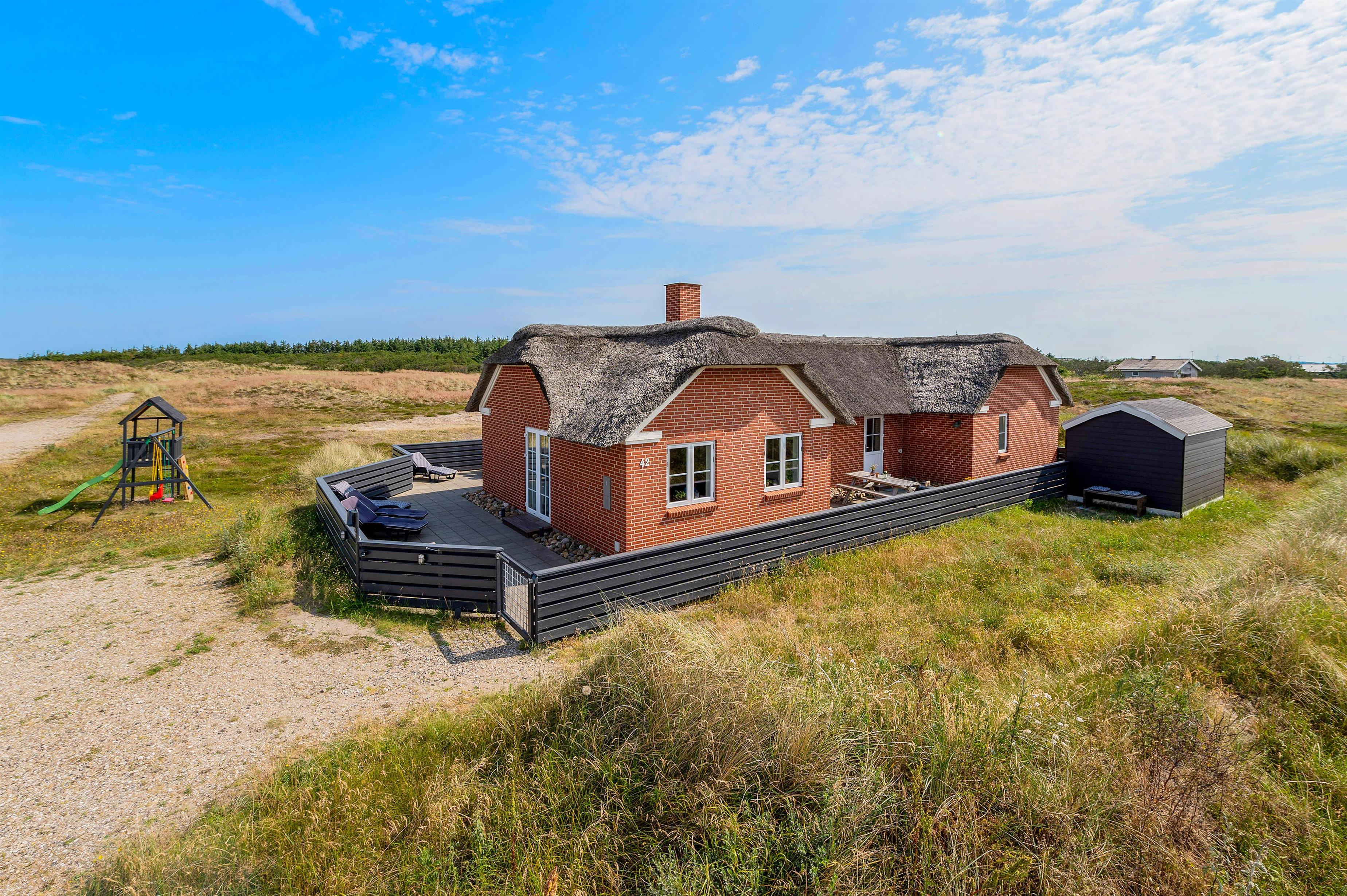 Dette smukke, velindrettede luksushus ligger midt i den skønne natur i Bjerregård. Kun 350 meter til stranden og et stenkast fra et stort ubebygget hedeområde, som indbyder til lange gåture eller blot kan nydes fra terrassen. Rundt om huset er der nemlig en fliseterrasse, hvor aftensolen kan nydes under et måltid, som er blevet tilberedt på grillen. Imens de voksne nyder et glad vin, kan hundene løbe frit rundt på den indhegnede terrasse og børnene hygge sig i sandkassen eller ved det lille legetårn, der er få skridt fra huset.