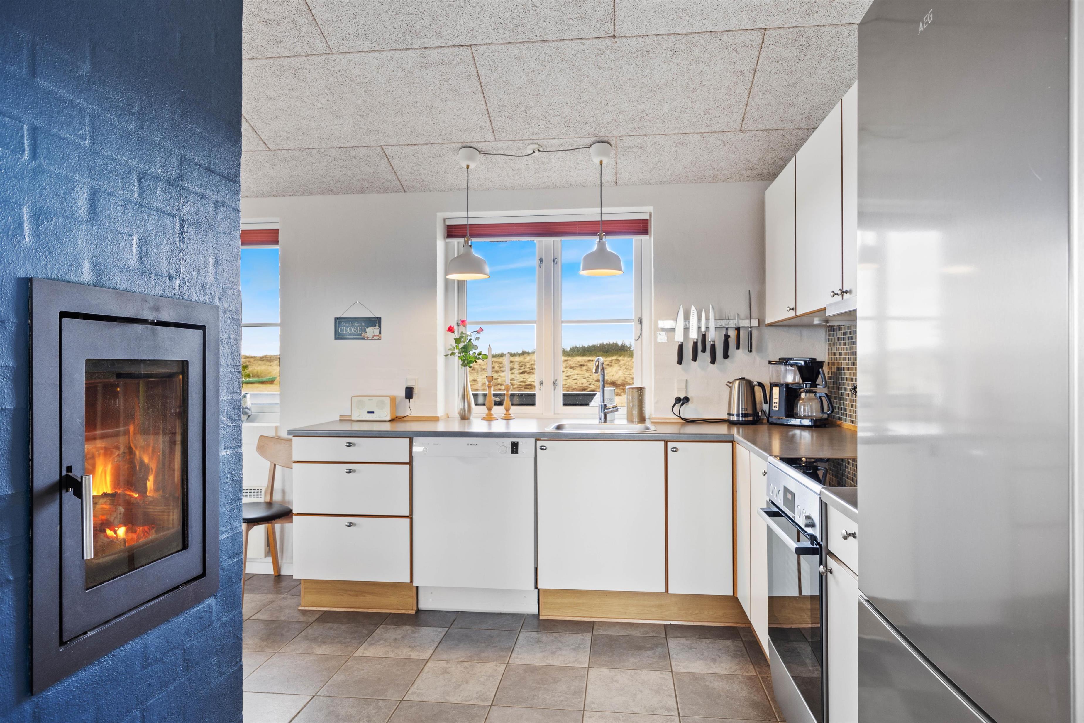 Inde i det røde murstenshus finder det skønneste opholdsrum, sommerhusets hjerte, hvor der er plads til hele familien. Her er højt til loftet og masser af lysindfald fra de store vinduer, hvilket gør rummet til et skønt sted at være. I det ene hjørne finder I et veludstyret køkken, som har et rummeligt køleskab med en stor indbygget fryser. I stuen er der komfortable møbler, indbygget brændeovn og fjernsyn med DVD. Feriehuset har 3 gode soveværelser med boksmadrasser. Der er desuden gæstebadeværelse og et stort badeværelse med boblebad og sauna, så der rigtig kan slappes af.