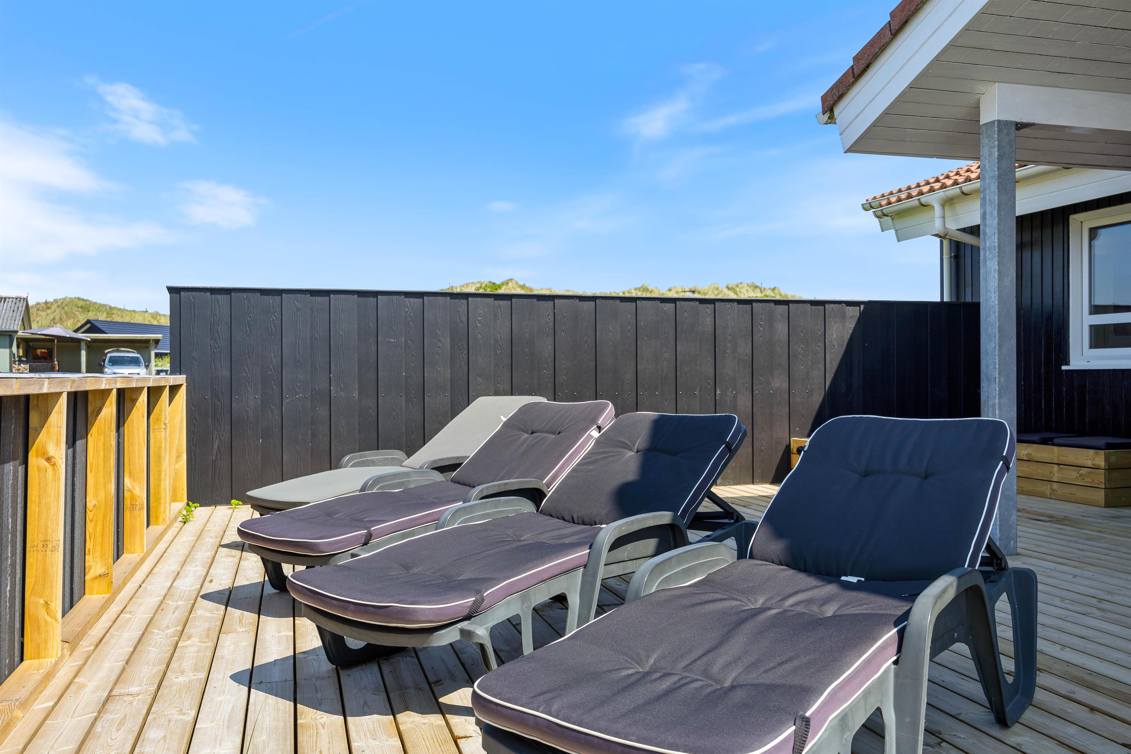Feriehuset har en skøn vestvendt terrasse, hvor du kan nyde en fantastisk udsigt til klitterne og høre Vesterhavets brusen, mens du slapper af i vildmarksbadet eller griller.
