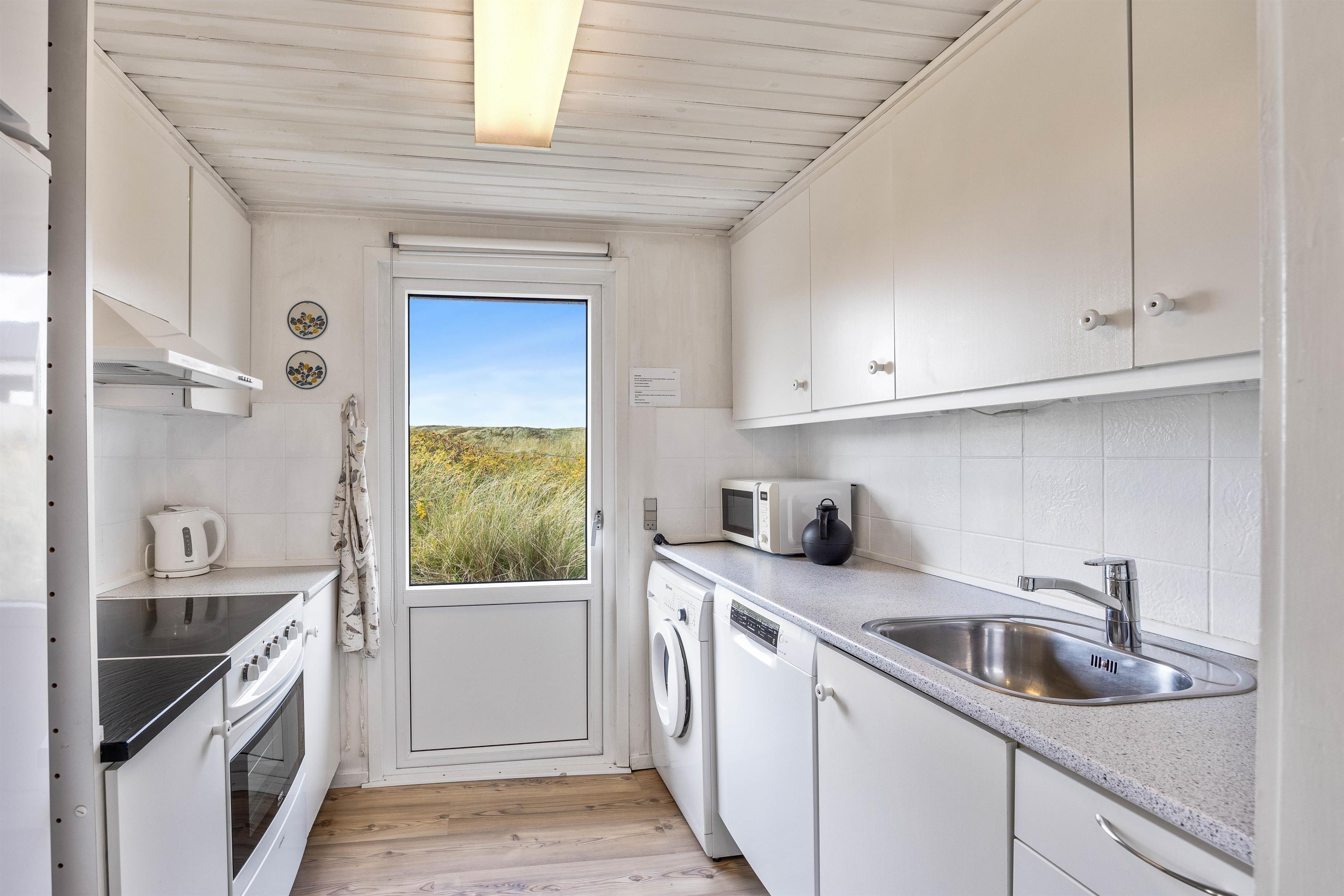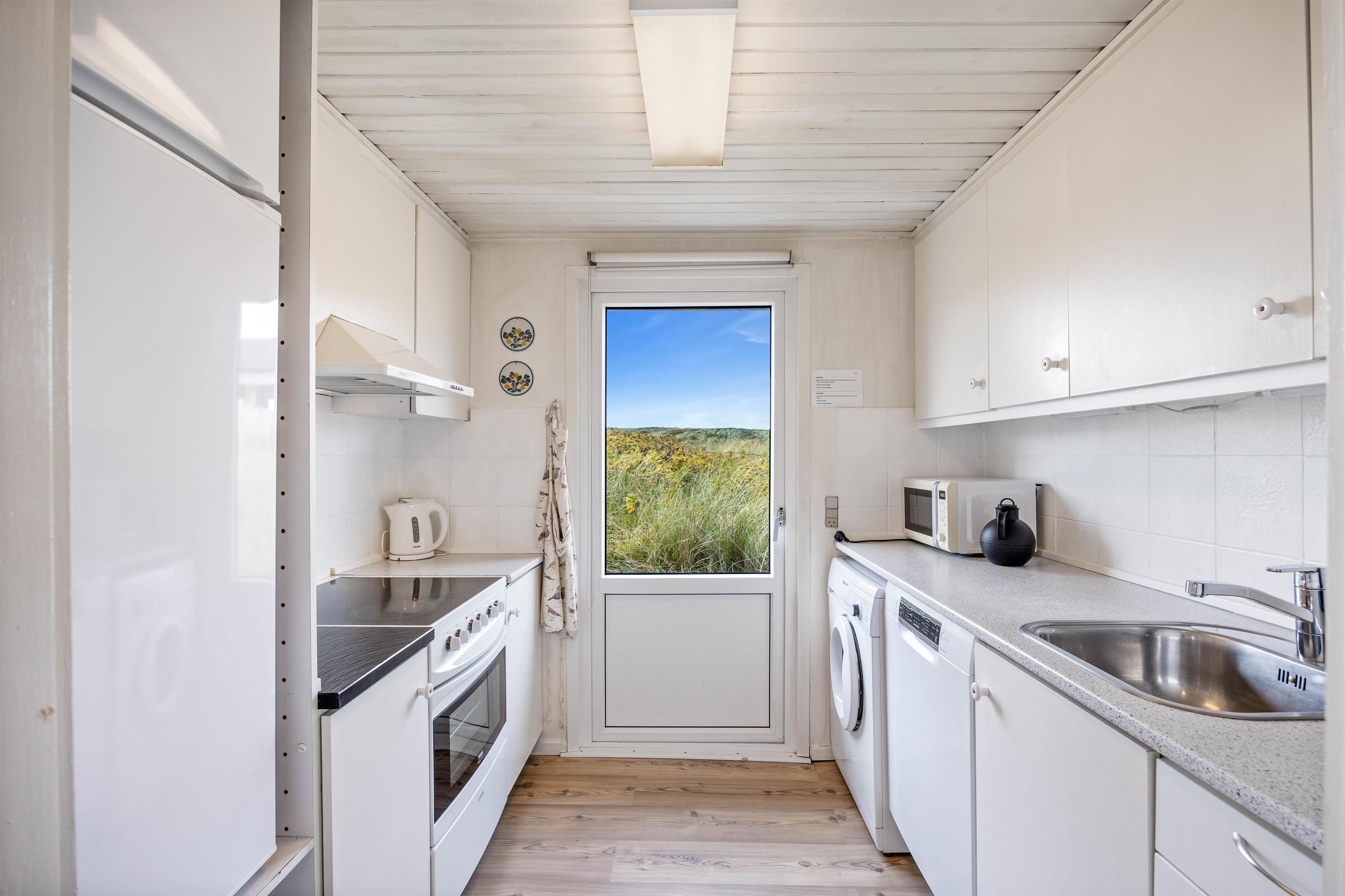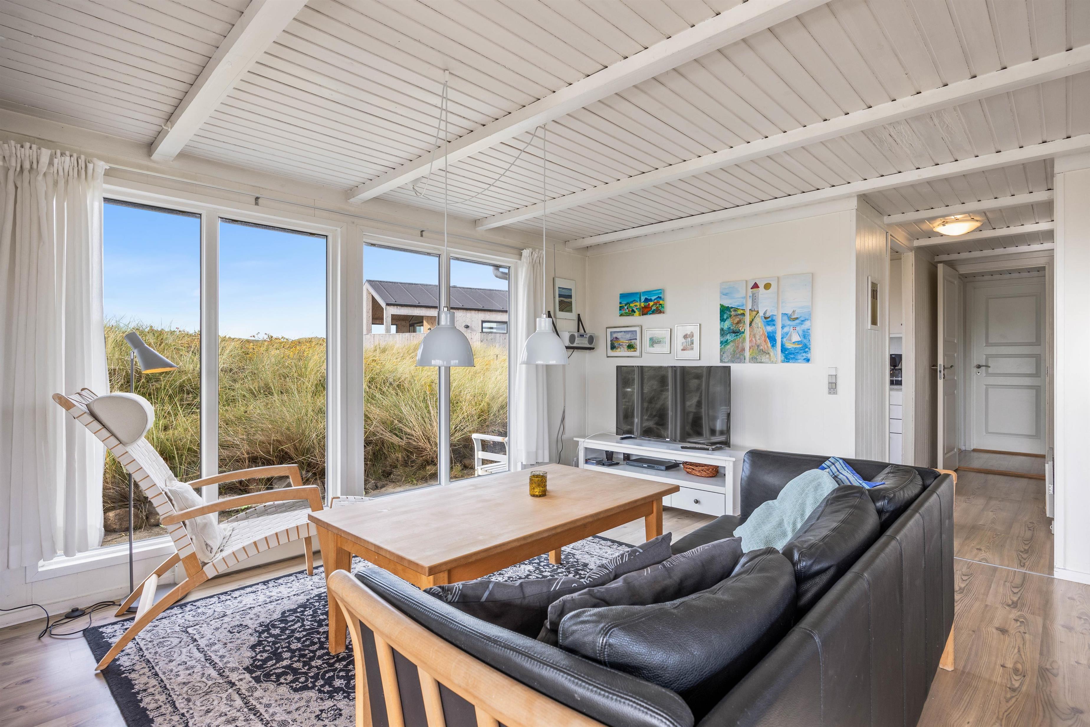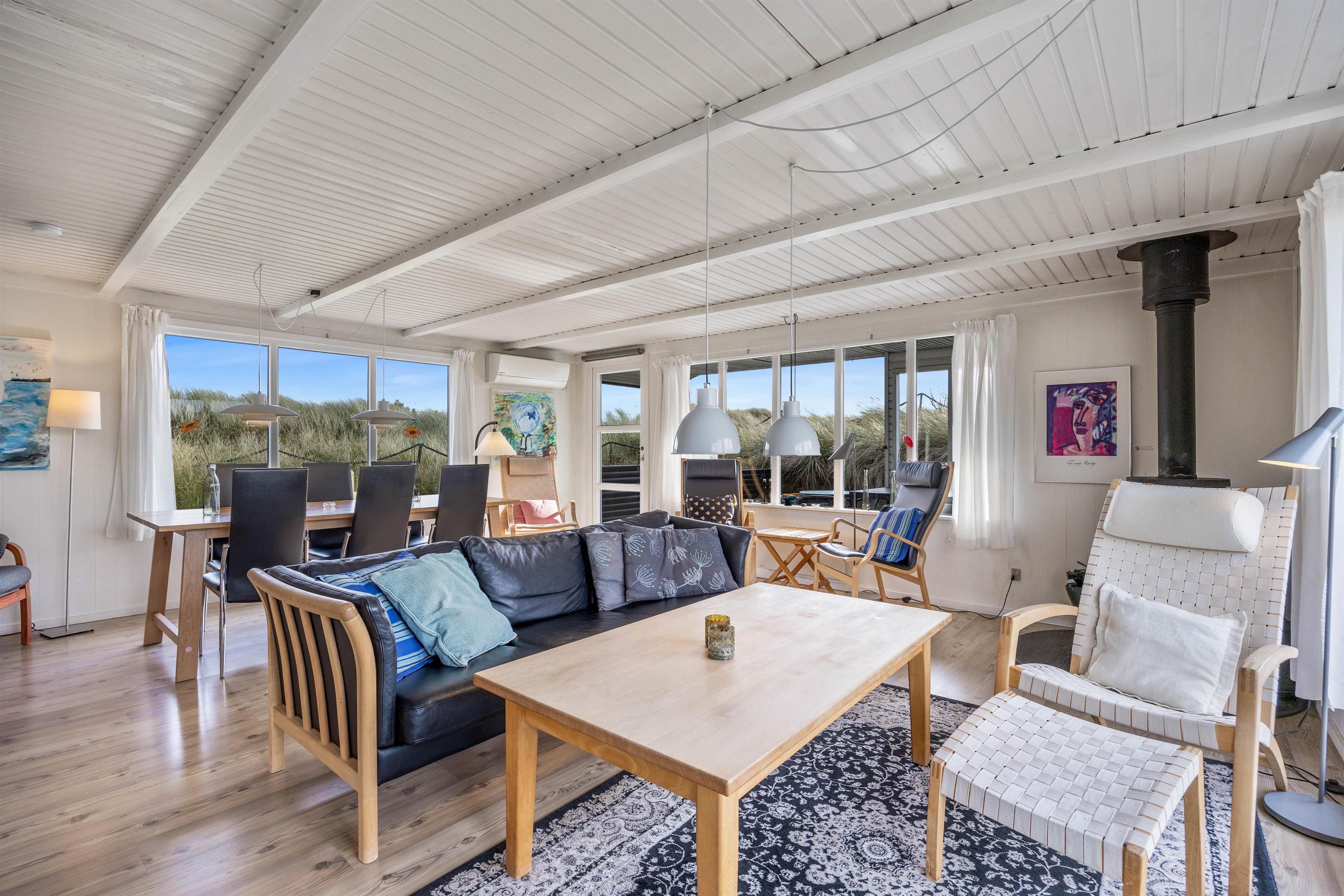 De 80 m2 er godt udnyttet på Rauhesvej 41. Her er plads til 6 personer, og endda også en hund, hvis I ønsker at tage hund med. Opholdsstuen er i åben forbindelse med køkkenet, og her er både lyst og venligt indrettet, fint lysindfald fra de brede vinduespartier og komfortable møbler at opholde sig i. Trægulvet og de hvidmalede lofter bidrager til feriestemningen i forening med brændeovnens knitren og klitlandskabet lige udenfor vinduerne.