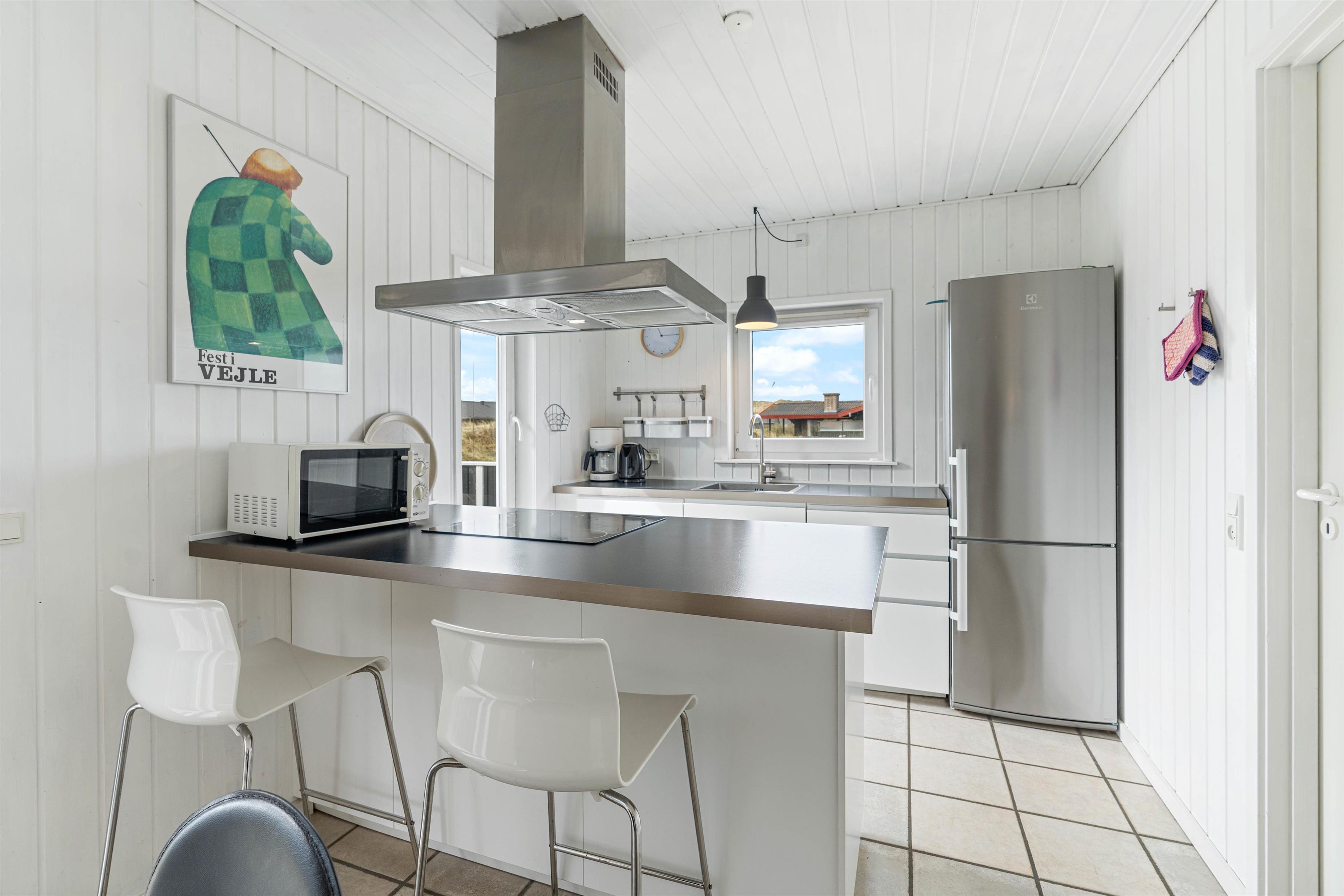 Køkkenet ligger i åben forbindelse med den hyggelige stue, her kan hele familien samles omkring fælles madlavning eller et spil ludo ved spisebordet. Et dejligt køkken med opvaskemaskine, mikroovn samt el komfur, køkkenet er overskueligt og lyst og med udgang til den lukkede terrasse.