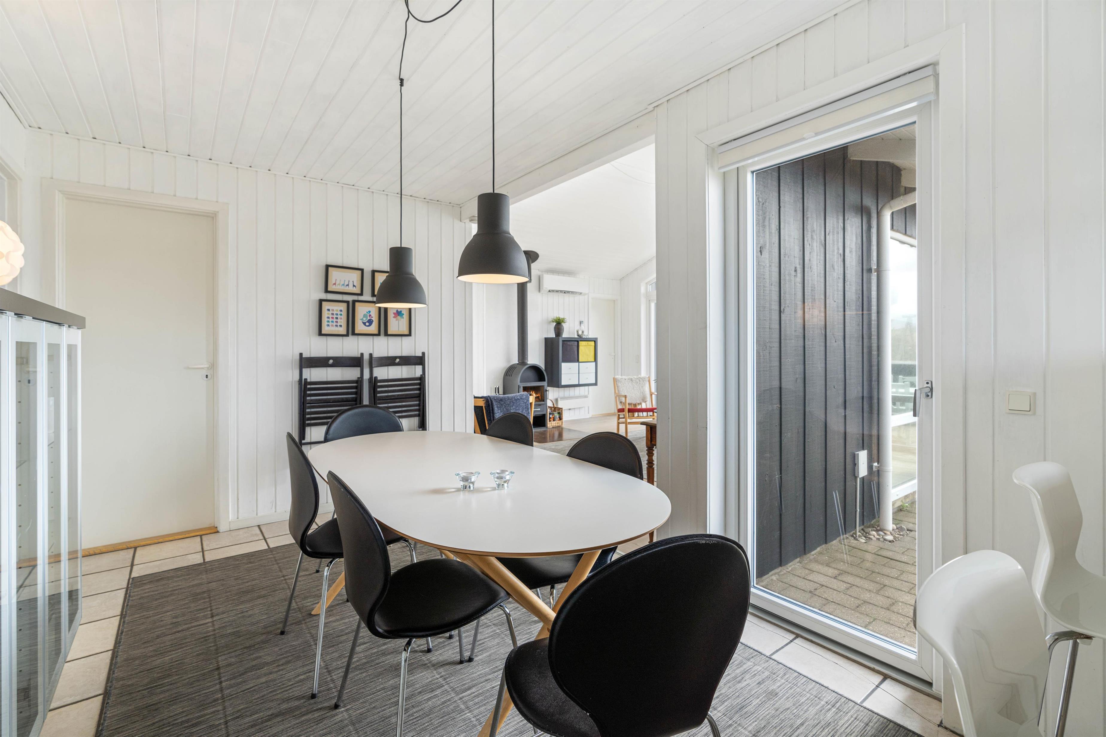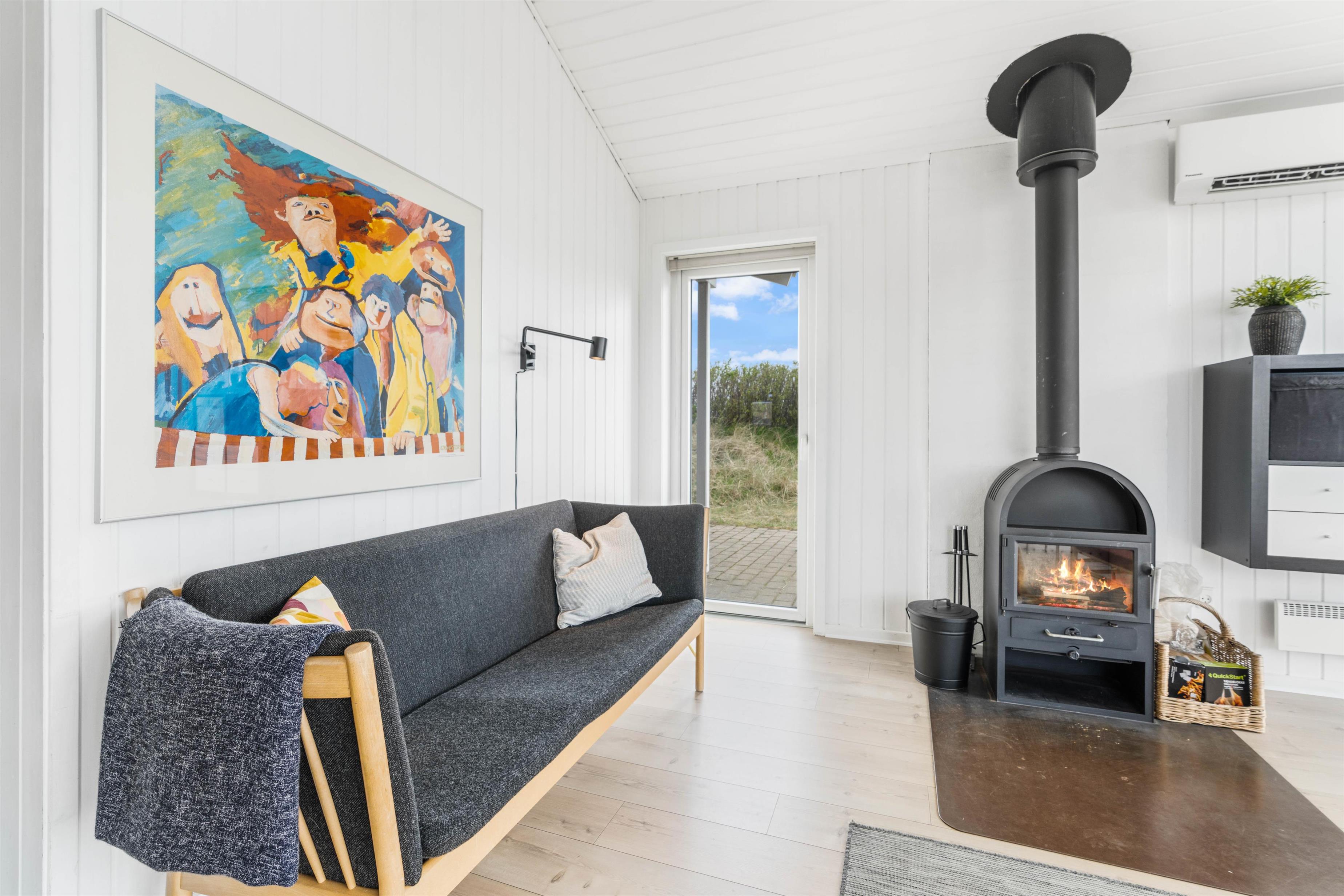 Feriehuset rummer en hyggelig stue med brændovn og udgang til terrassen. Put brænde i brændeovnen og nyd en god krimi i sofaen, mens ildren gnitrer og varmer dig. I feriehuset er også en energibesparende varmepumpe, som lynhurtigt kan varme huset op. Huset råder endvidere over gratis trådløs internet forbindelse