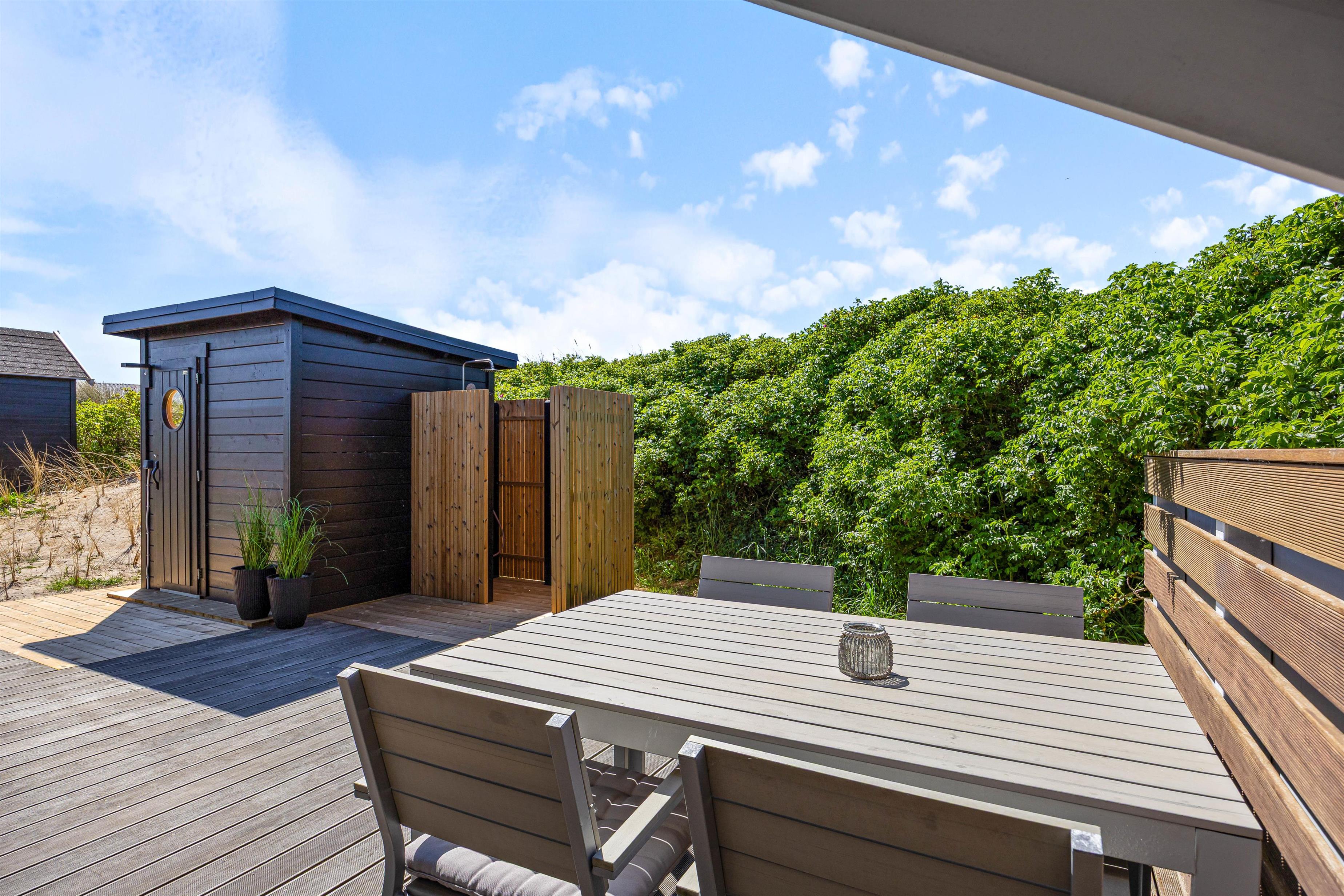 Når solen titter frem, trækker terrassen udenfor – og hvilken terrasse. Den flotte træterrasse er delvist afskærmet, så I kan finde både sol og læ. Her er der god plads til liggestole, et udendørs spiseområde og hyggelige grillaftener under sommerhimlen. Det er det perfekte sted at nyde dagens første kop kaffe, mens duggen stadig glitrer i marehalmen, eller afslutte aftenen i skumringen med ro og fuglesang.
