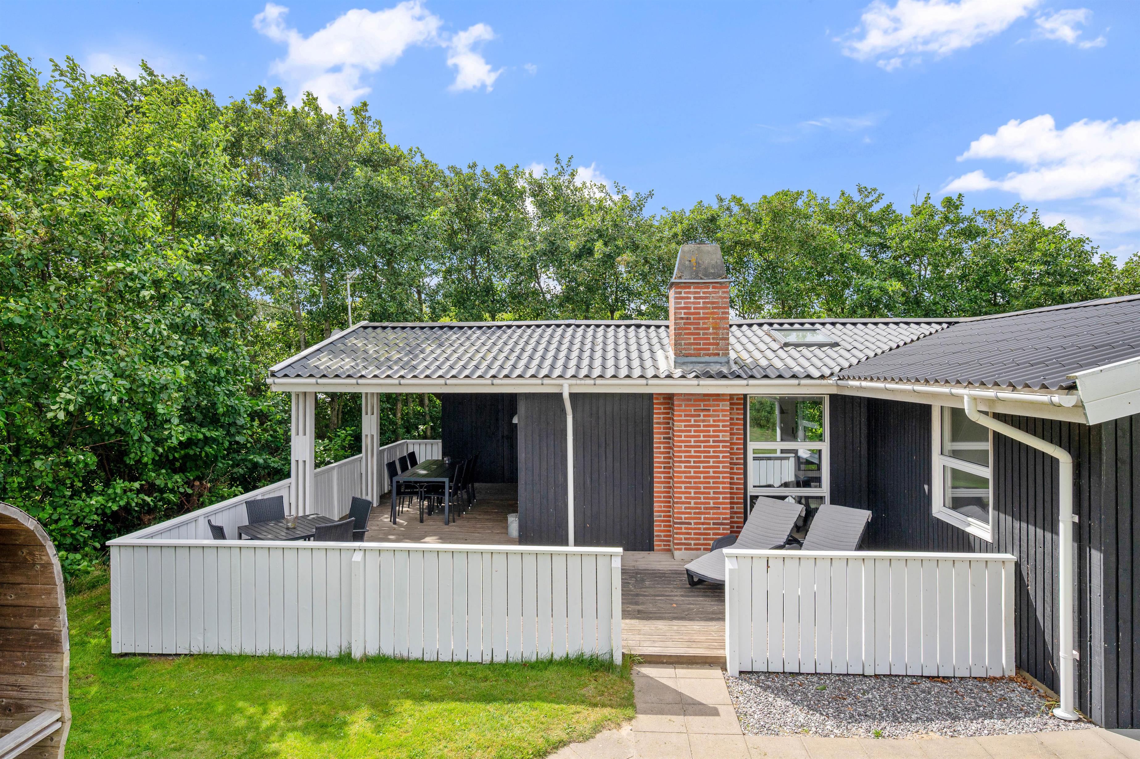 Et hyggeligt og velholdt sommerhus med både indendørs- og udendørs sauna. Feriehuset har en fin beliggenhed på en delvist afskærmet grund og en skøn terrasse. Her får I rigtig meget for pengene.