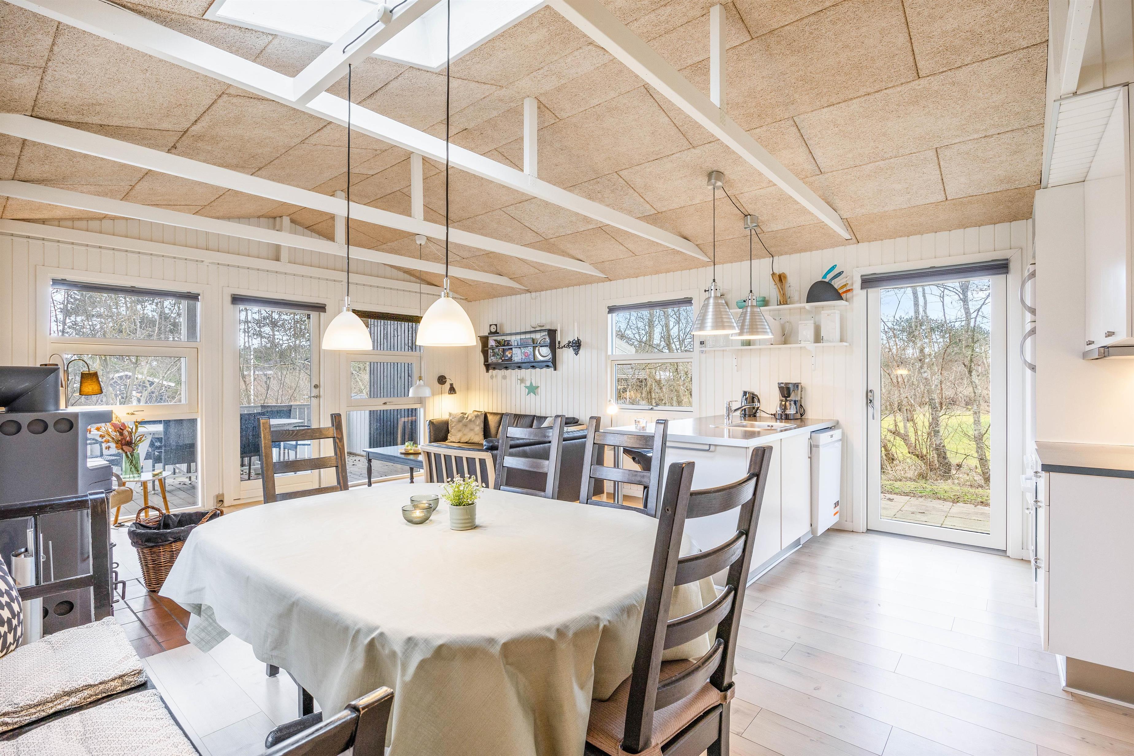Fra den rummelige opholdsstue er der udgang til 2 terrasser, hvoraf den ene er helt lukket. De brede vinduespartier og synlige hanebånd giver et lyst og venligt miljø, og i sofagruppen kan I hygge jer foran brændeovnens knitren i dag- eller aftentimerne.