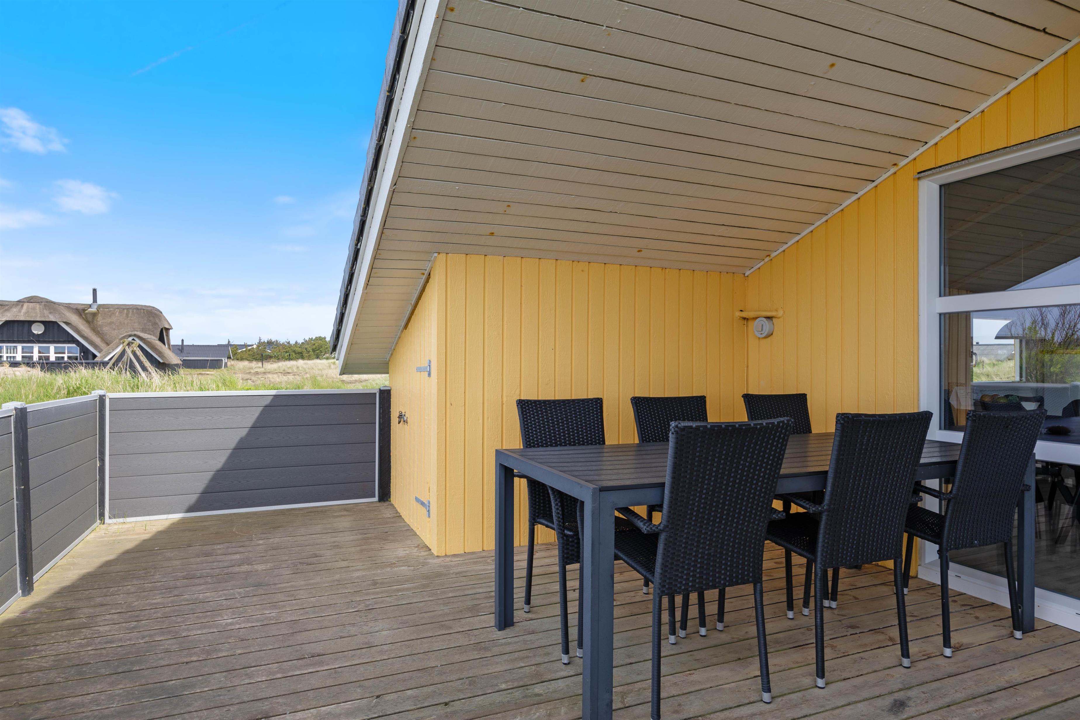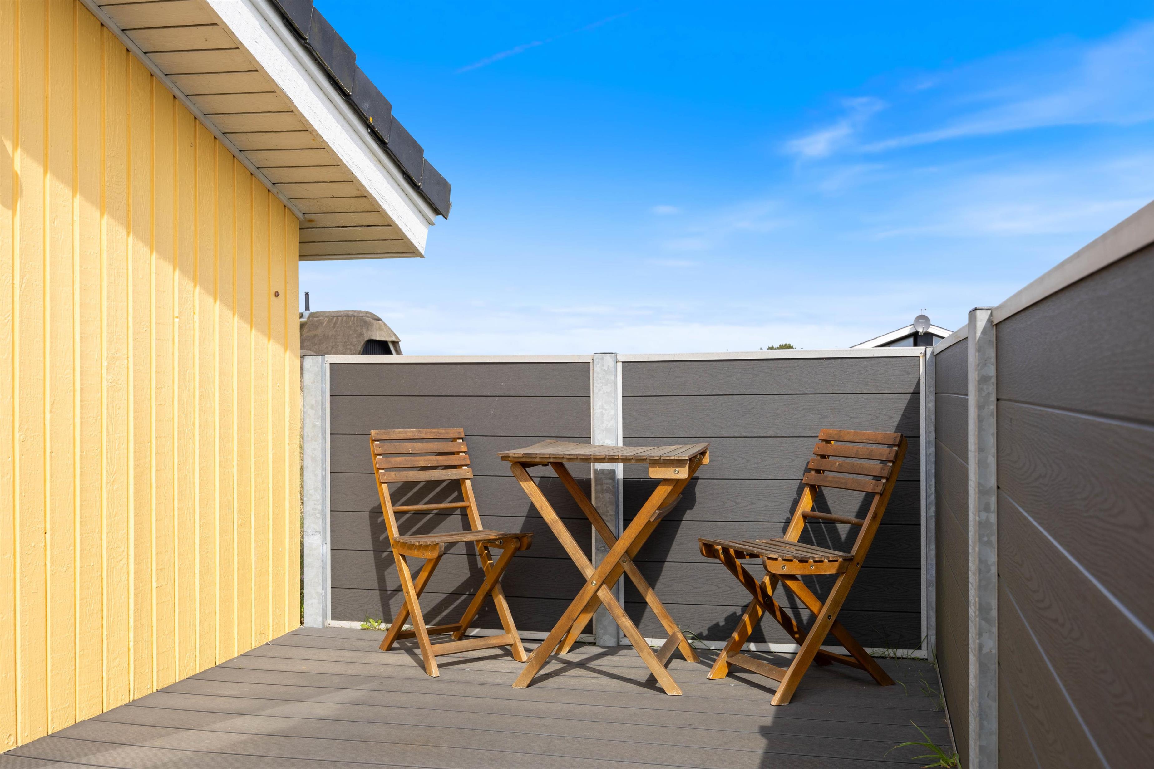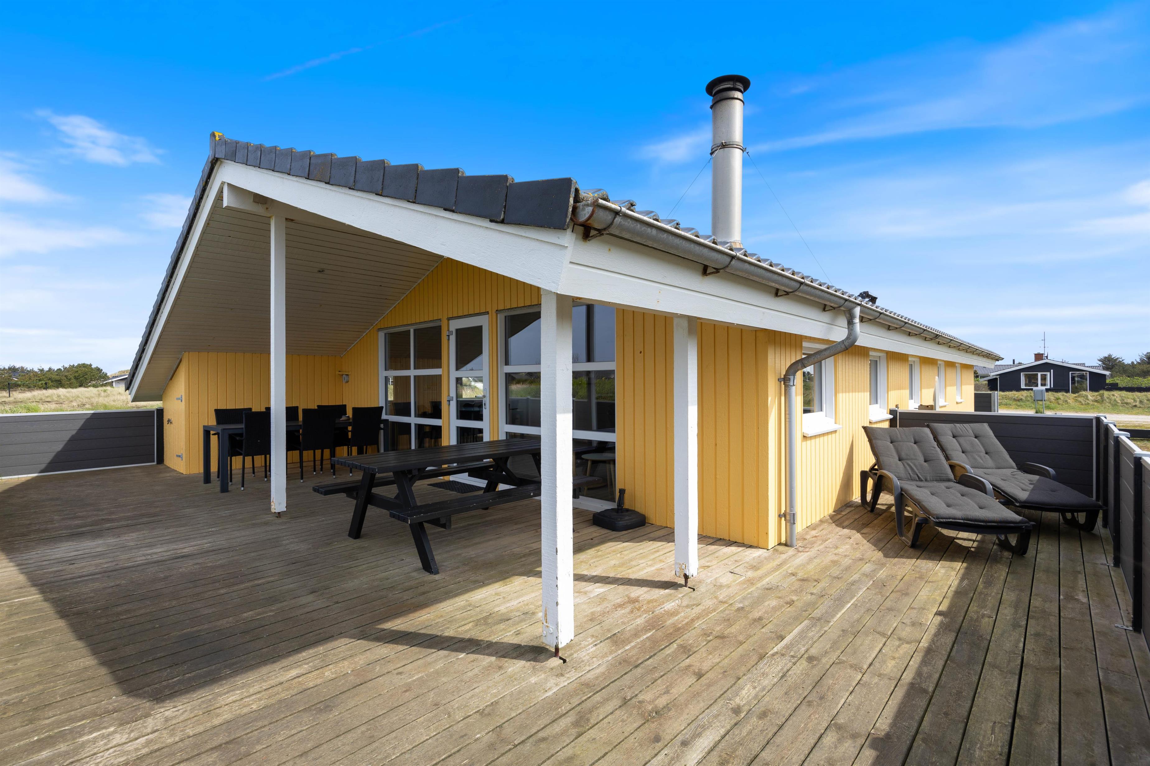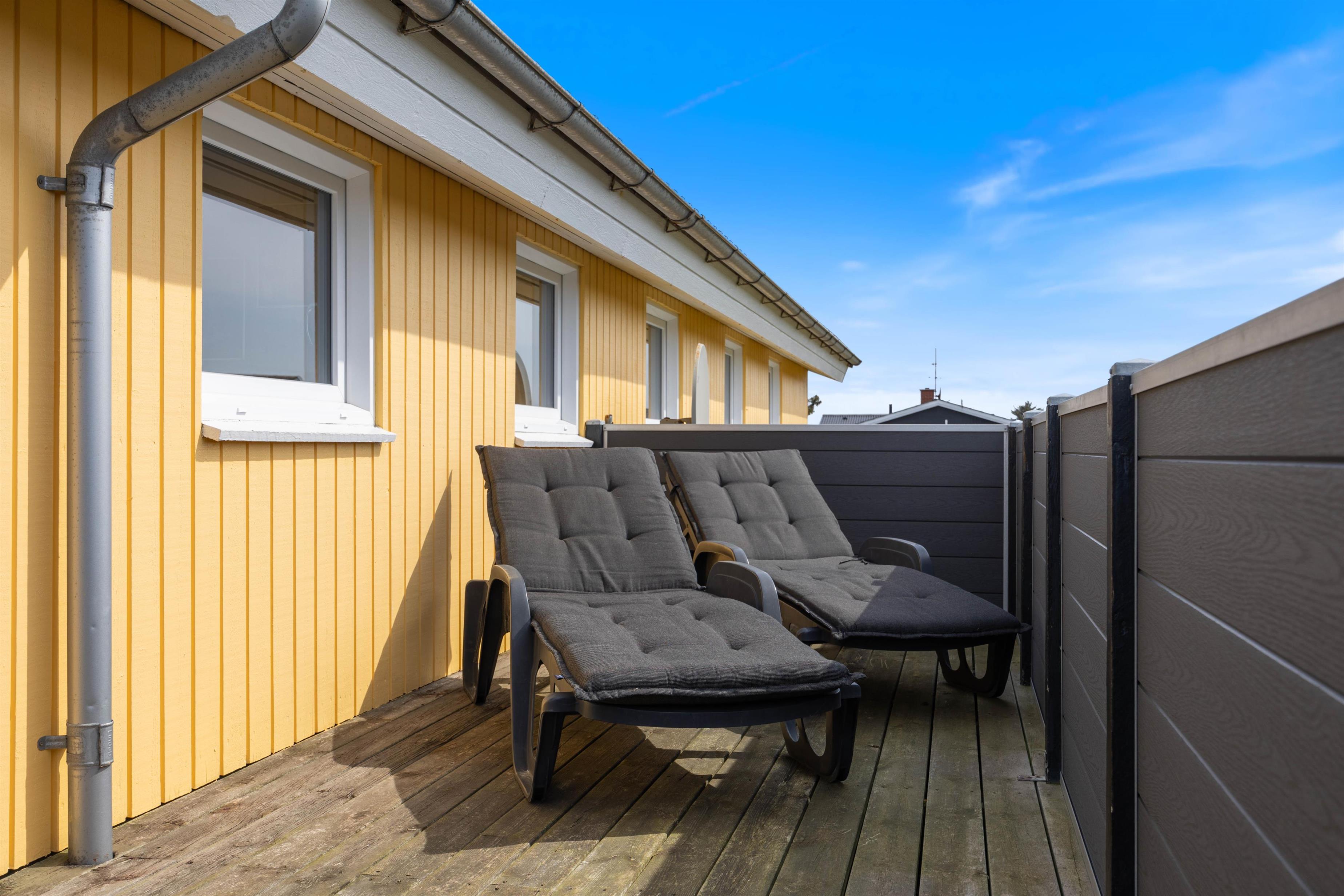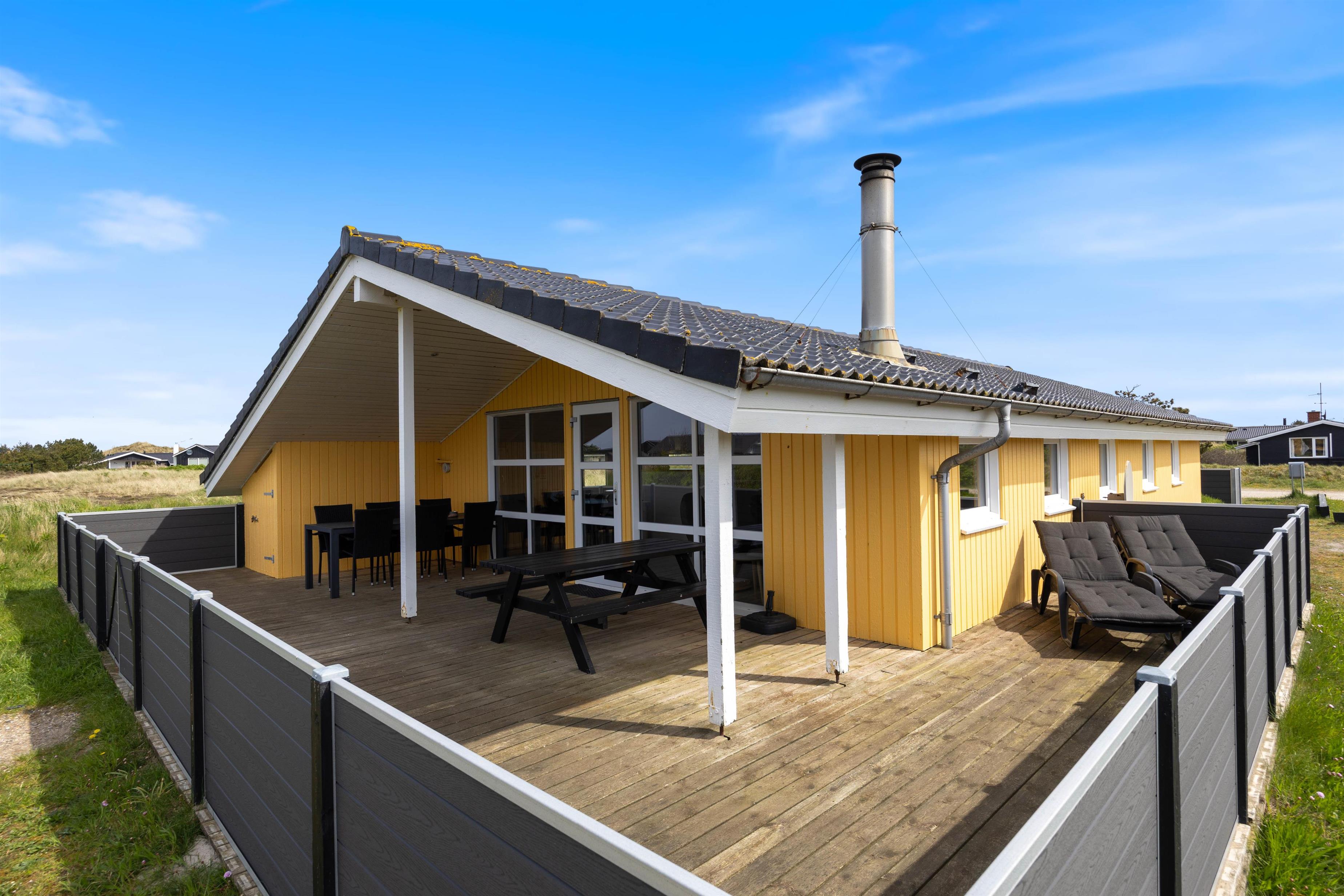 Sydvest for feriehuset har I en dejlig stor vinkelterrasse, hvor I har sol det meste af dagen, og hvor det også er muligt at sidde i læ. Og da terrassen er helt lukket af, kan I sagtens lade hunden gå rundt uden snor, mens I hygger jer i liggestolene med et par gode bøger.
