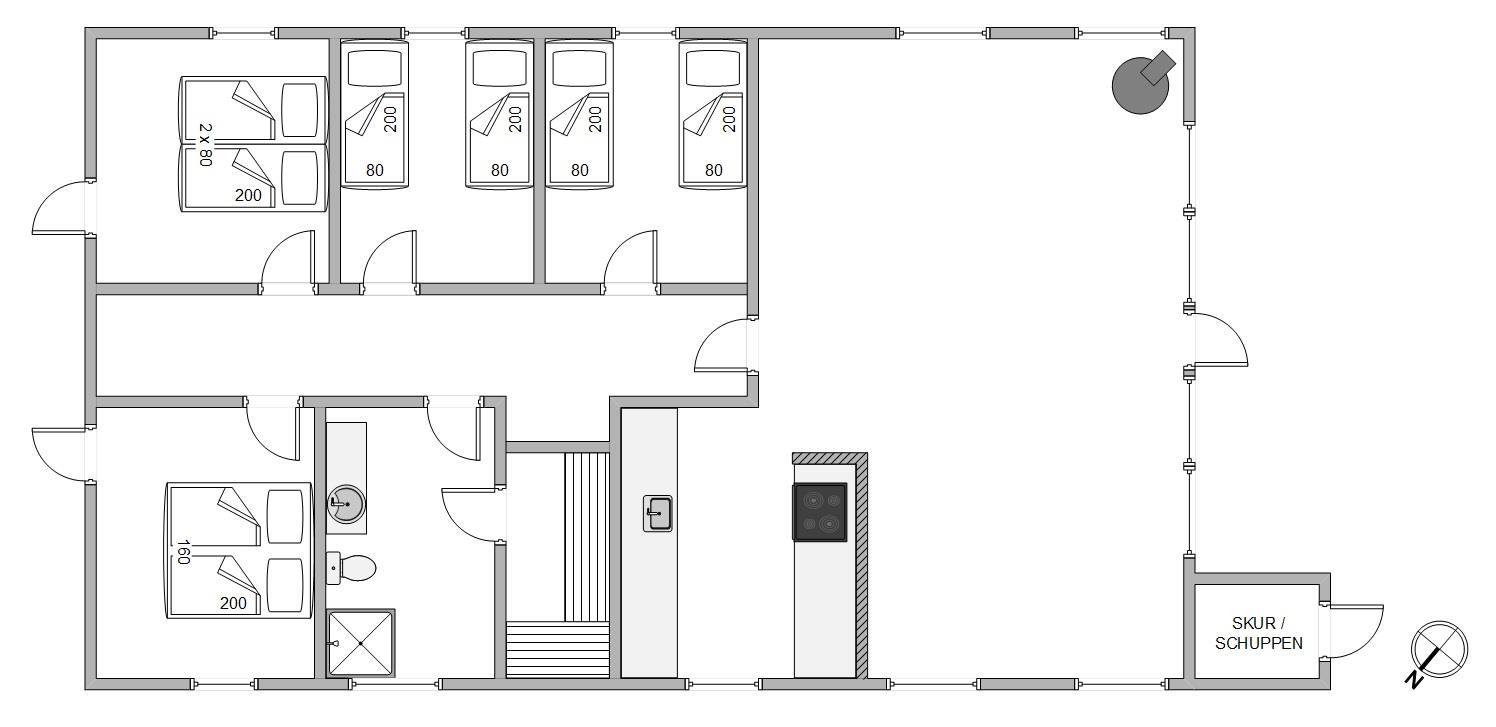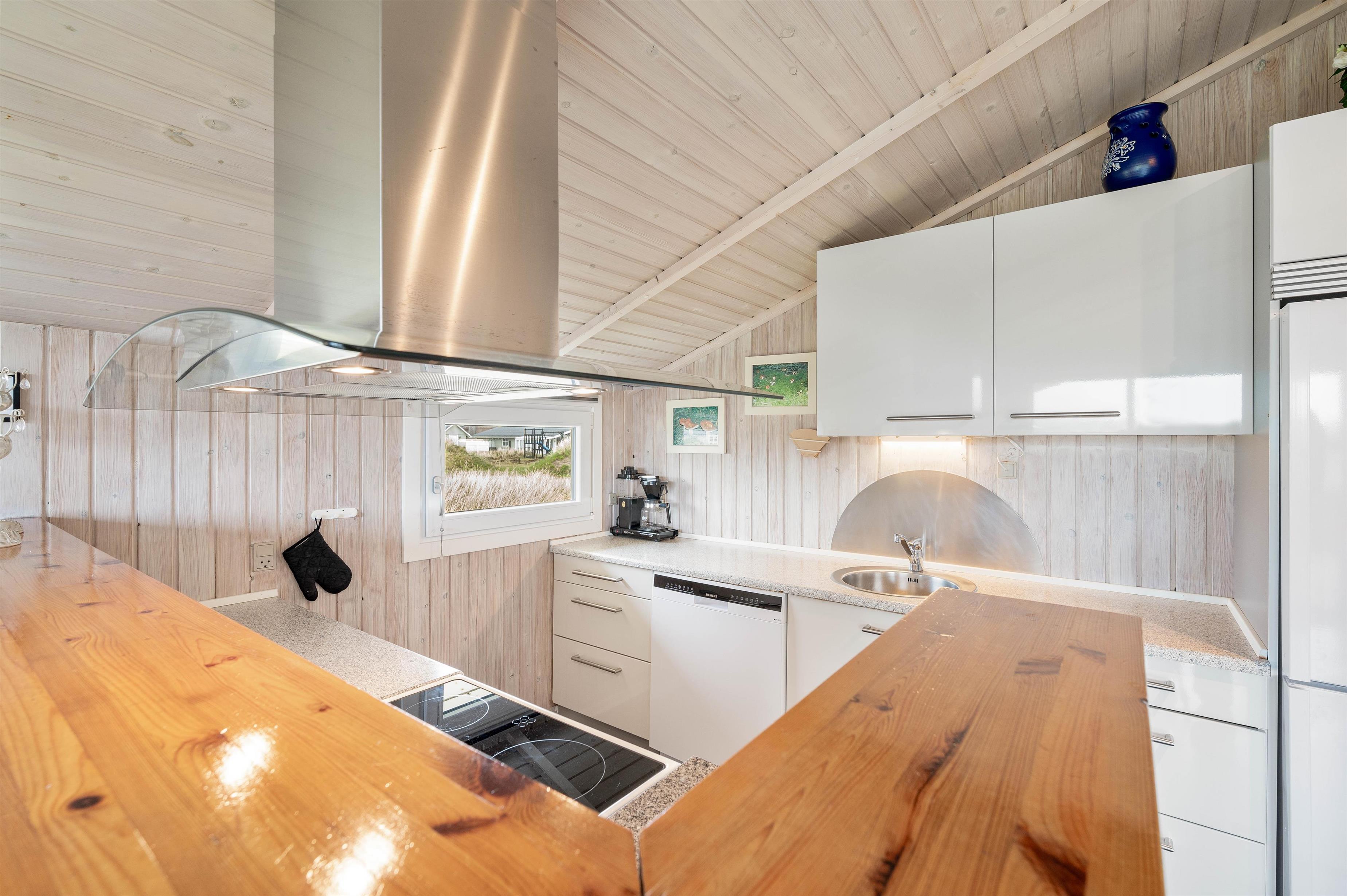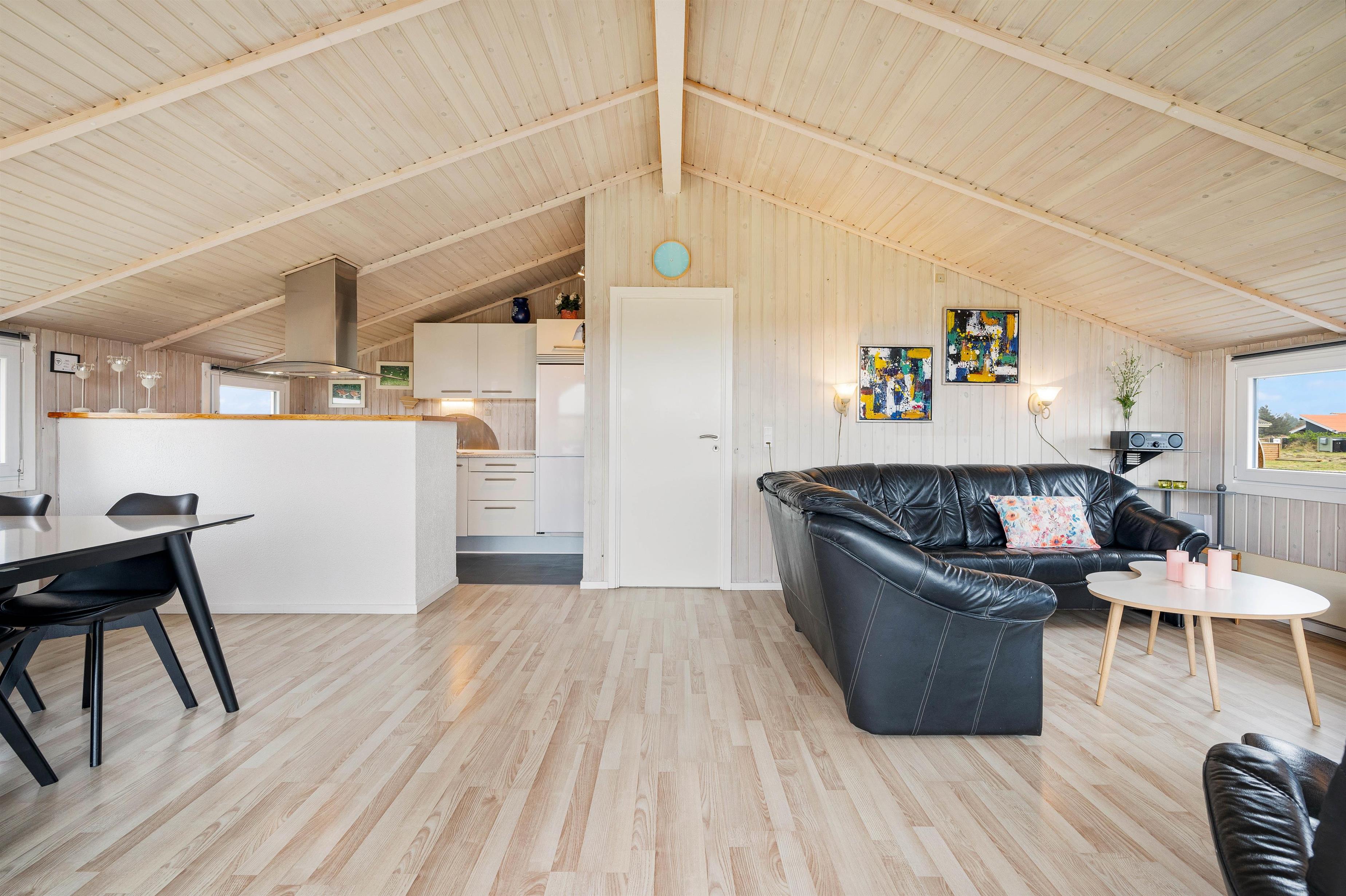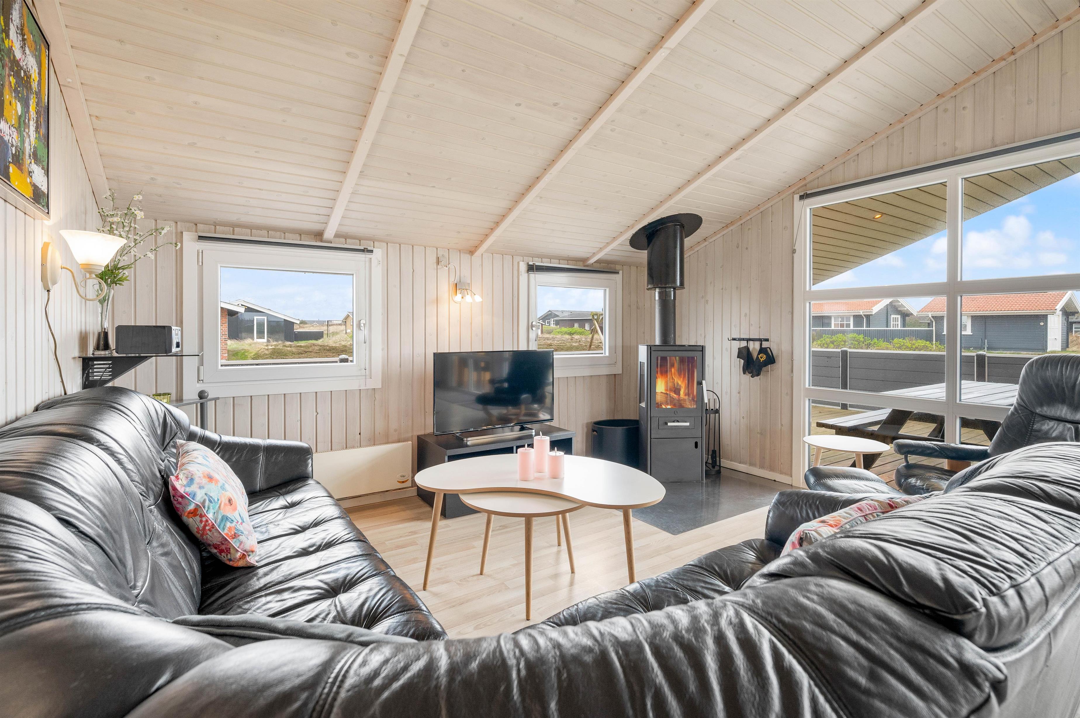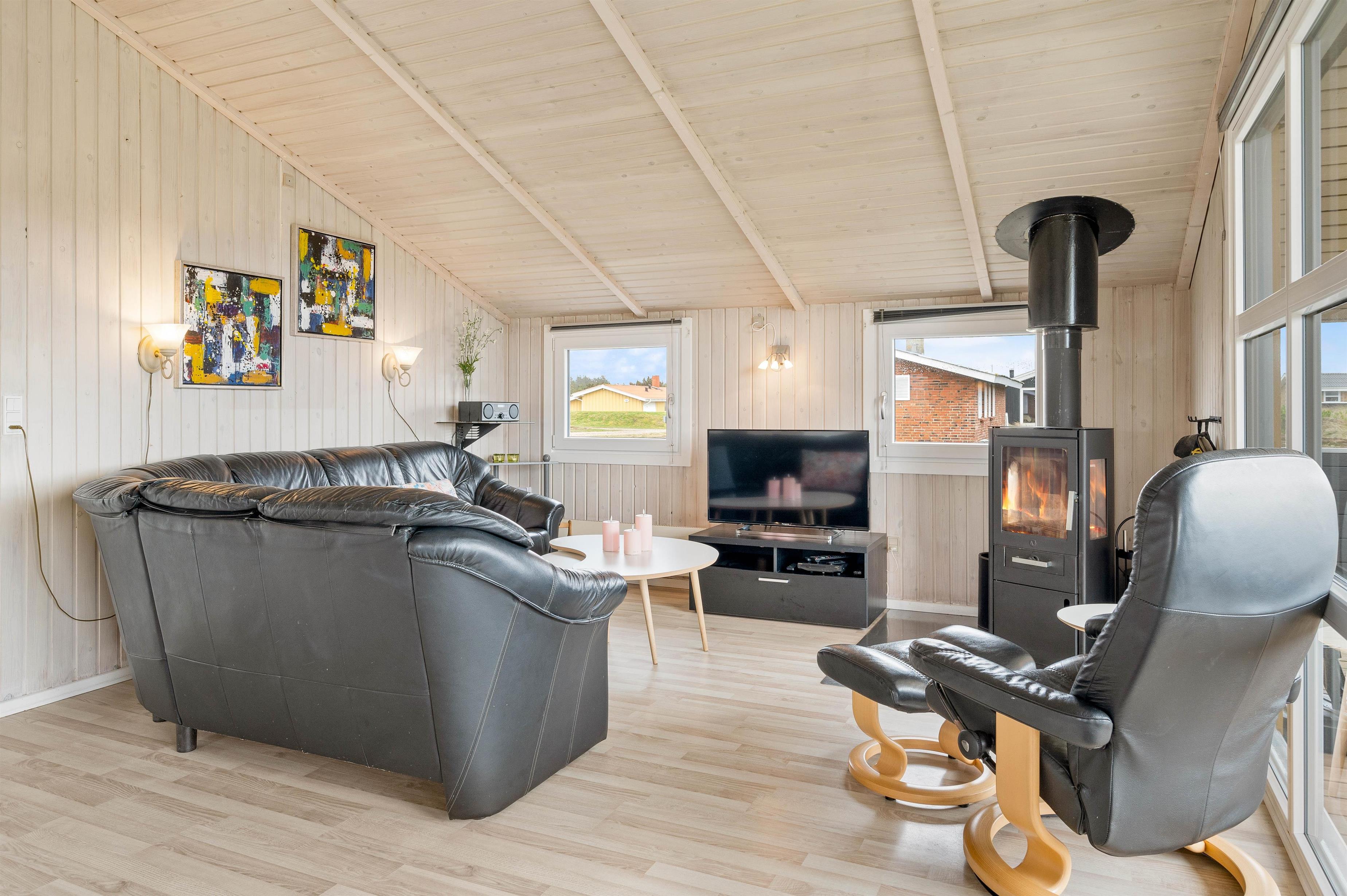 Feriehuset er godt indrette med 4 gode soveværelser til i alt 8 personer samt en en rummelige stue, der er indrettet med både spiseafdeling og opholdsafdeling med hjørnesofa, fladskærms-tv og brændeovn, så I har god mulighed for at sidde samlet under ferien. Og i det ene hjørne er der indrettet et godt, åbent køkken, hvor I sagtens kan få tilberedt maden samtidig med, at snakken fortsætter.