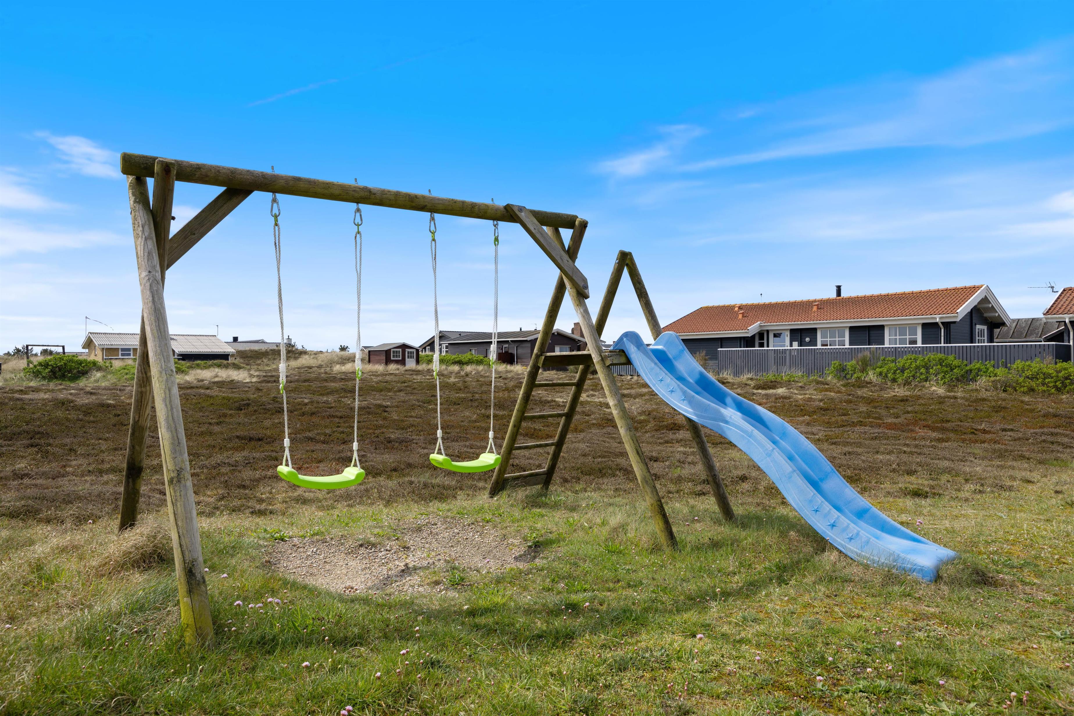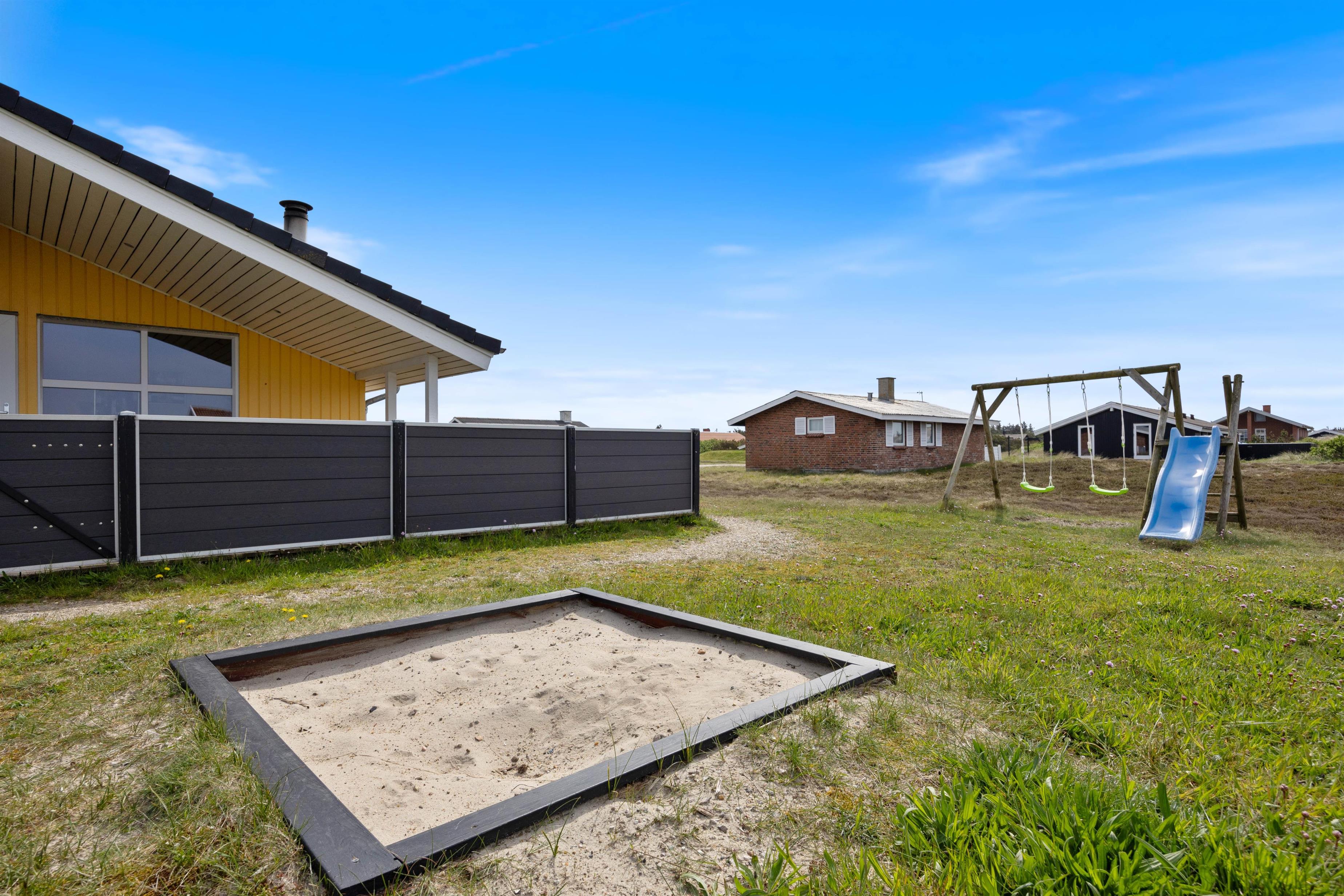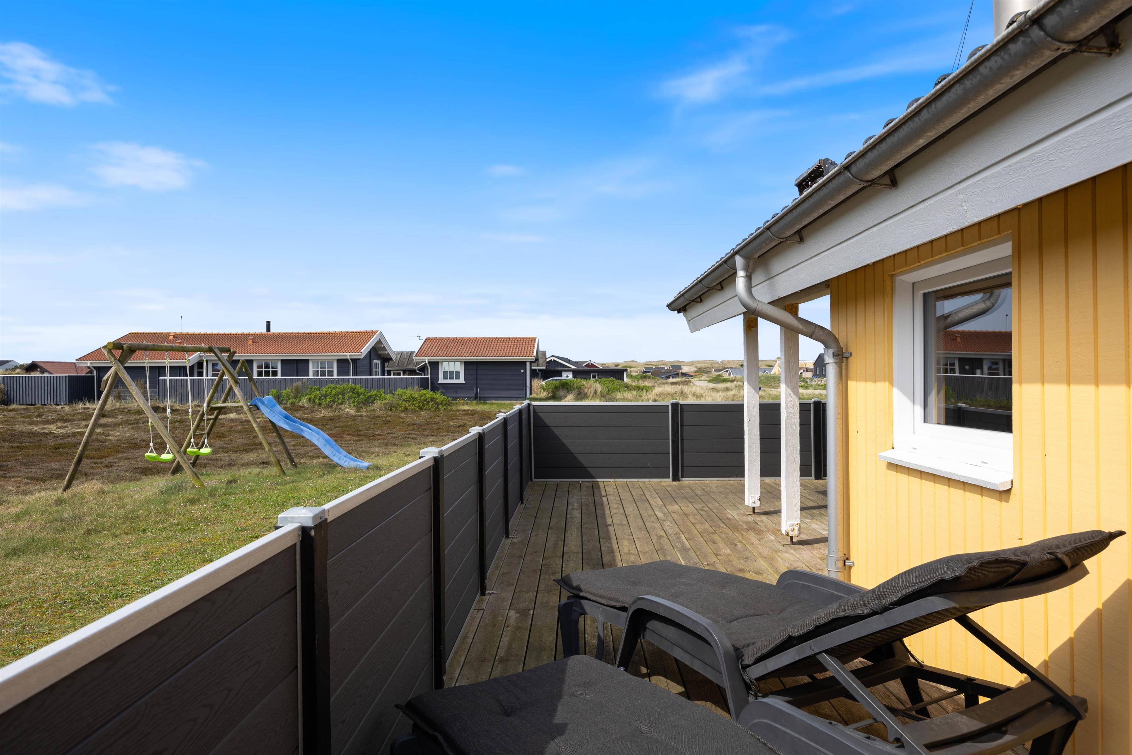 Efter en dejlig tur ved stranden kan I vende tilbage til feriehuset, tænde op i grillen og nyde en kølig drink på terrassen, mens I følger med i børnenes leg på gyngerne eller i sandkassen.