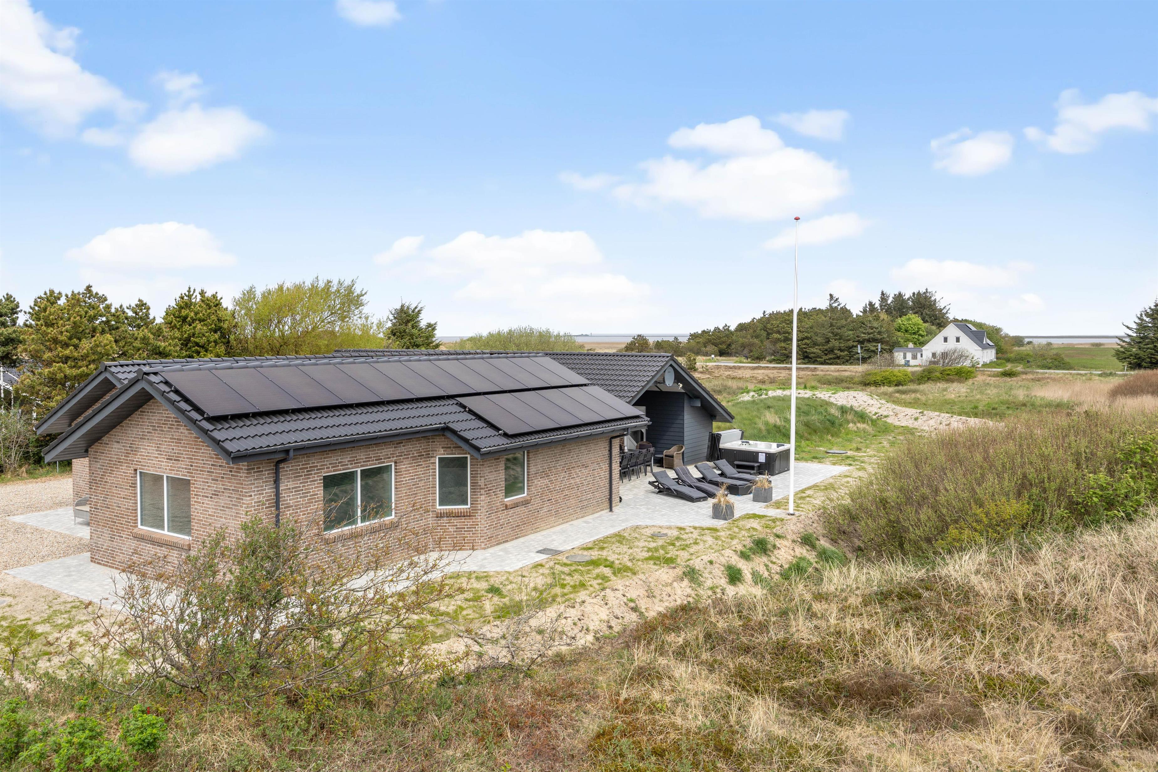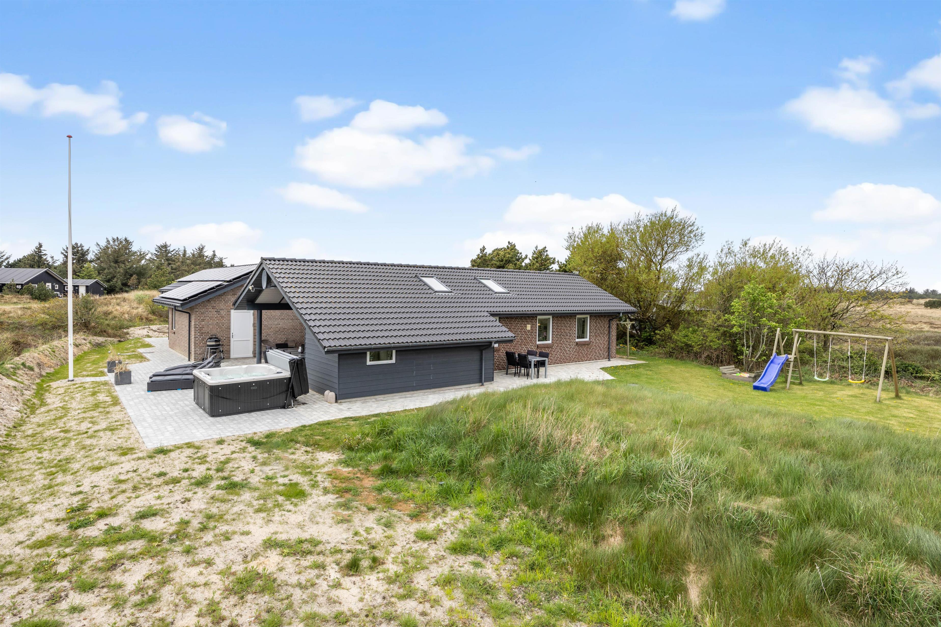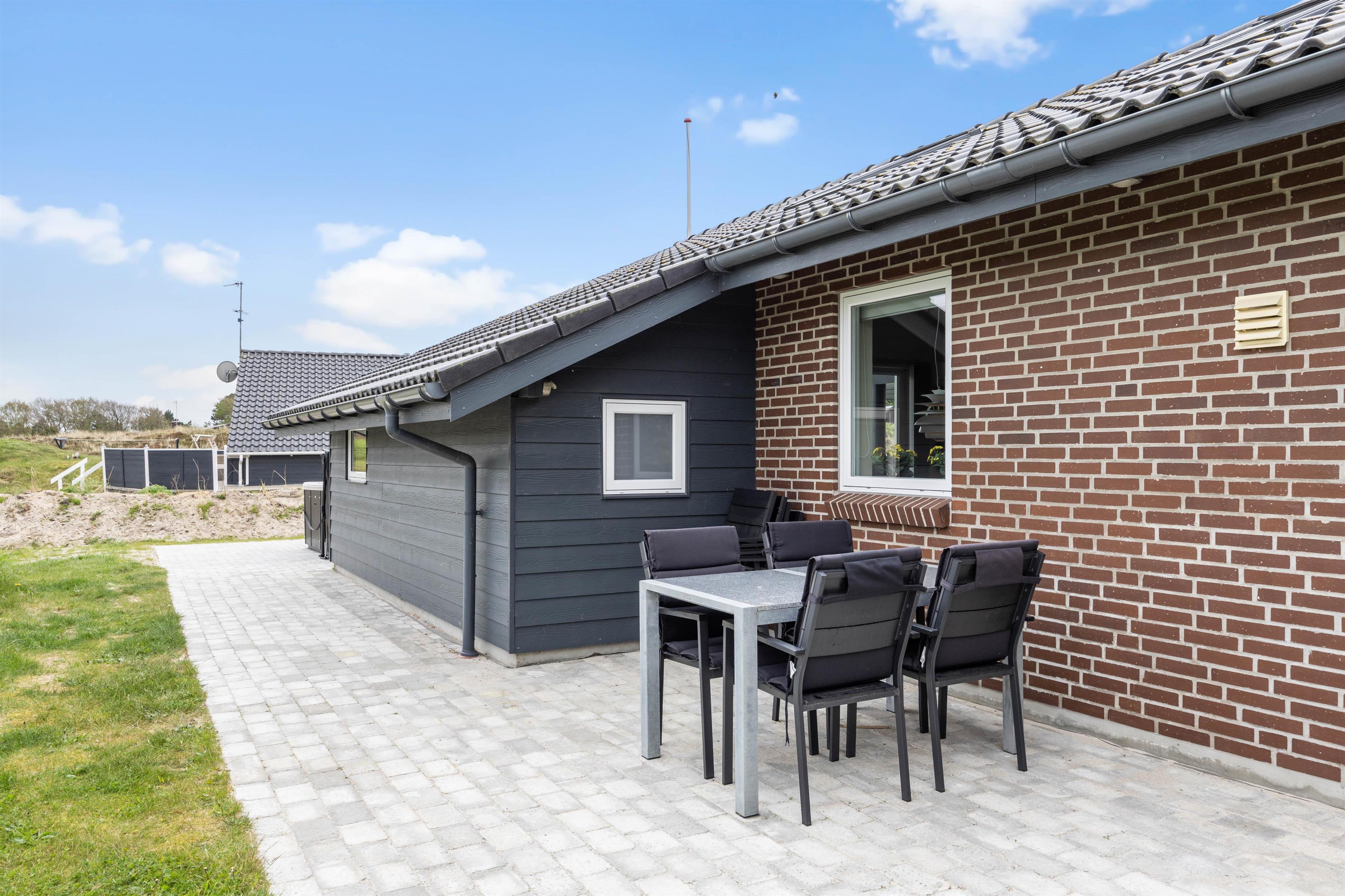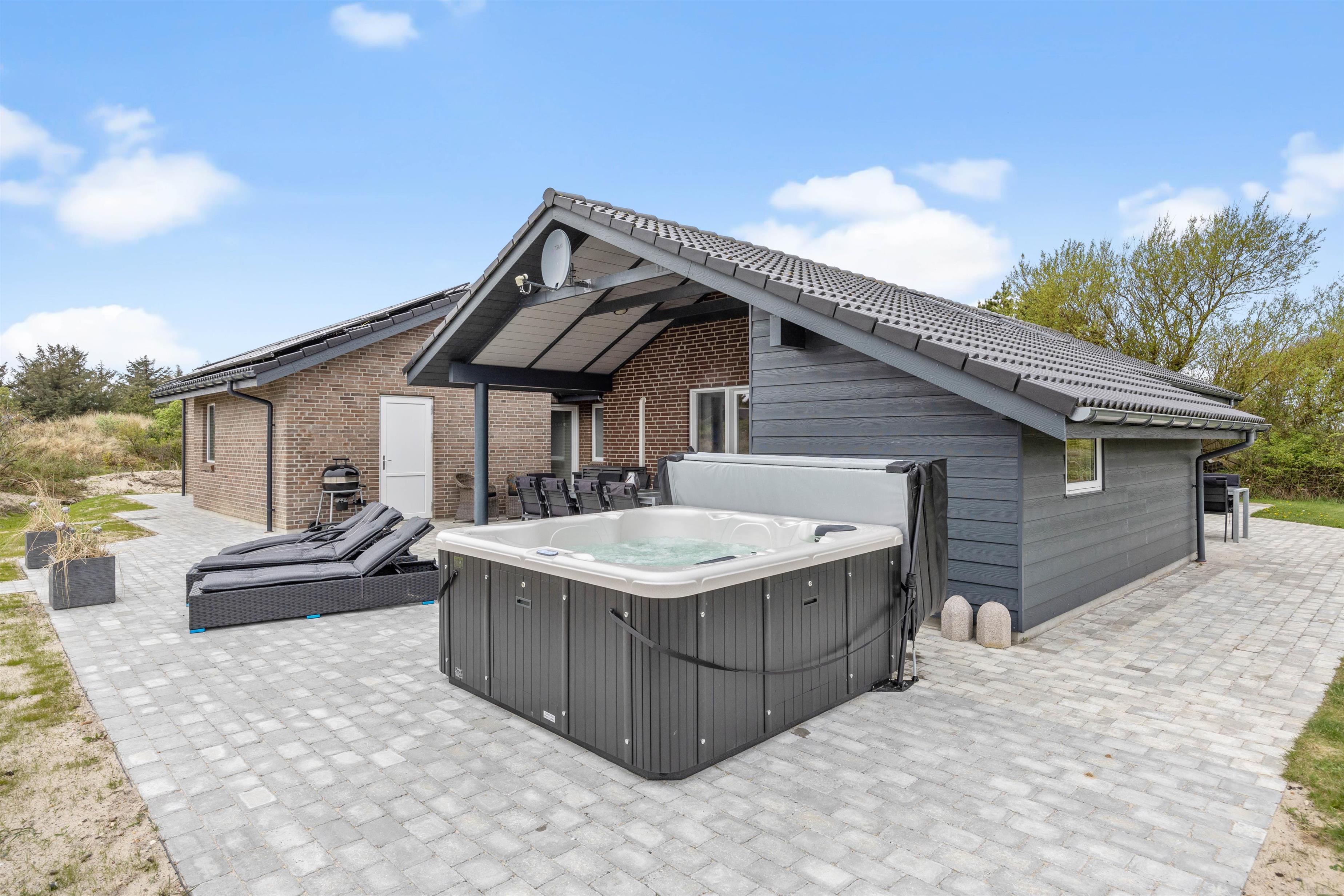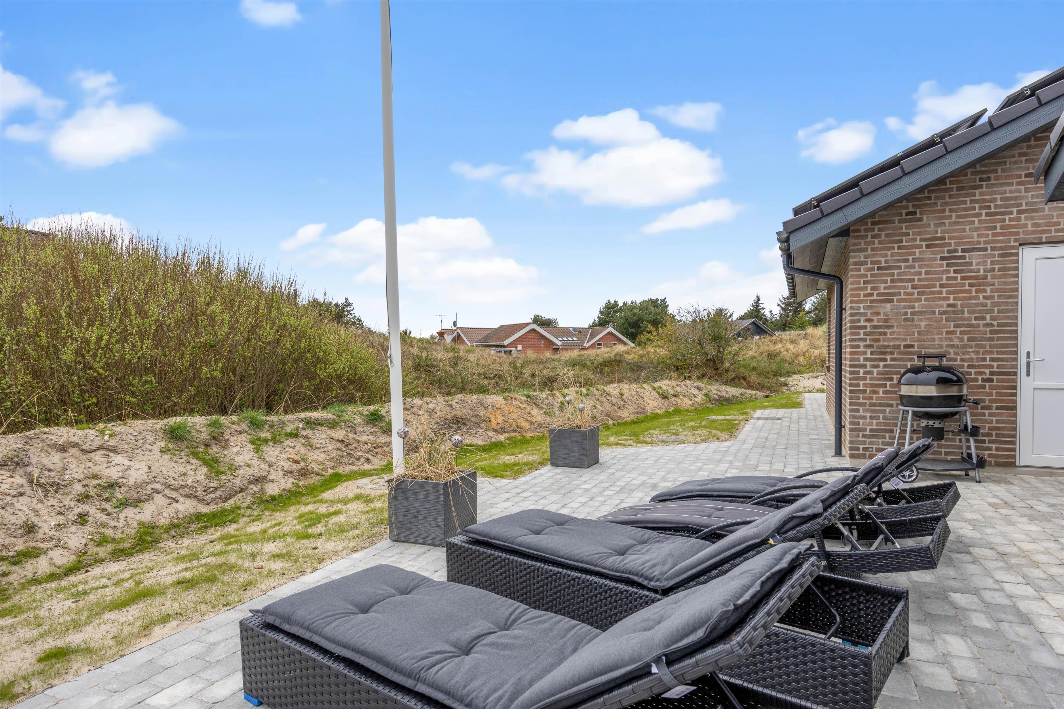 På den delvist overdækkede terrasse kan I lave en BBQ-aften på grillen, nyde måltidet sammen, gå en lang tur langs den kilometerlange Vesterhavsstrand og komme tilbage og nyde en kølig drink i udespaen, imens solen går ned over klitterne.