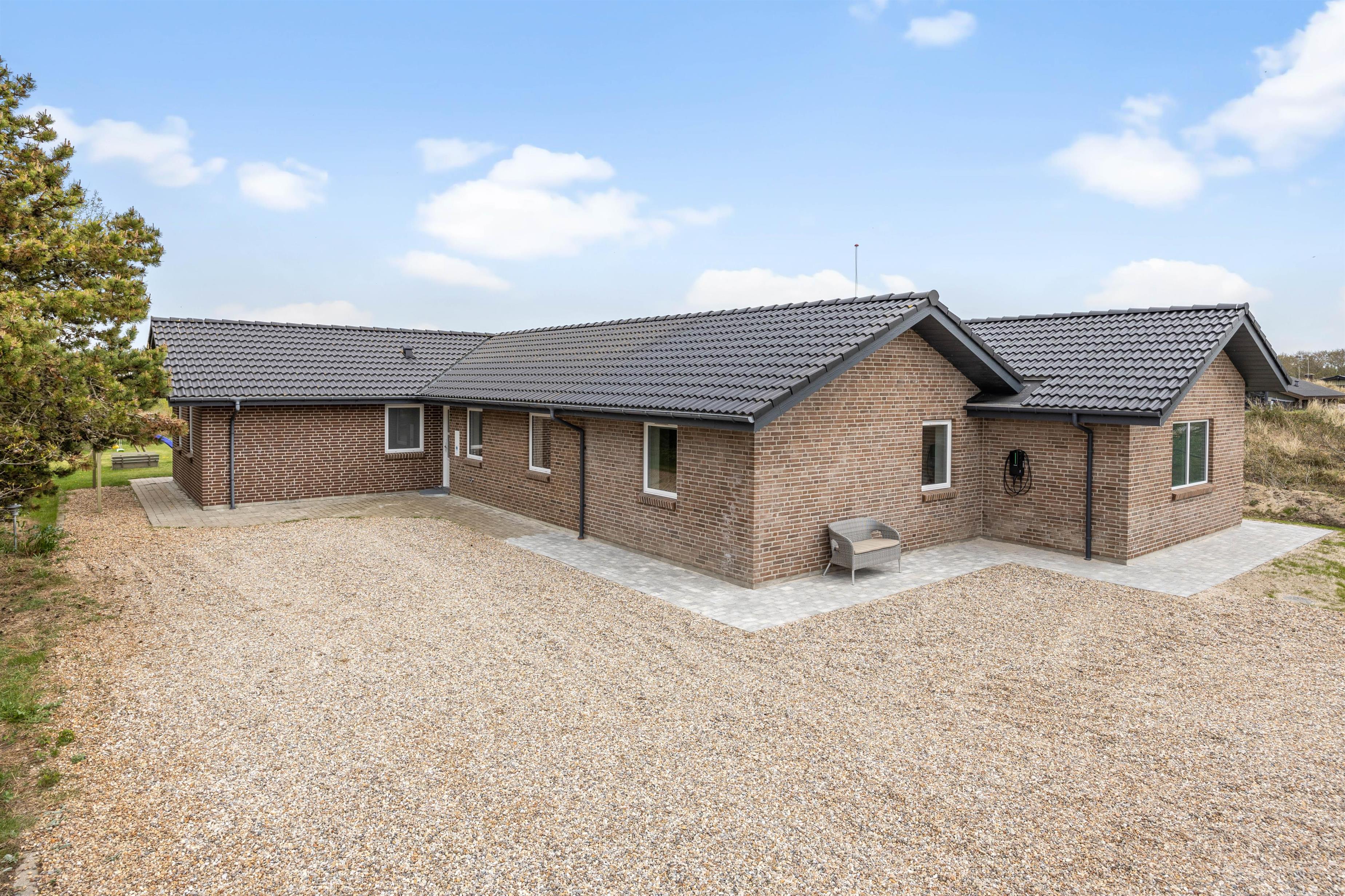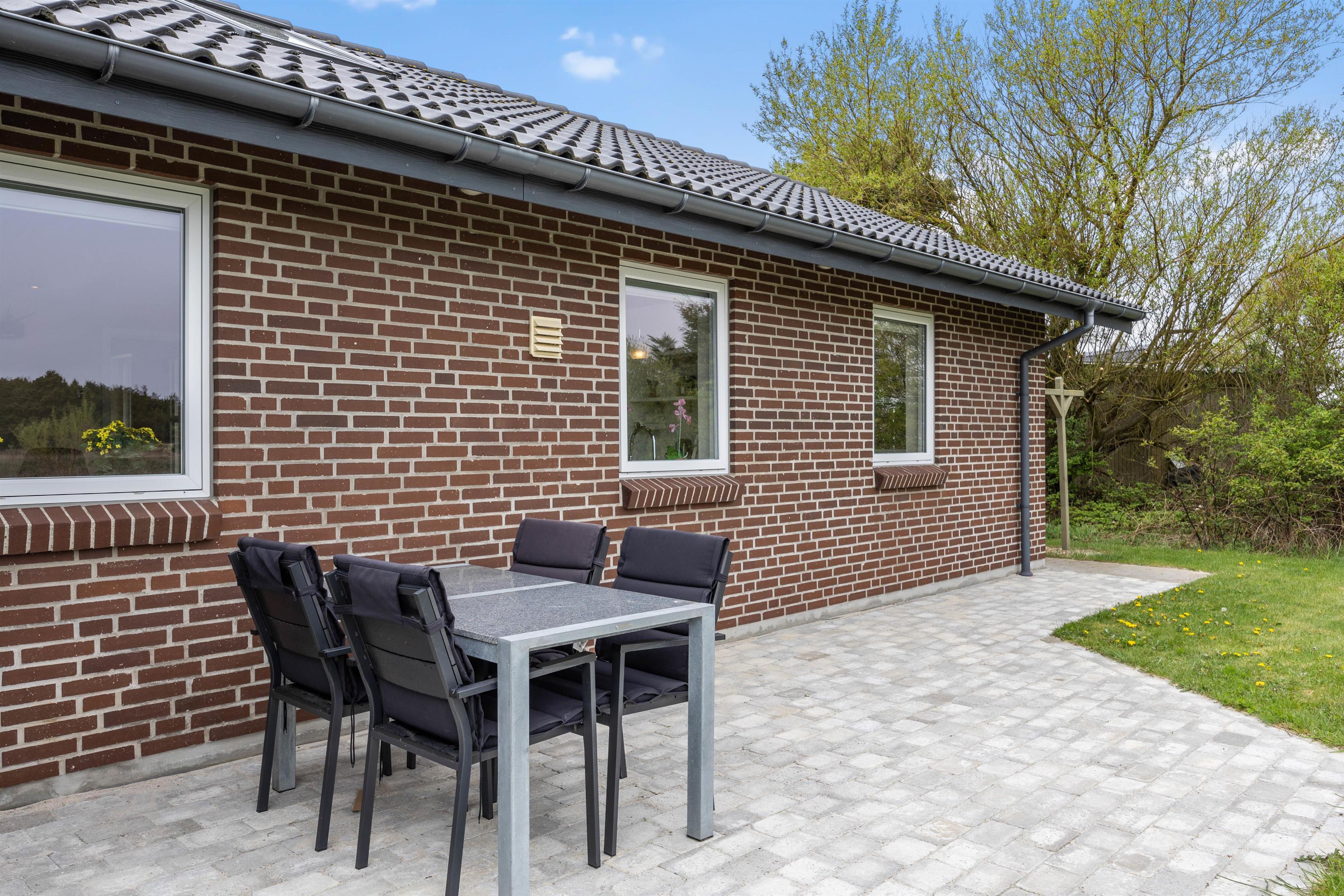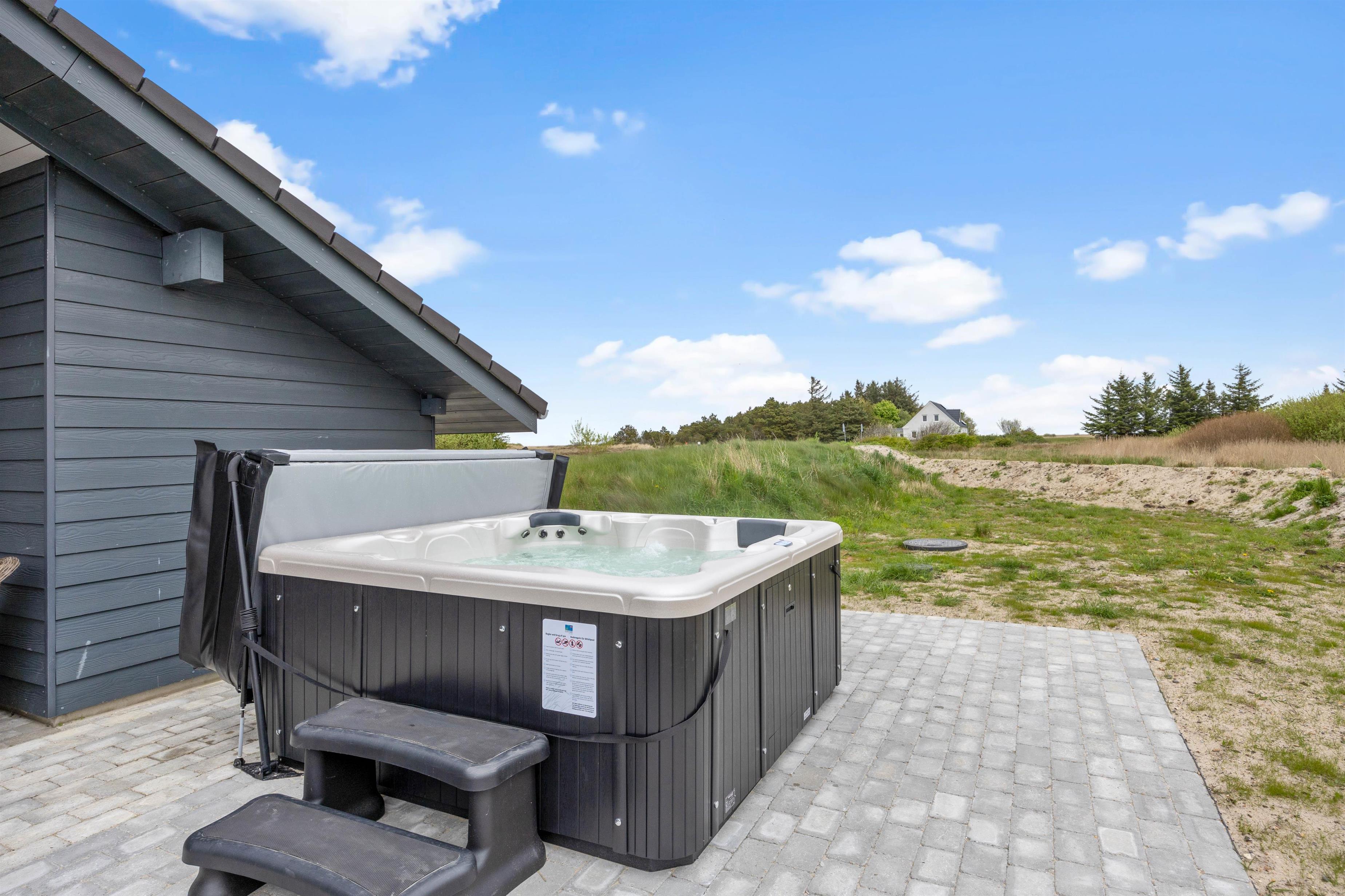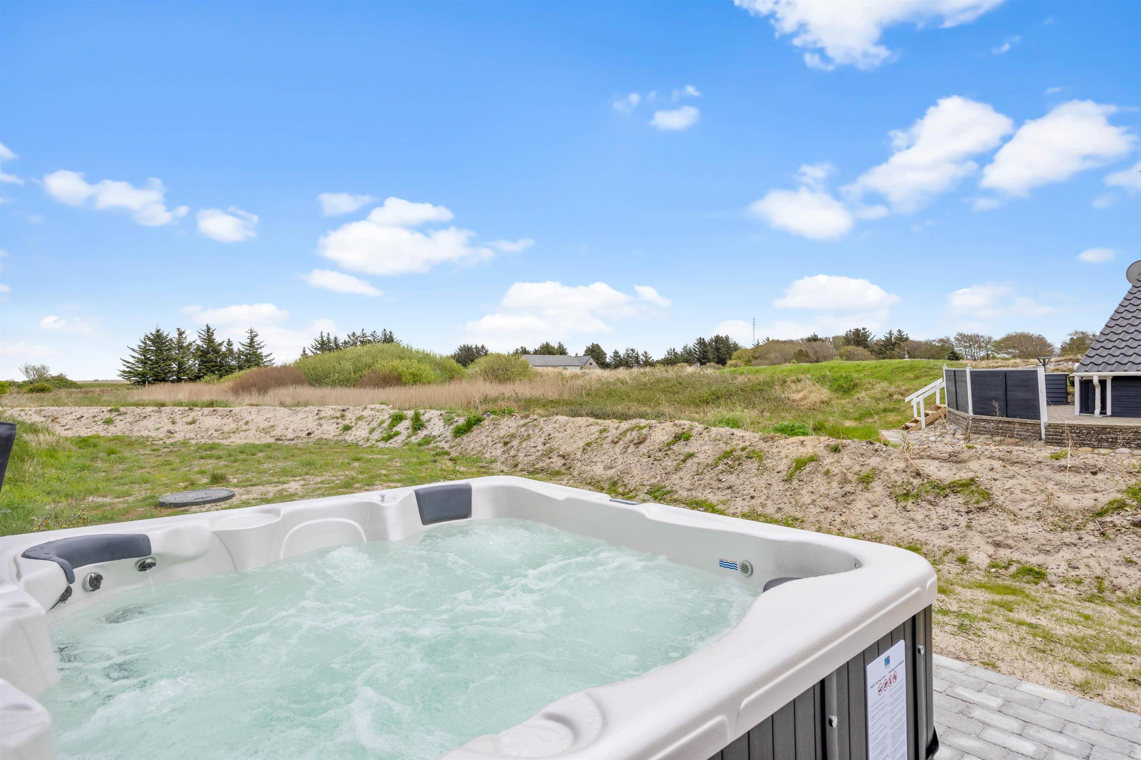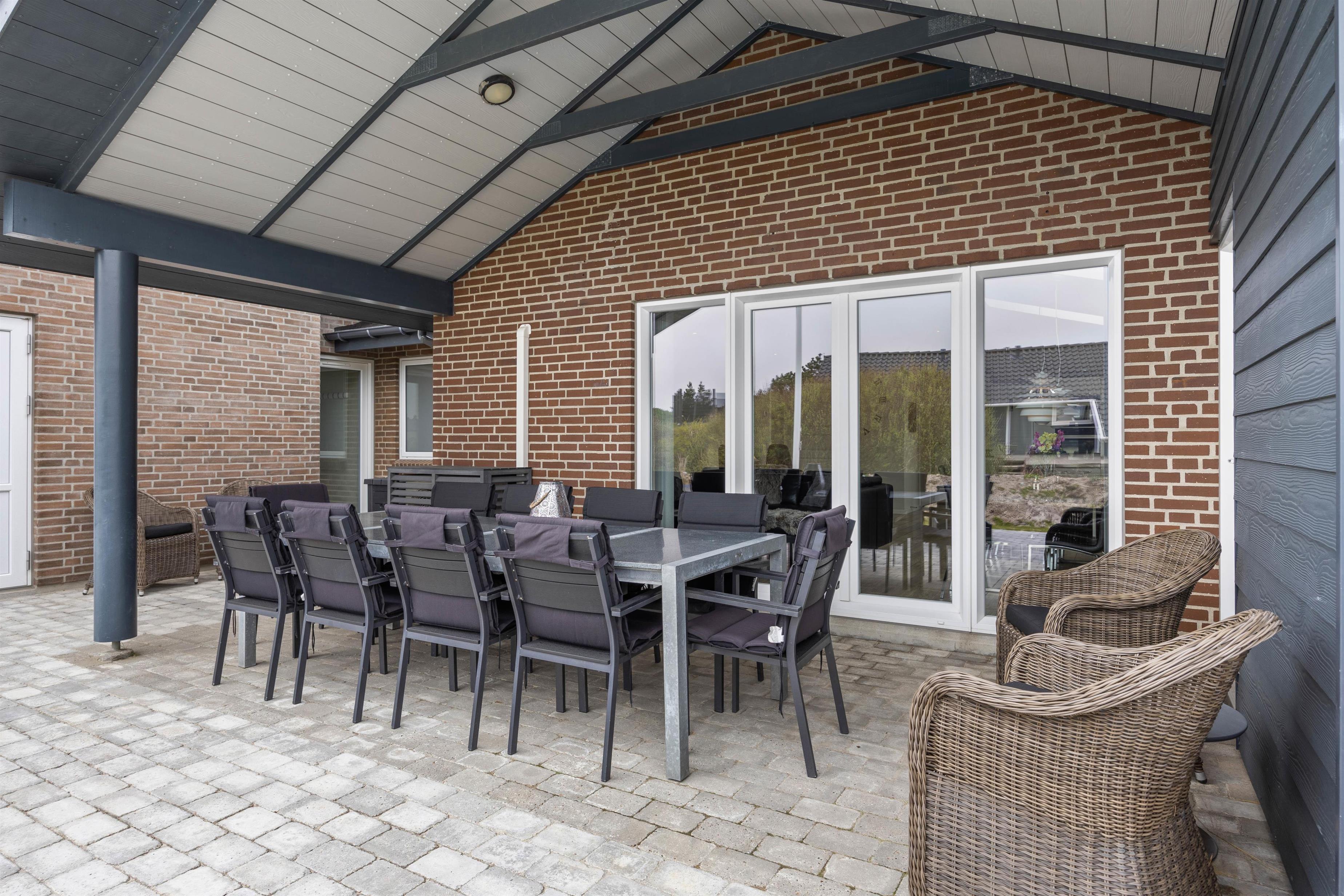 På den delvist overdækkede terrasse kan I lave en BBQ-aften på grillen, nyde måltidet sammen, gå en lang tur langs den kilometerlange Vesterhavsstrand og komme tilbage og nyde en kølig drink i udespaen, imens solen går ned over klitterne.
