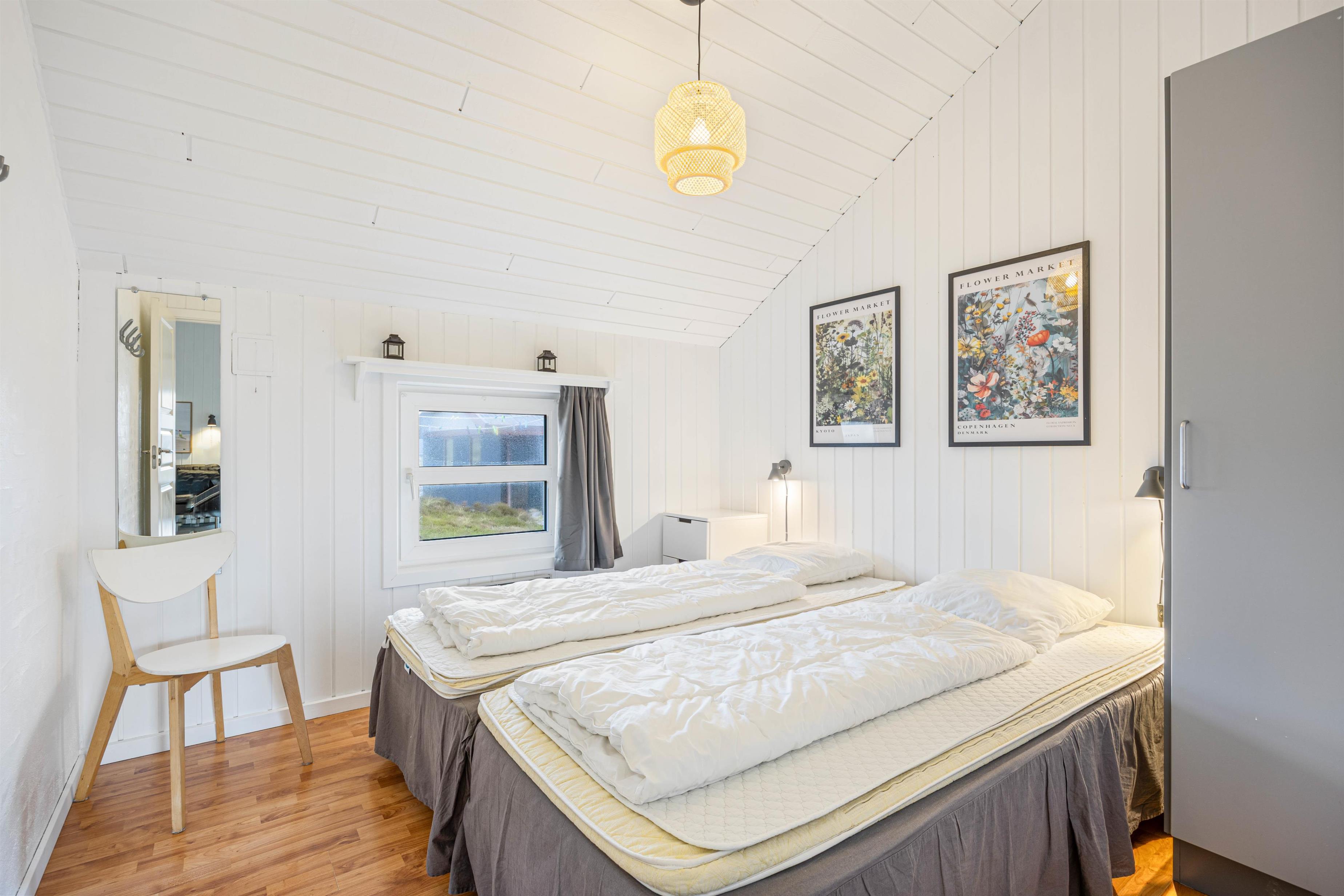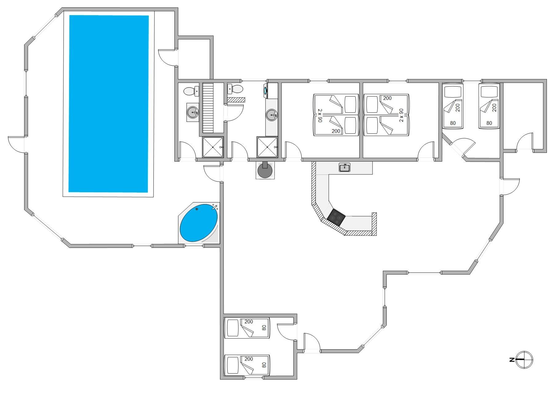 Sommerhusets 8 sovepladser fordeler sig på 4 gode værelser. Desuden er der 2 badeværelser i feriehuset, hvor af det ene er indrettet med en fin sauna. Det andet badeværelse ligger ved poolrummet, som udover pool også byder på et lækkert spabad. Der er gulvvarme på begge badeværelser. I feriehuset er der både vaskemaskine og tørretumbler, så I kan have friske håndklæder efter en feriedag hjemme i poolen.
