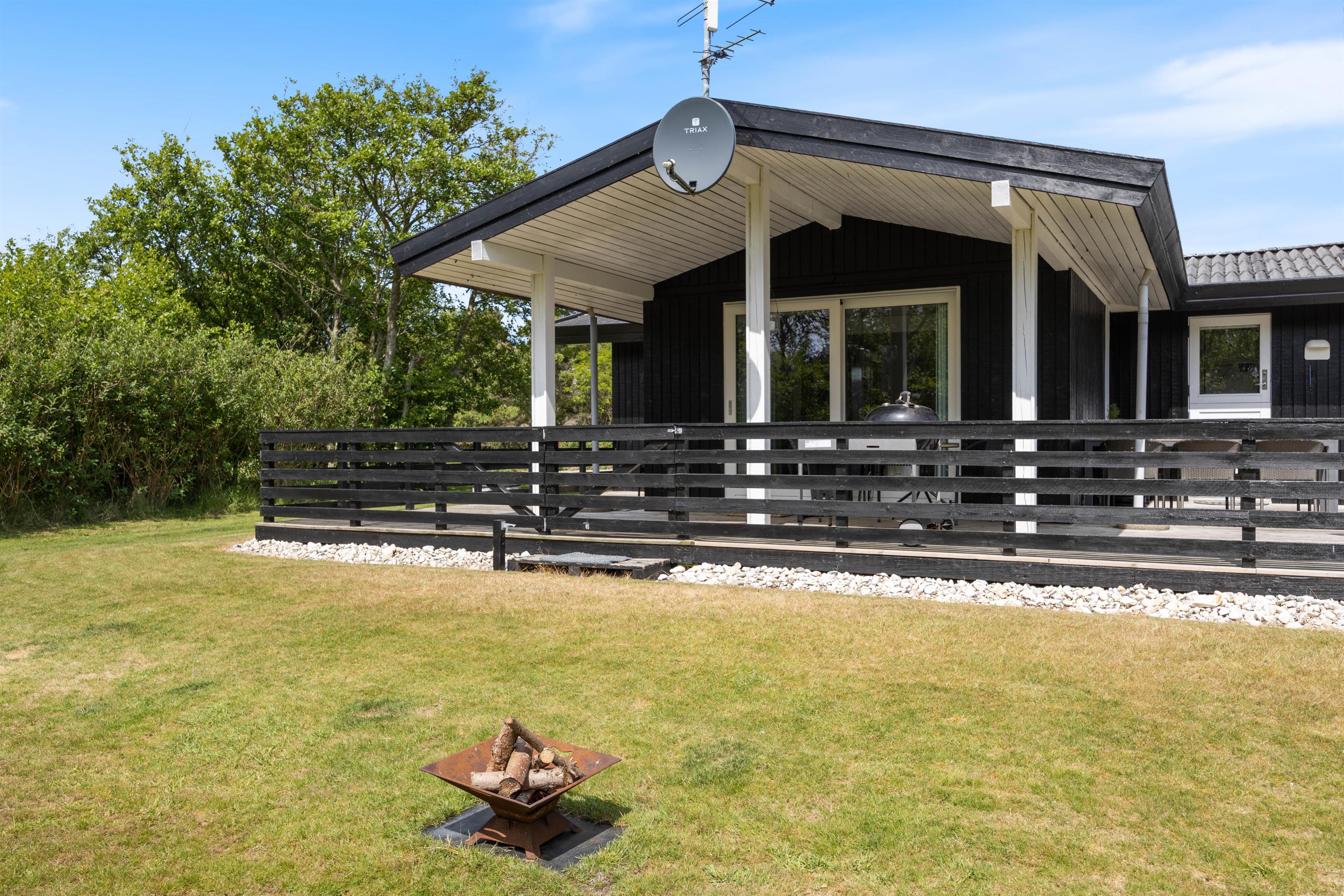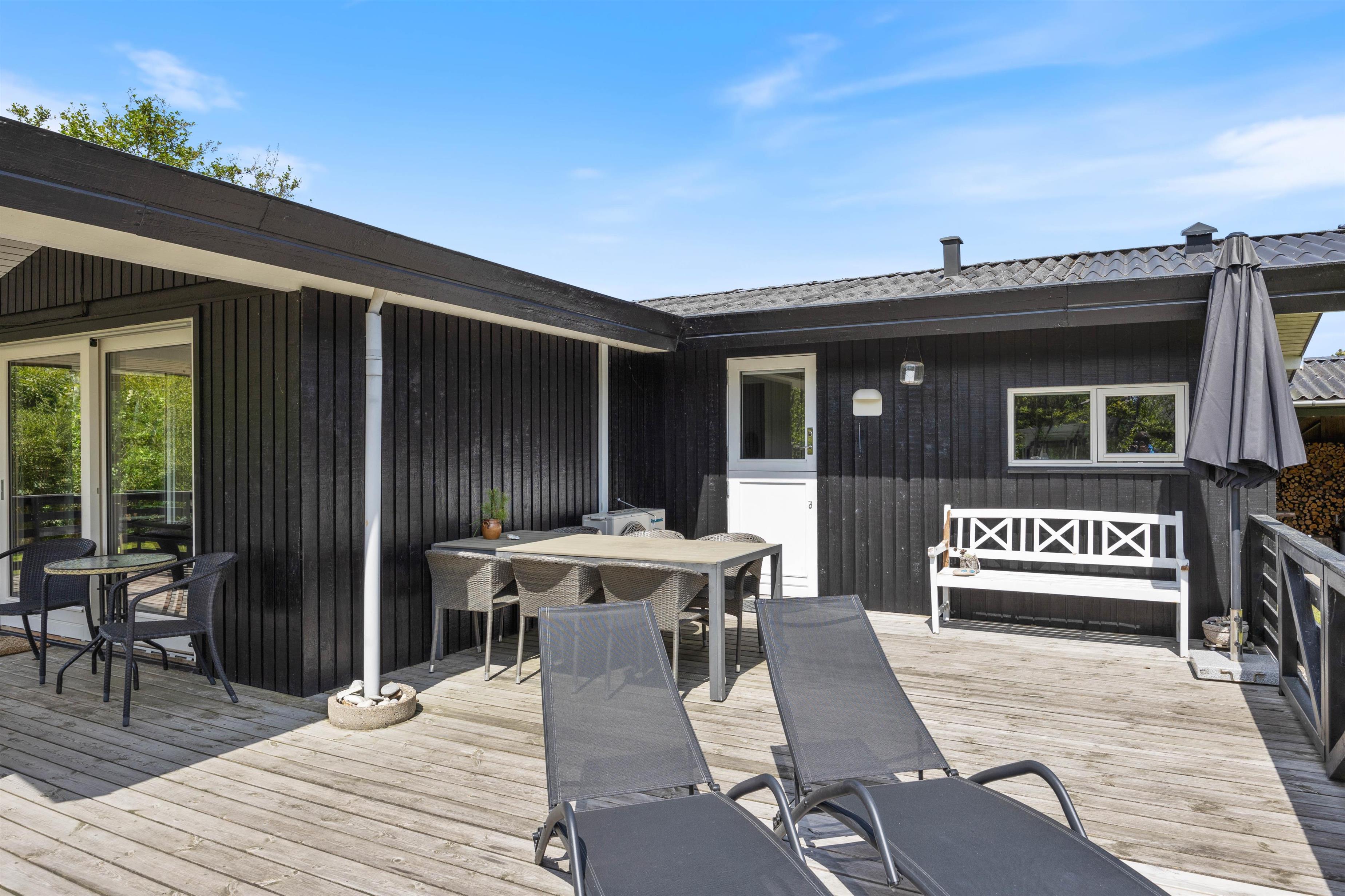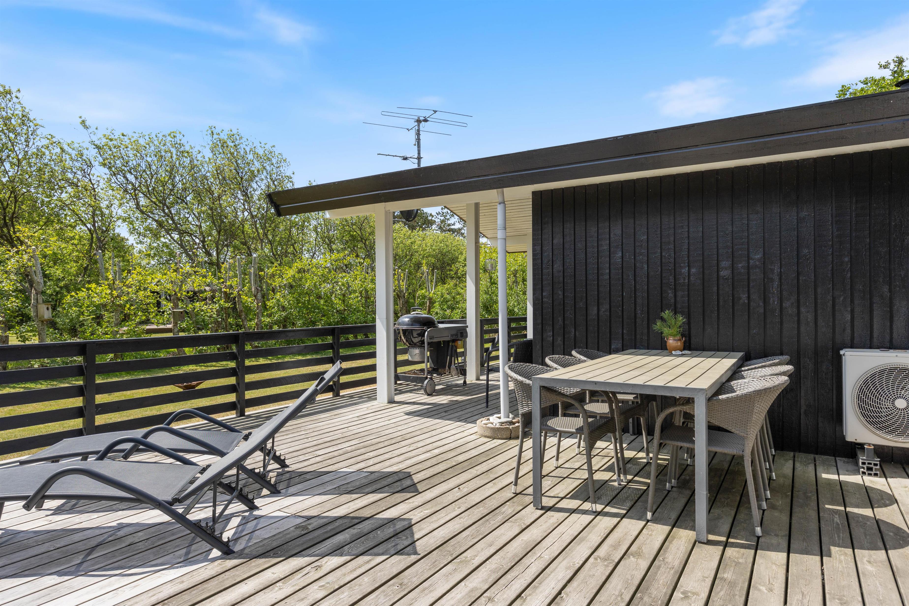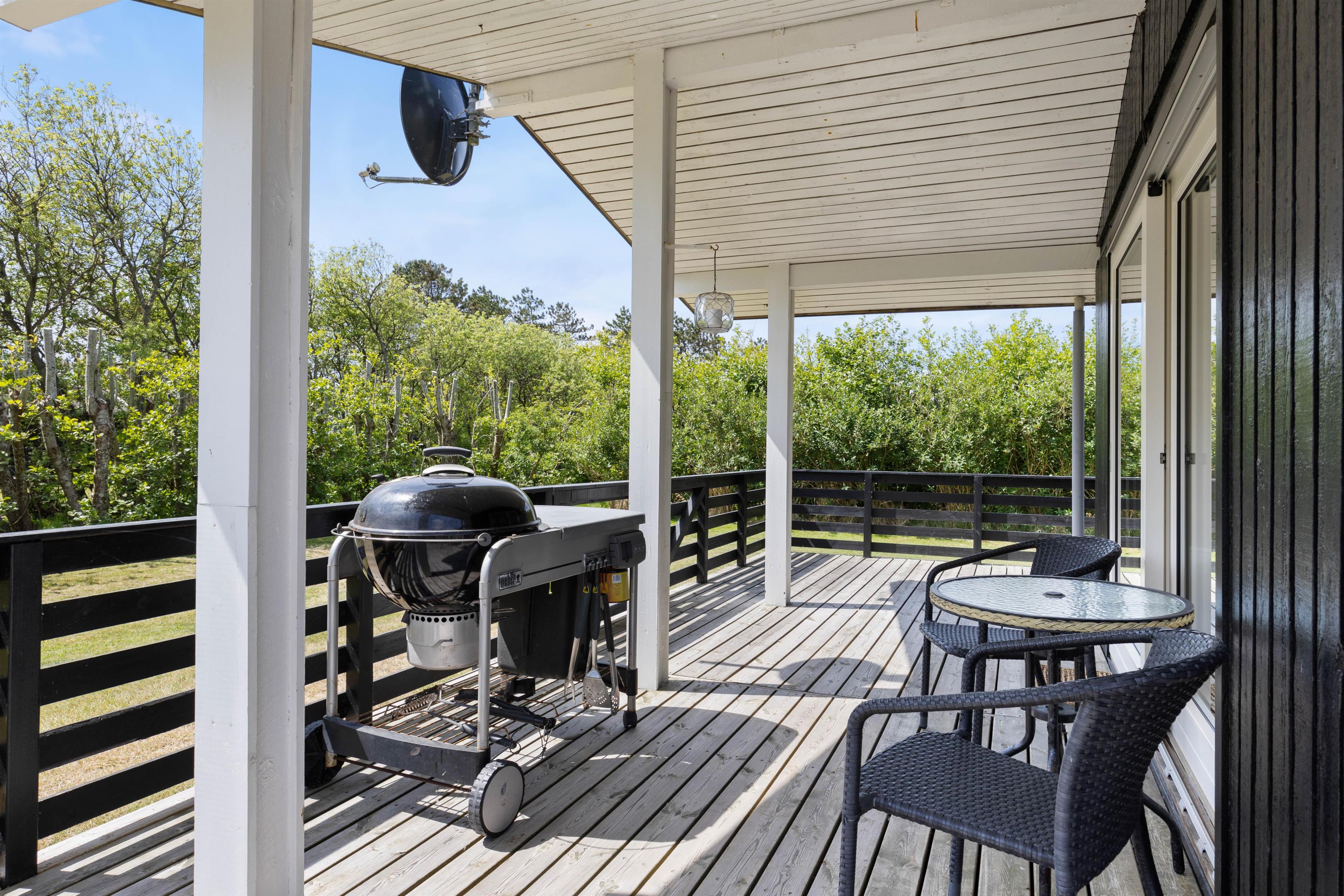 Feriehuset har en lukket, rigtig dejlig og flot terrasse, der ligger både øst, syd og vest for feriehuset. Herfra kan I nyde solen fra morgen til aften. Og I kan let finde læ, hvis sommerbrisen bliver for kølig, eller søge ly under halvtaget, hvis der skulle komme lidt sommerregn. Og der er selvfølgelig havemøbler og en grill på terrassen, så I kan sidde ude og nyde måltiderne i det fri.