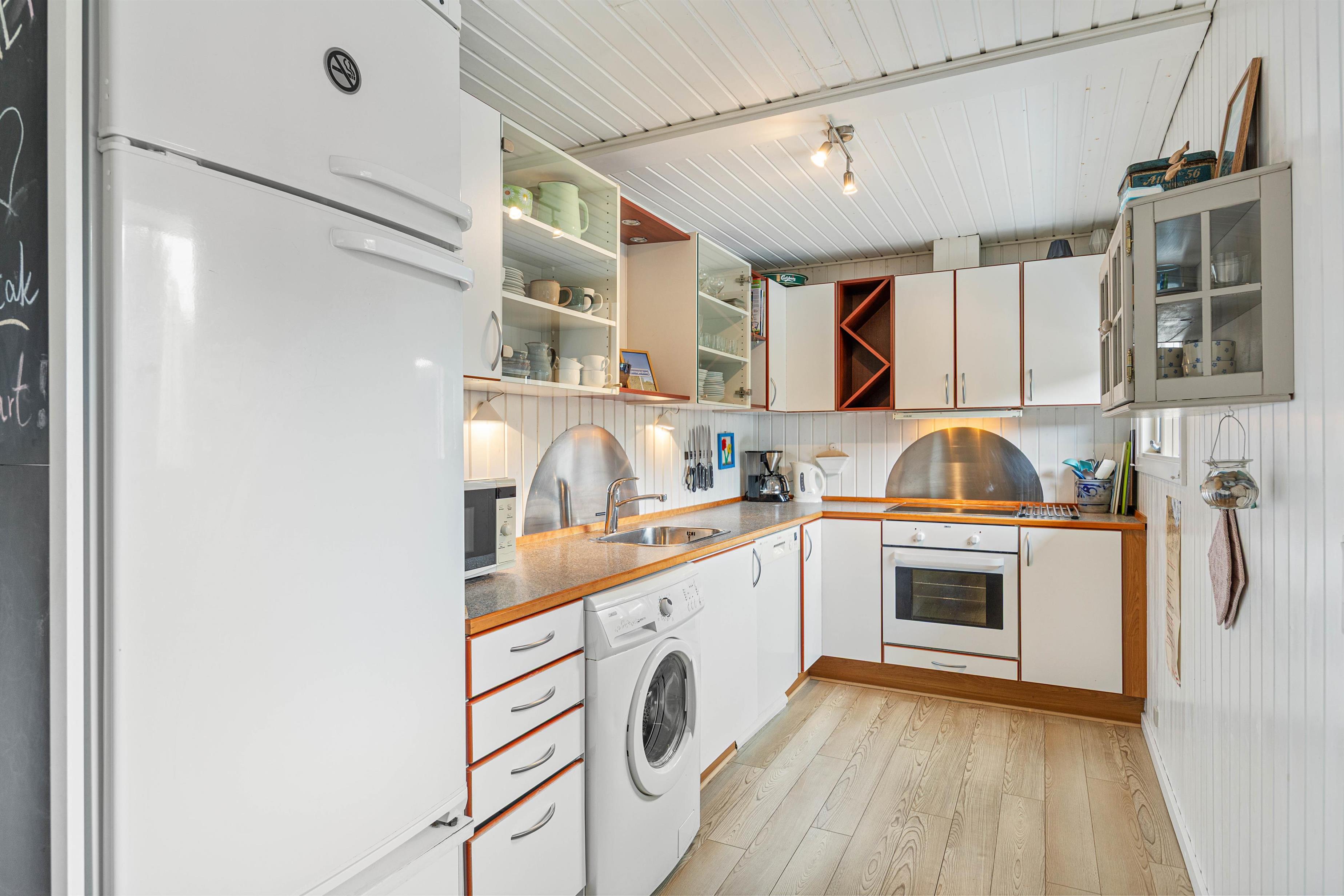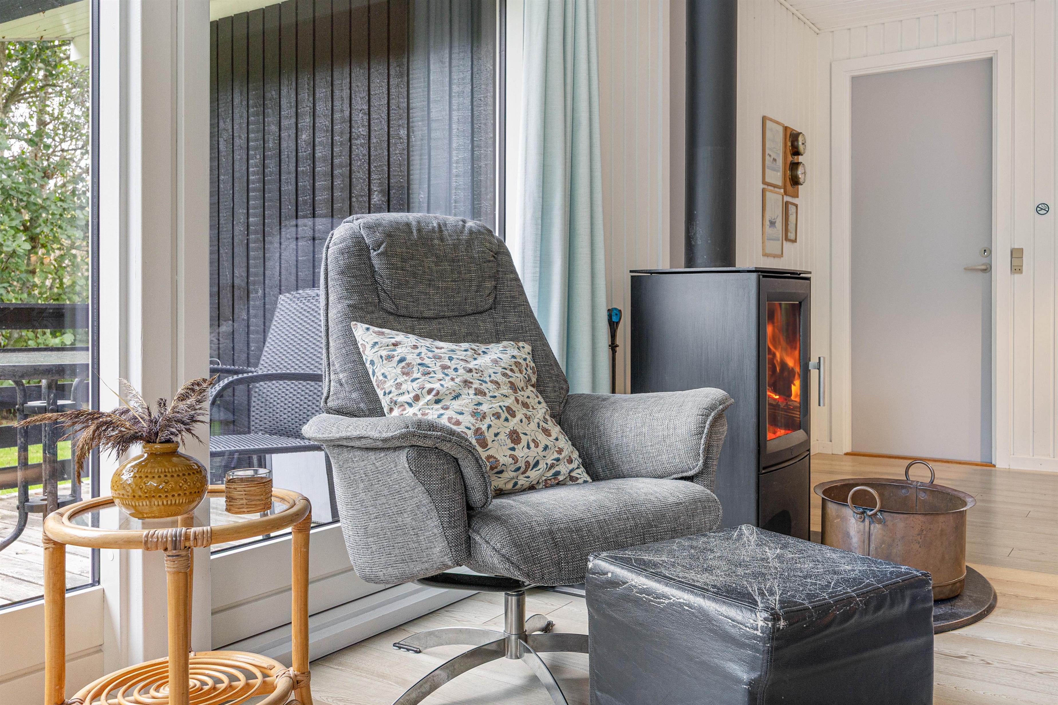 Køkkenet er veludstyret, så I sagtens kan tilberede lækre måltider under ferien, badeværelset er pænt og indbydende med god skabsplads, og stuen med brændeovnen er dejlig rummelig og et godt samlingspunkt, hvor I kan dele dagens ferieoplevelser med hinanden.