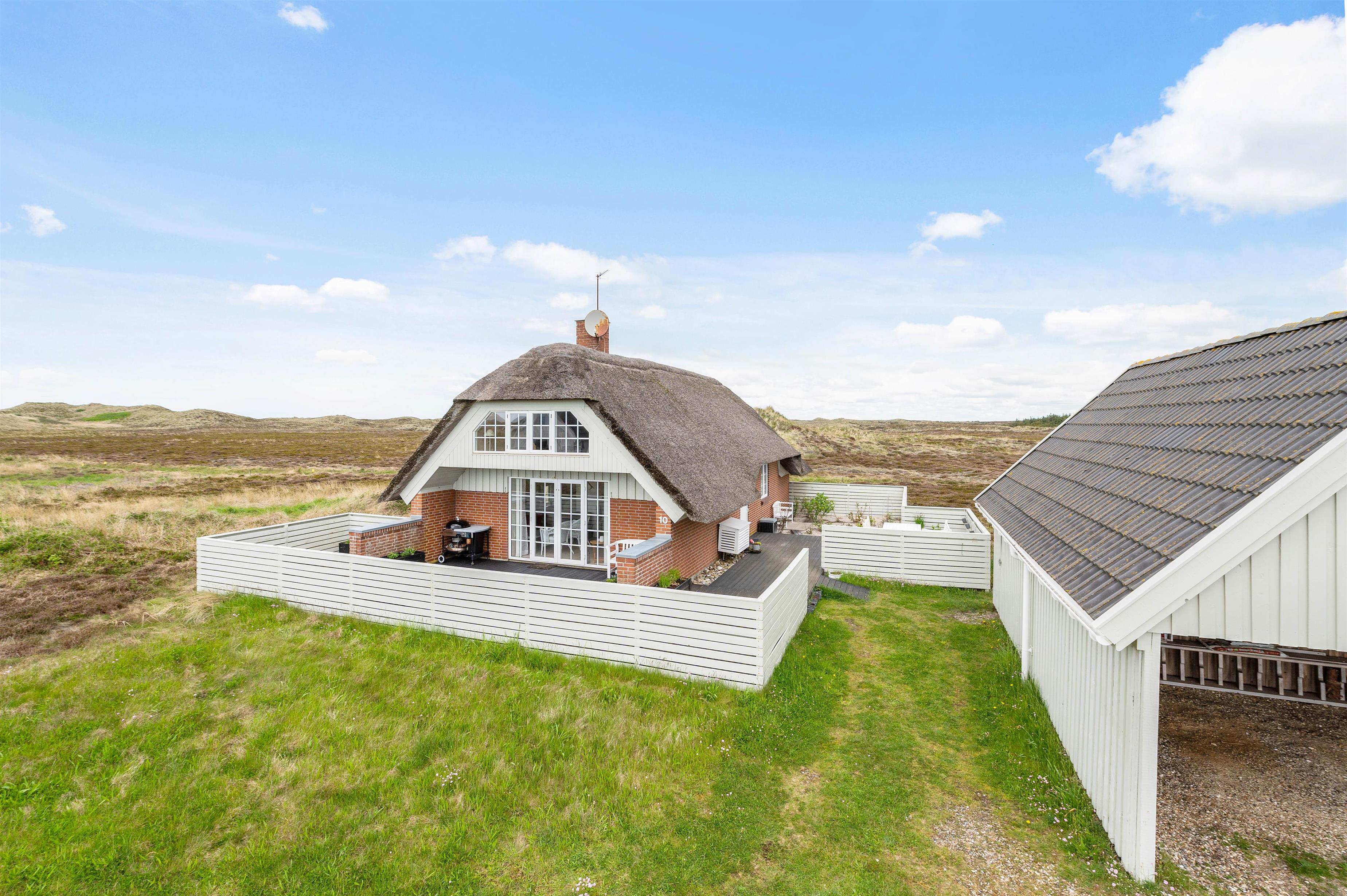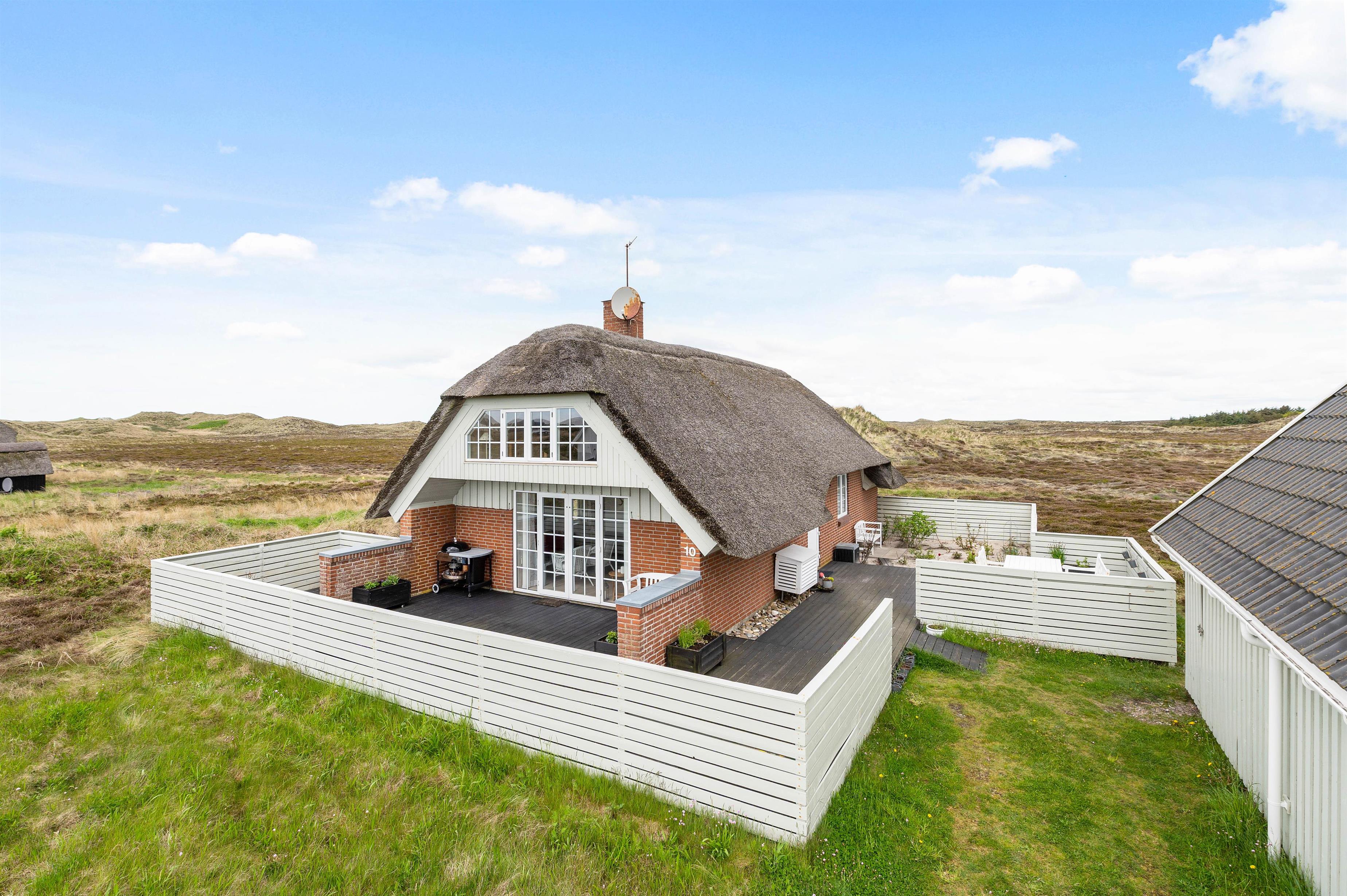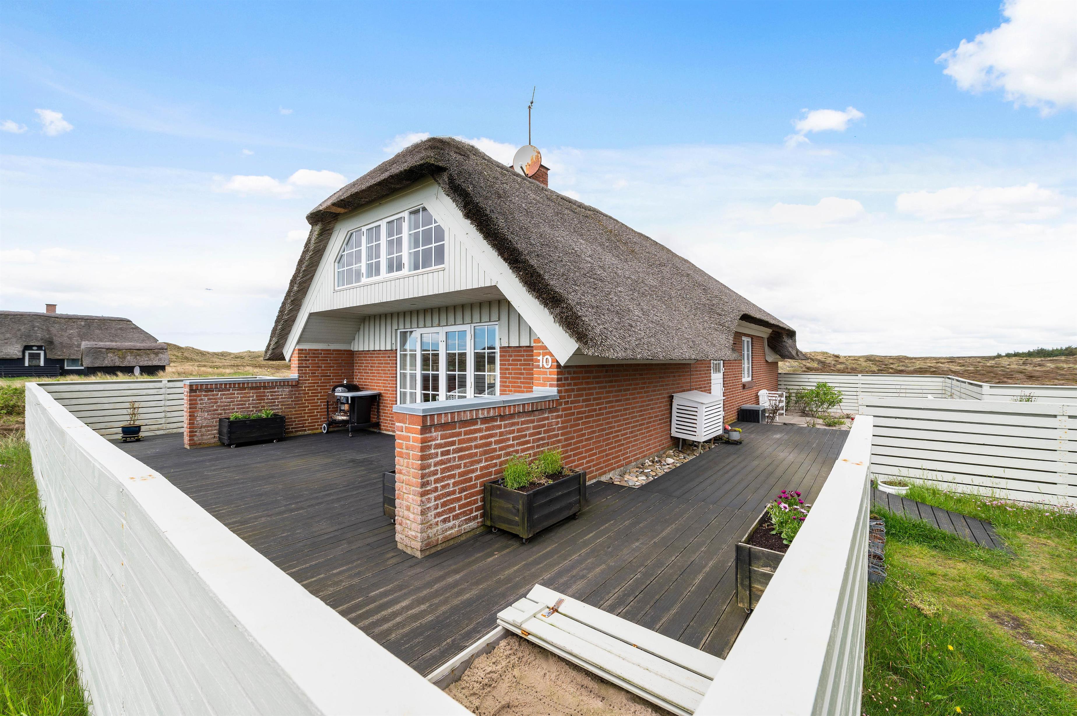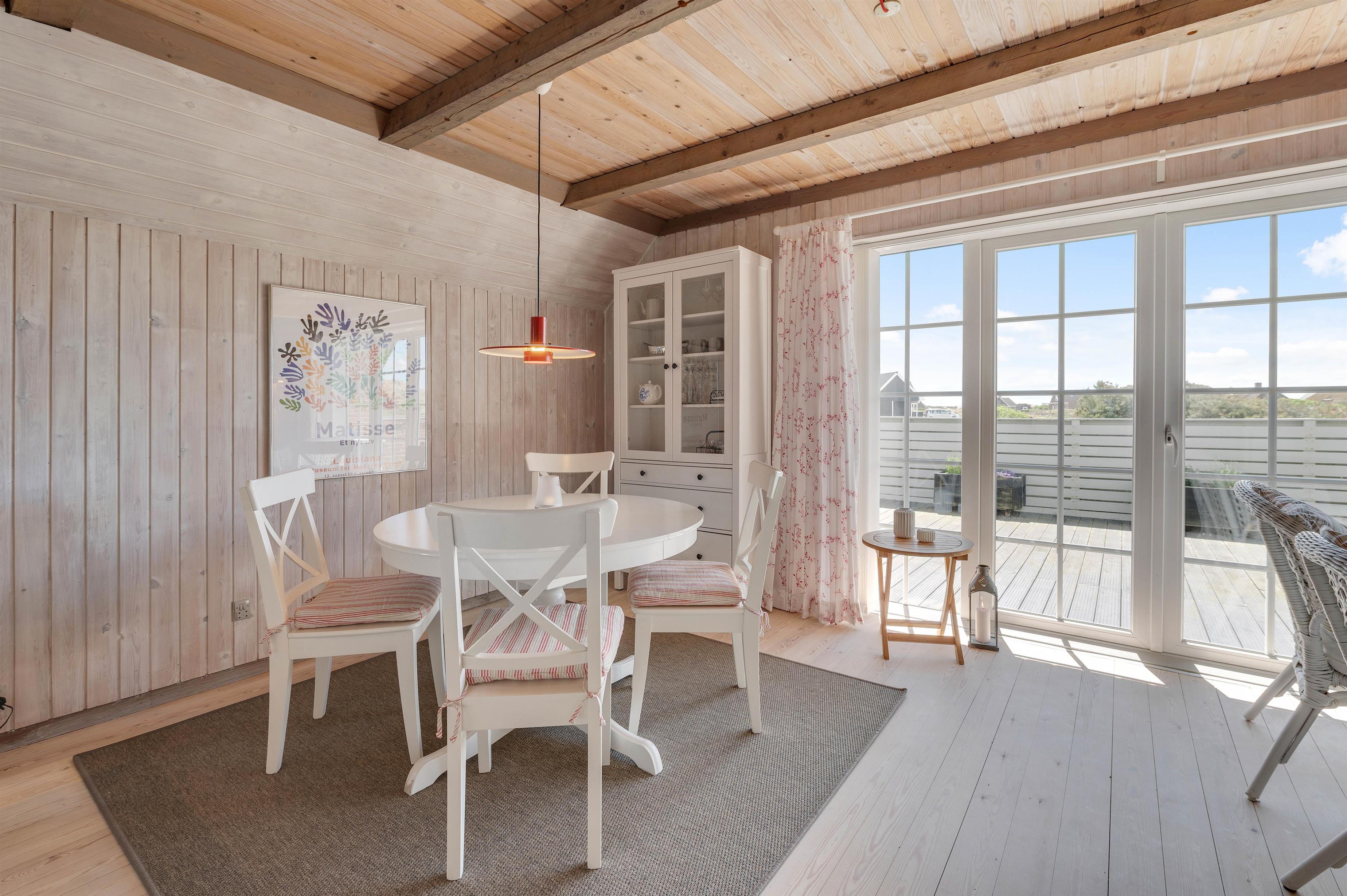 Fra opholdsstuen har I direkte udgang til den sydvendte træterrasse, som er afskærmet. Her kan hele familien samles til lækre grillmåltider med en fantastisk panoramaudsigt til det smukke klitlandskab. Terrassen strækker sig til østsiden af sommerhuset, hvor I har mulighed for at nyde solopgangen med en kop kaffe.
