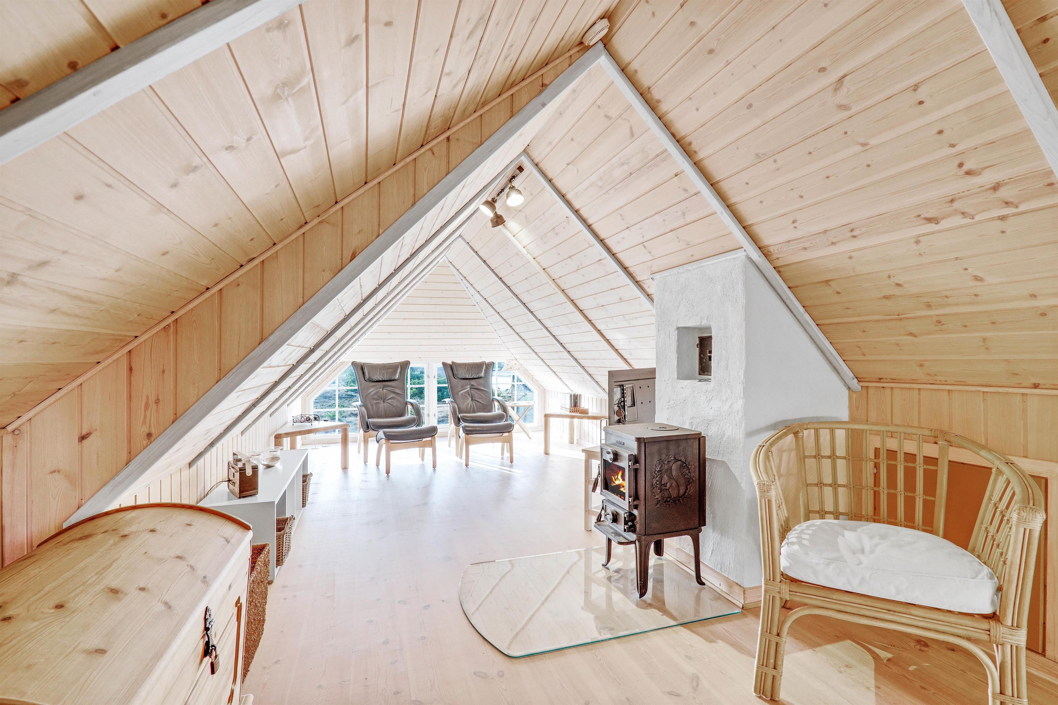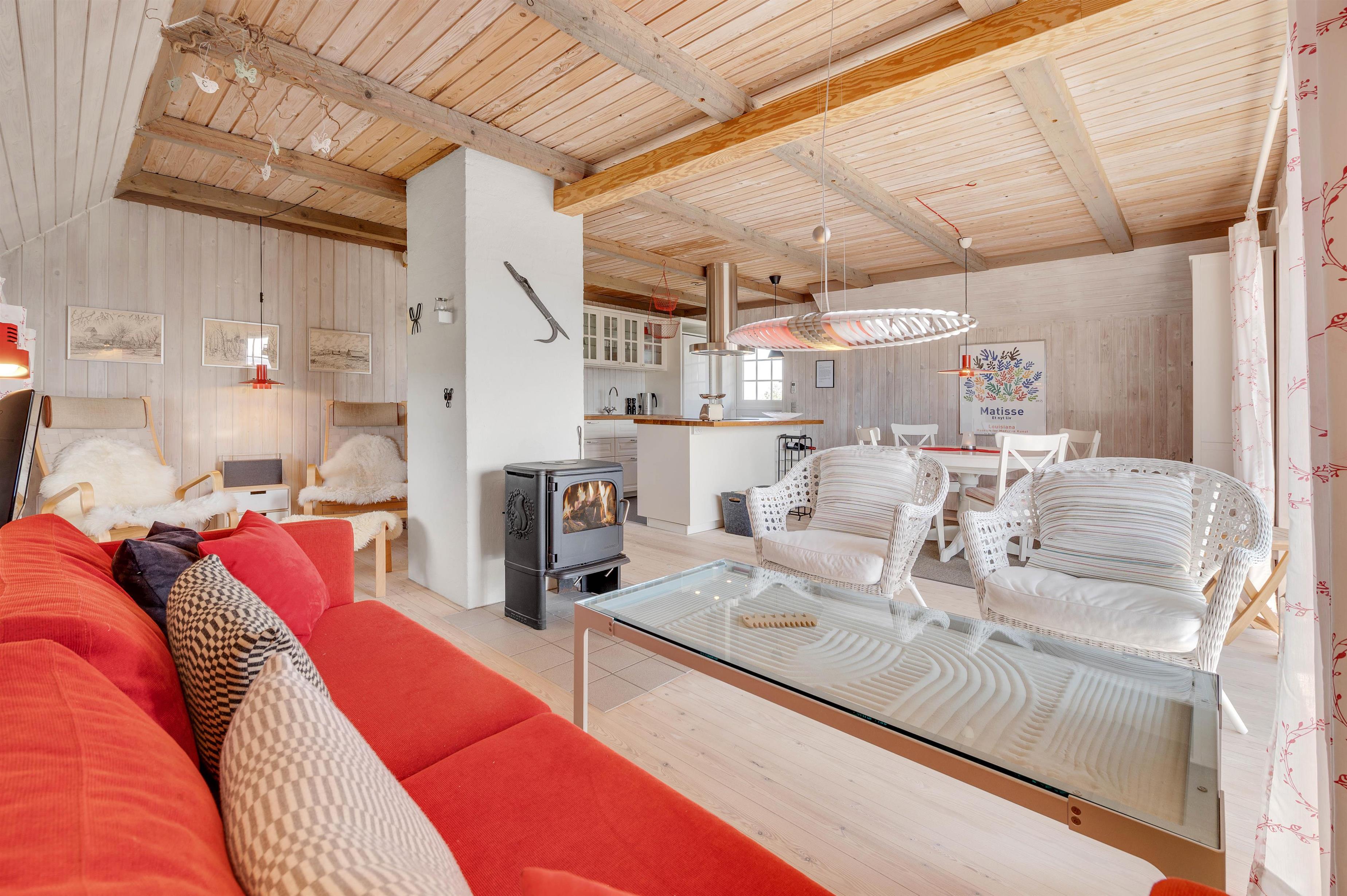 Det rustikke og hyggeligt indrettede opholdsrum indbyder, i kombination med velovervejede detaljer, til ren afslapning for hele familien. Her kan alle samles til hyggelige stunder, og som prikken over i´et sørger brændeovnen for at sprede både varme og ekstra feriestemning.