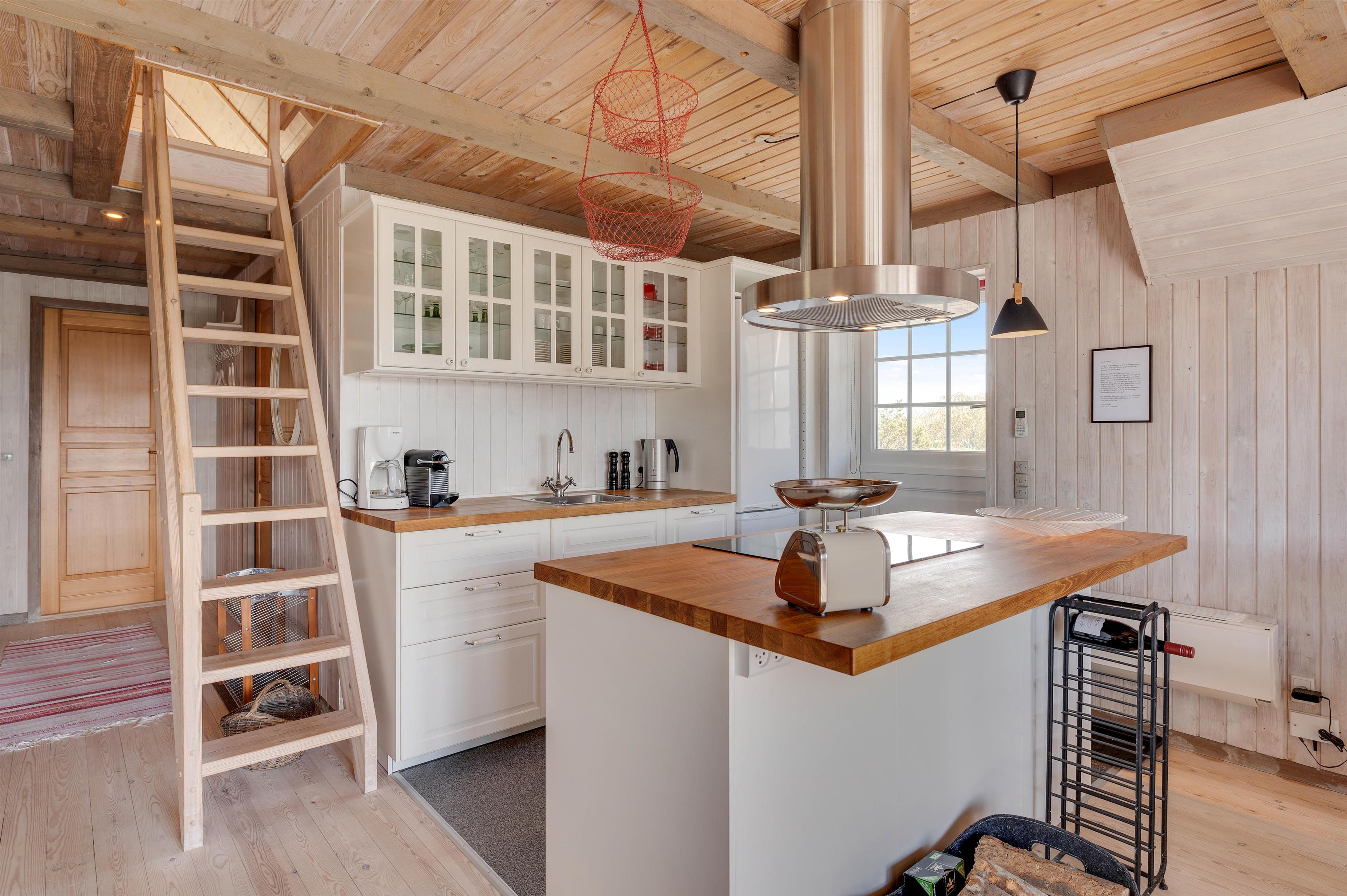 Køkkenet ligger i åben forbindelse med stuen, så familien kan være sammen mest muligt under jeres ferie – også når der skal laves et lækkert måltid i det veludstyrede køkken.
